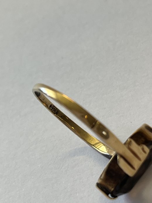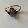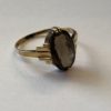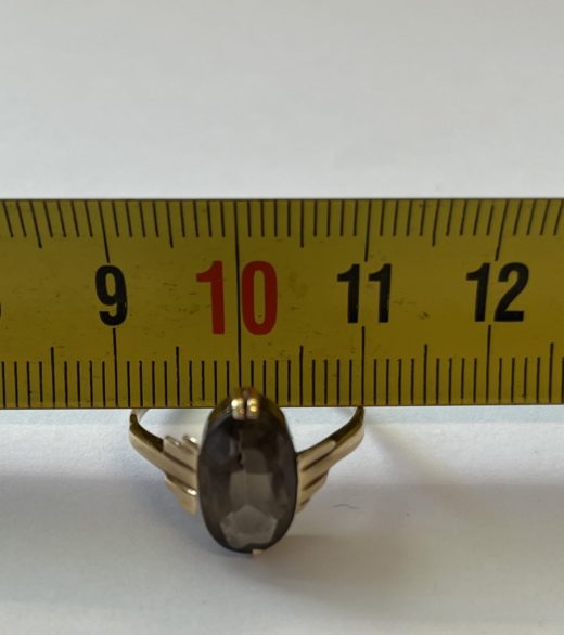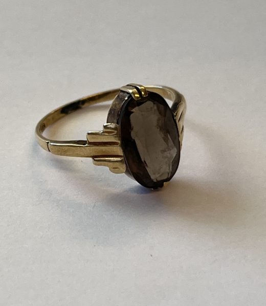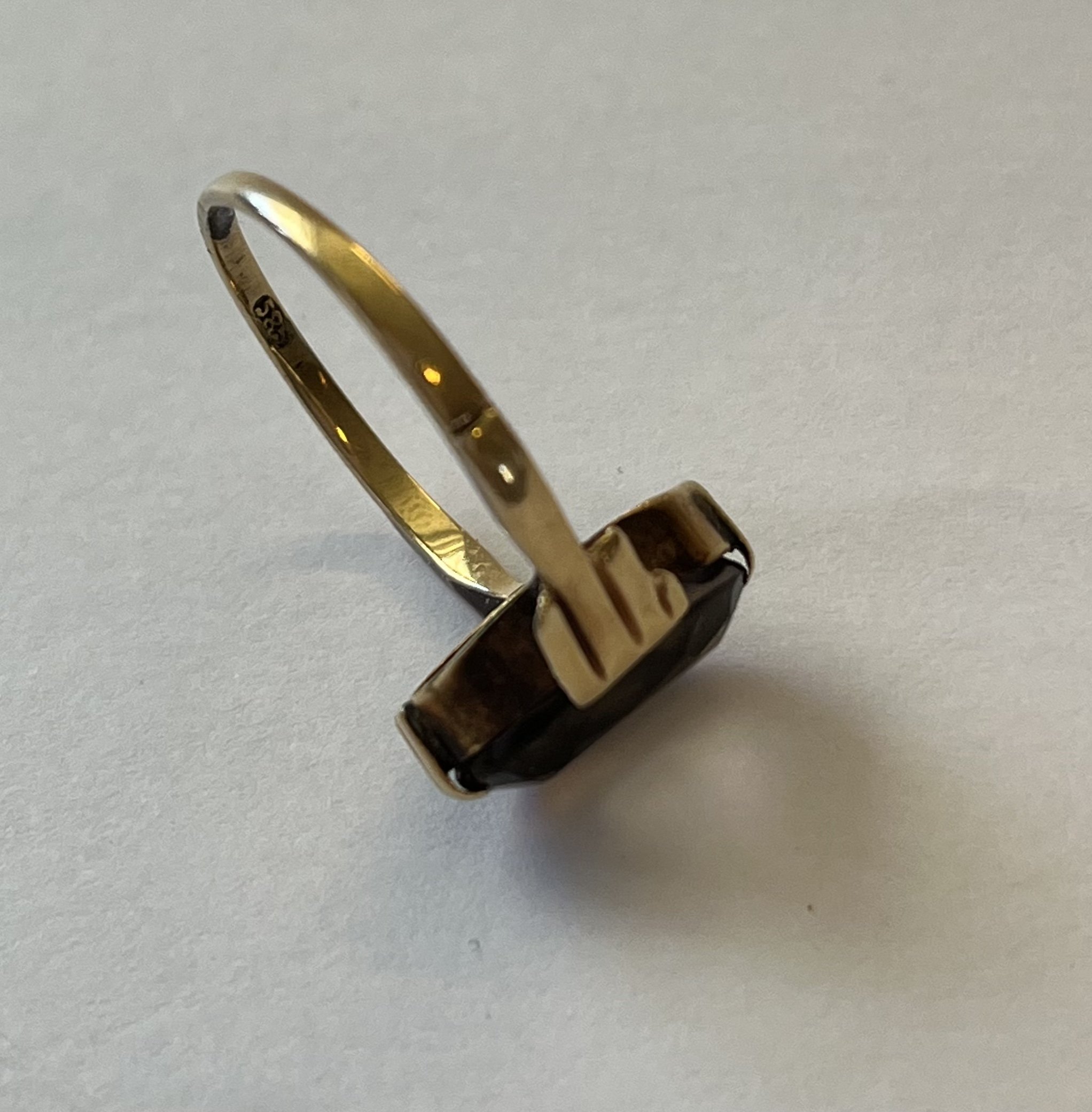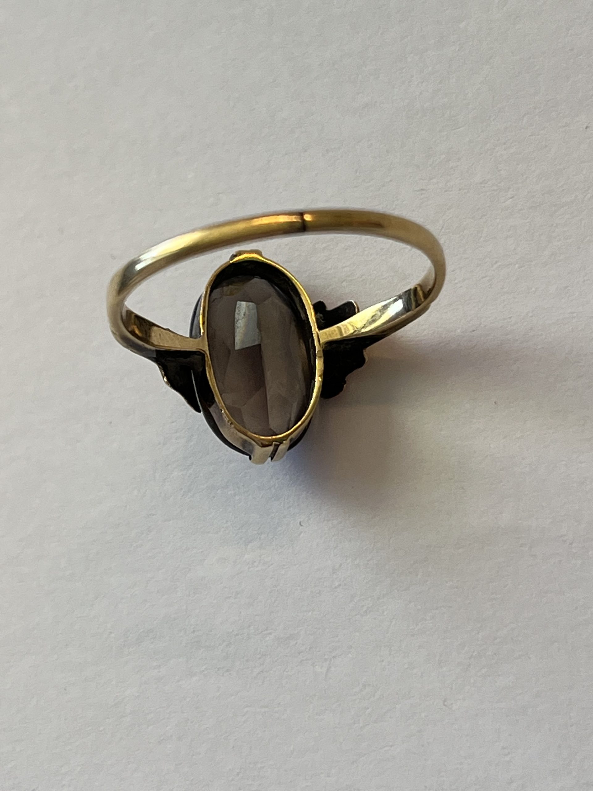 Guldring med brunlig/røgfarvet facetslebet oval sten. Ring stemplet 585.