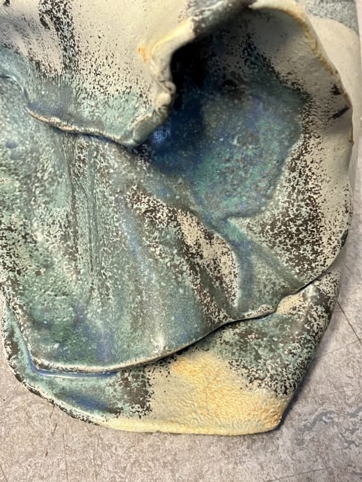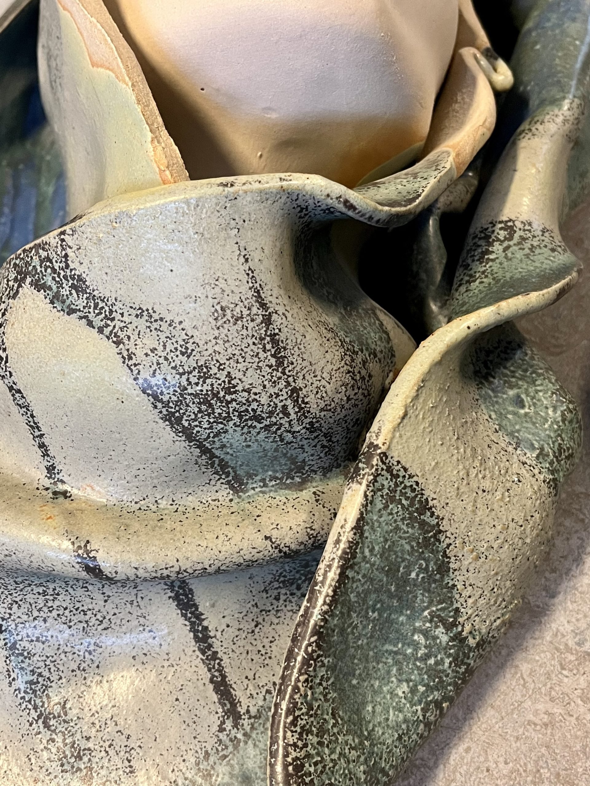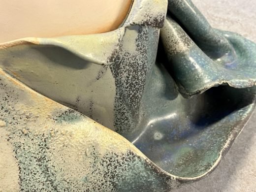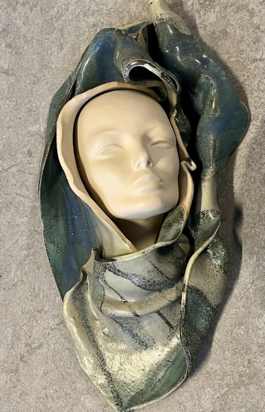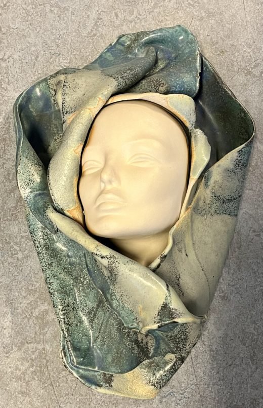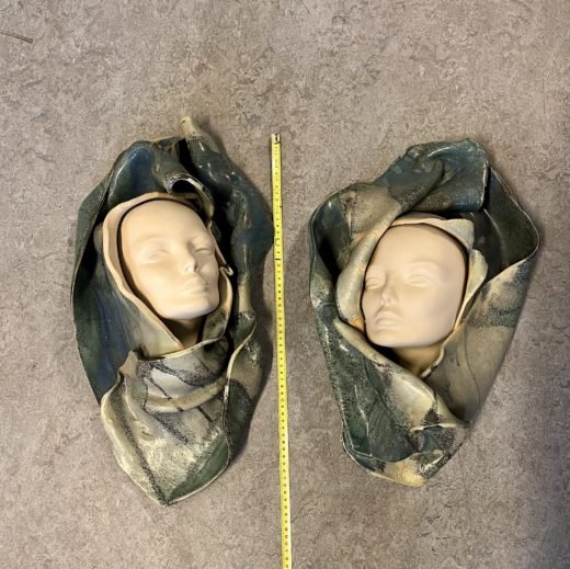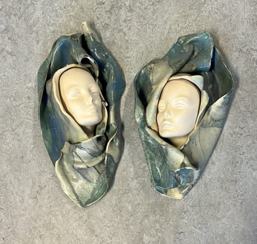 Keramikrelieffer i blågrøn/grå nuancer. H: 57 cm- B: 30 cm.