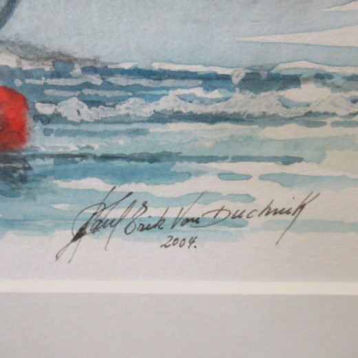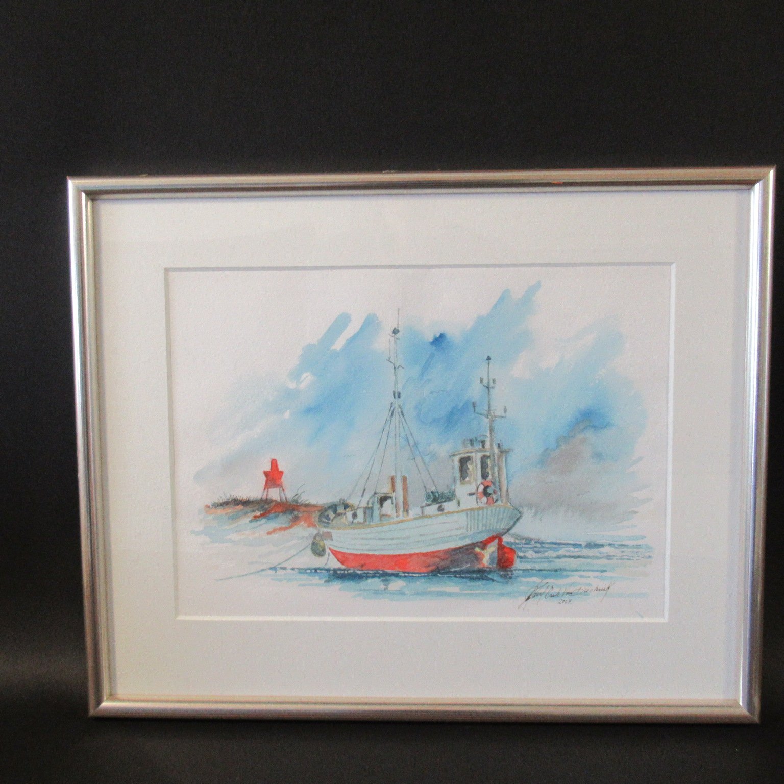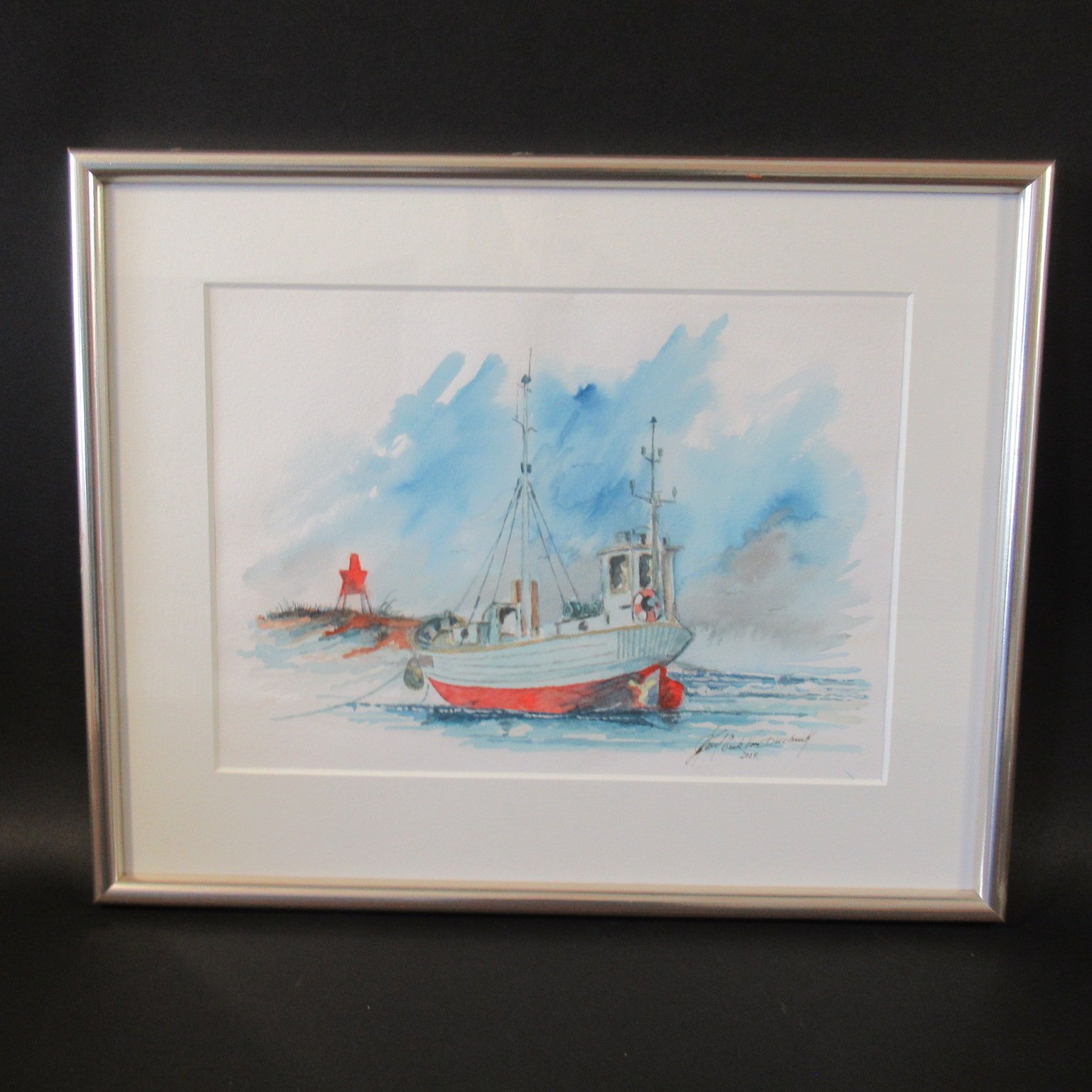 Smuk akvarel af fiskekutter ved Løkken strand, akvarellen er malet af Karl Erik von Duchnik.