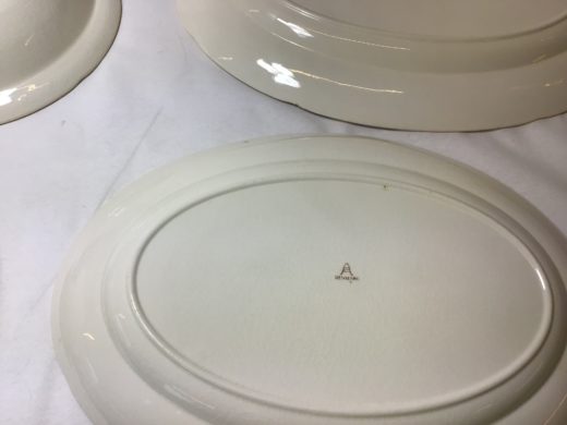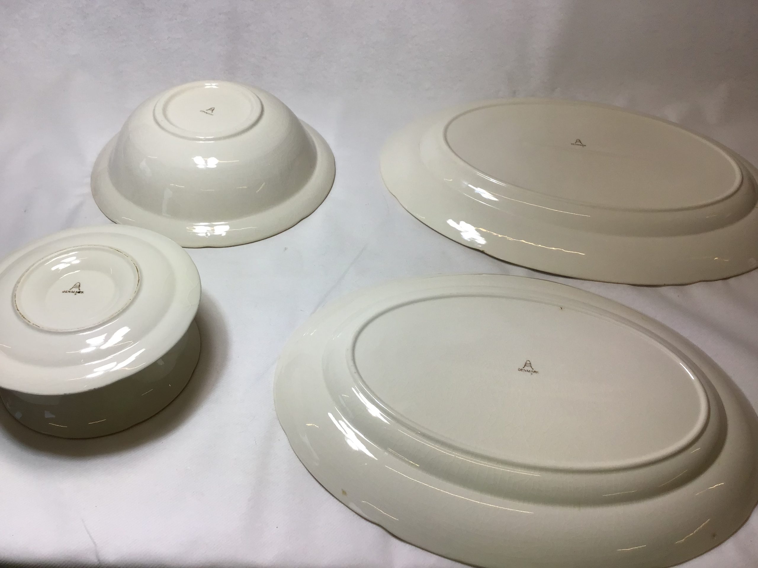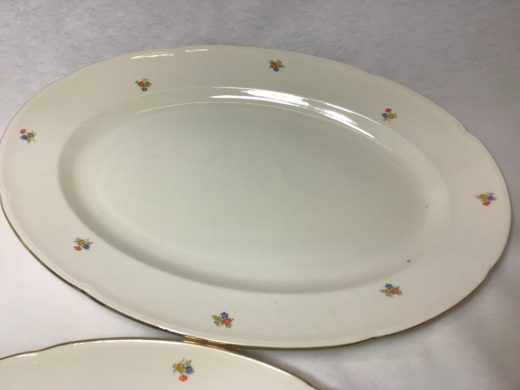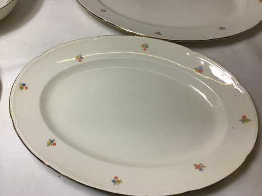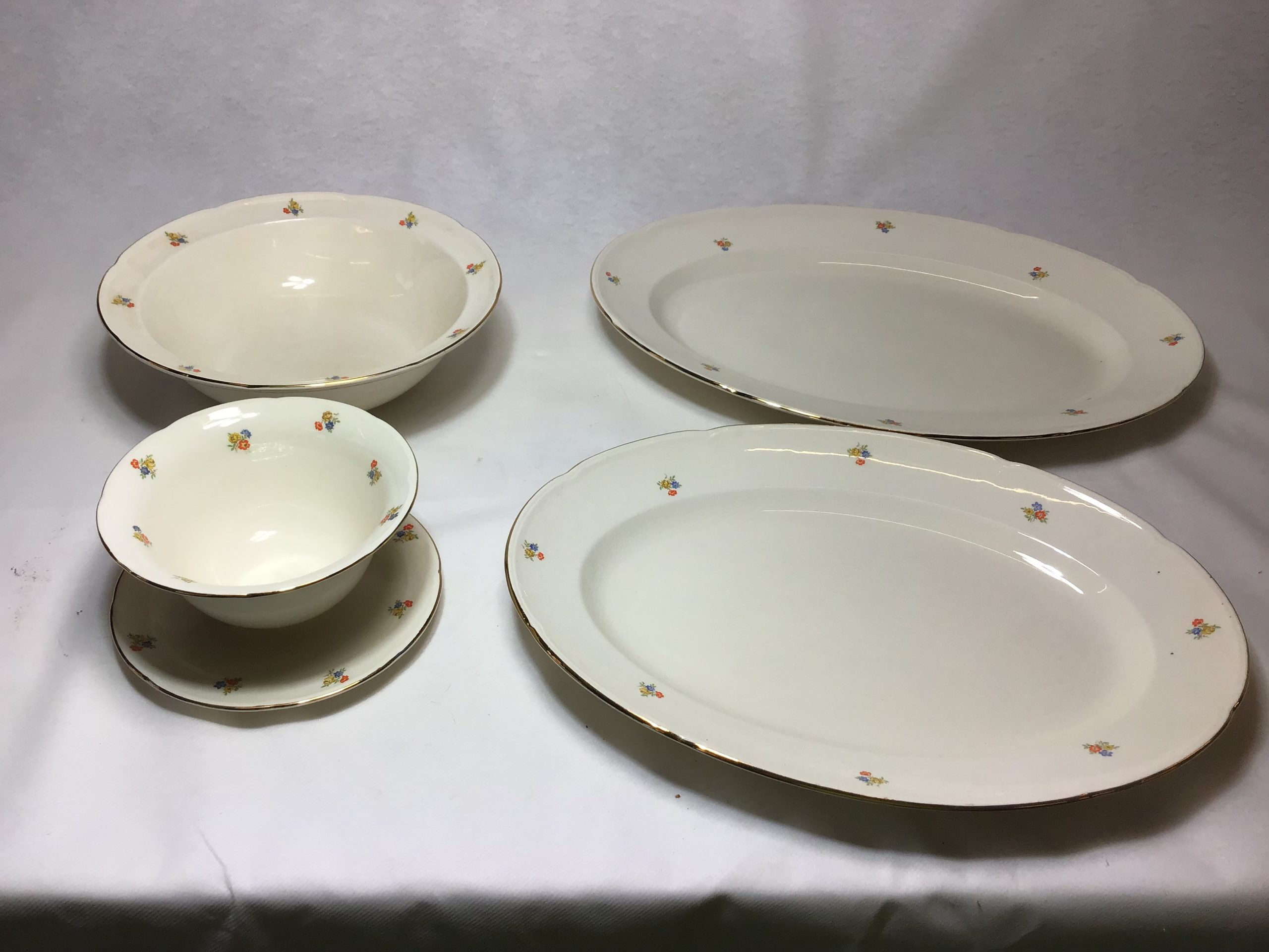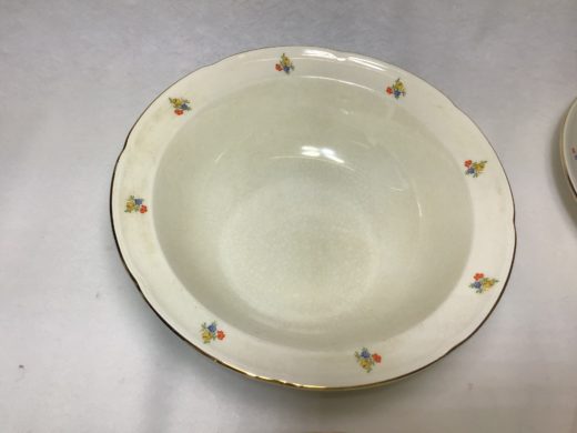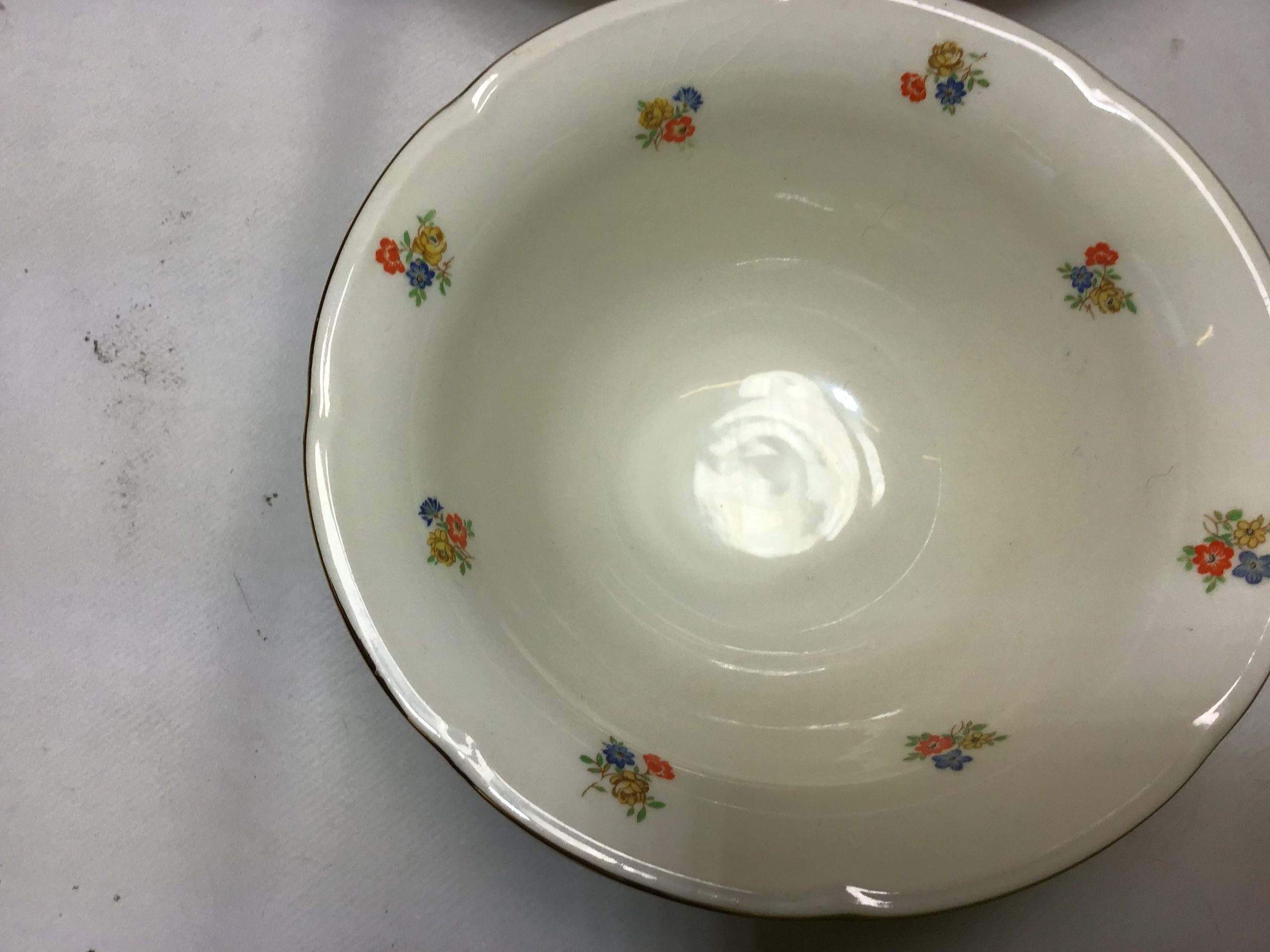 2 fade og 2 skåle, den ene med underskål. Med små blomster i rød blå og gul. Blandet stand.