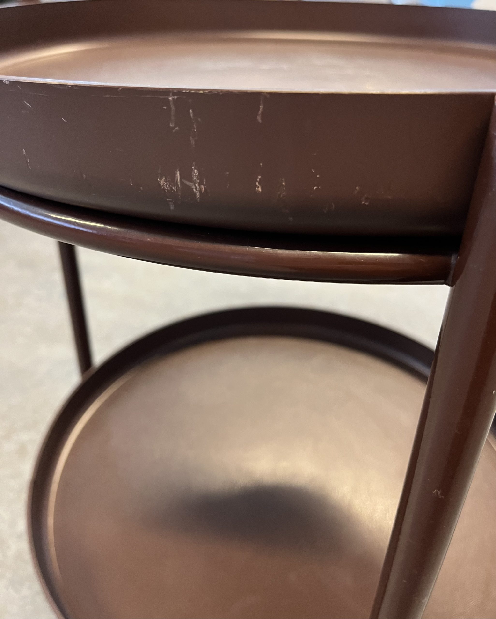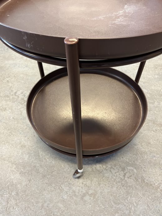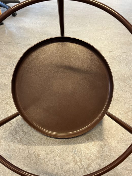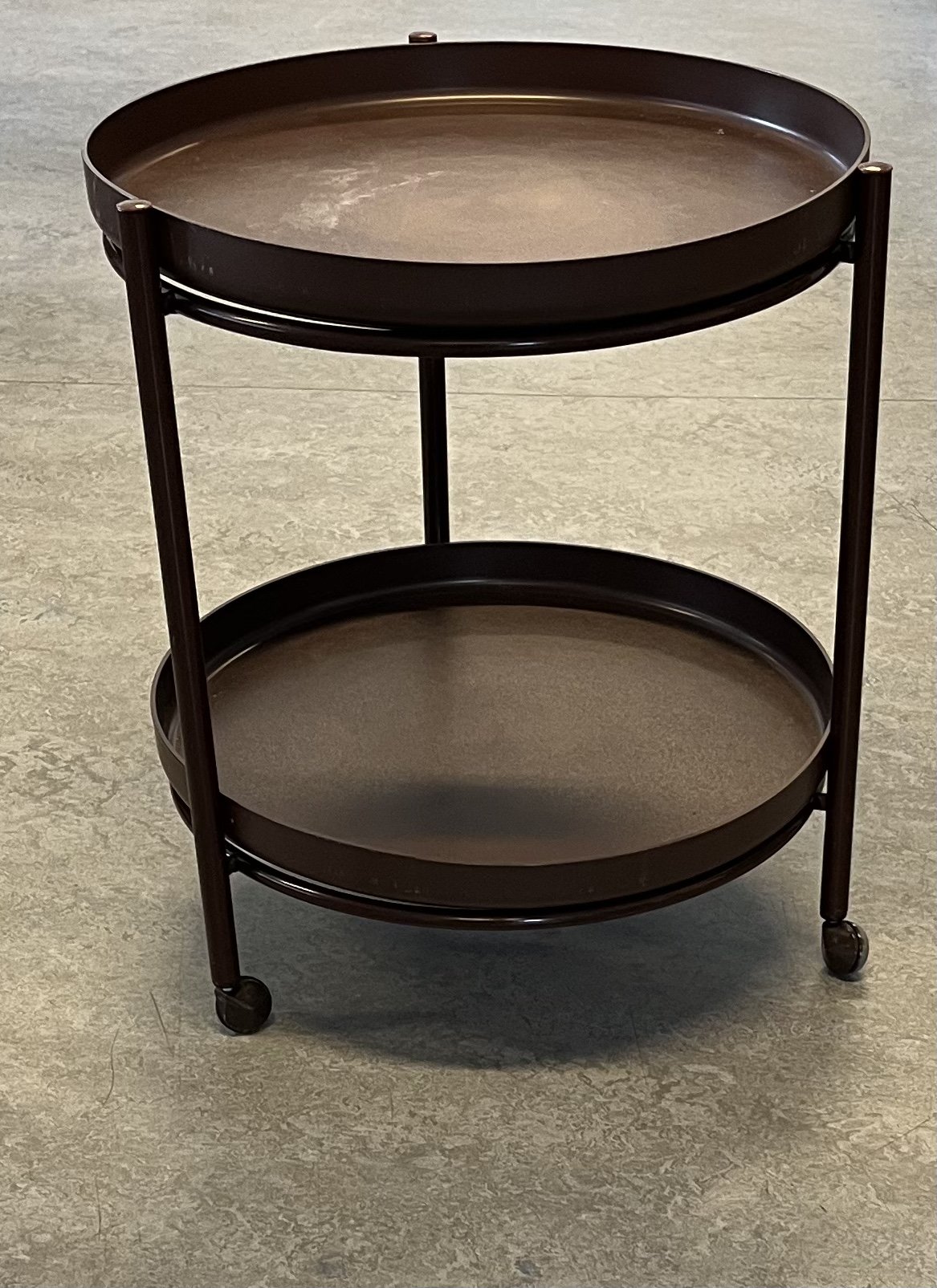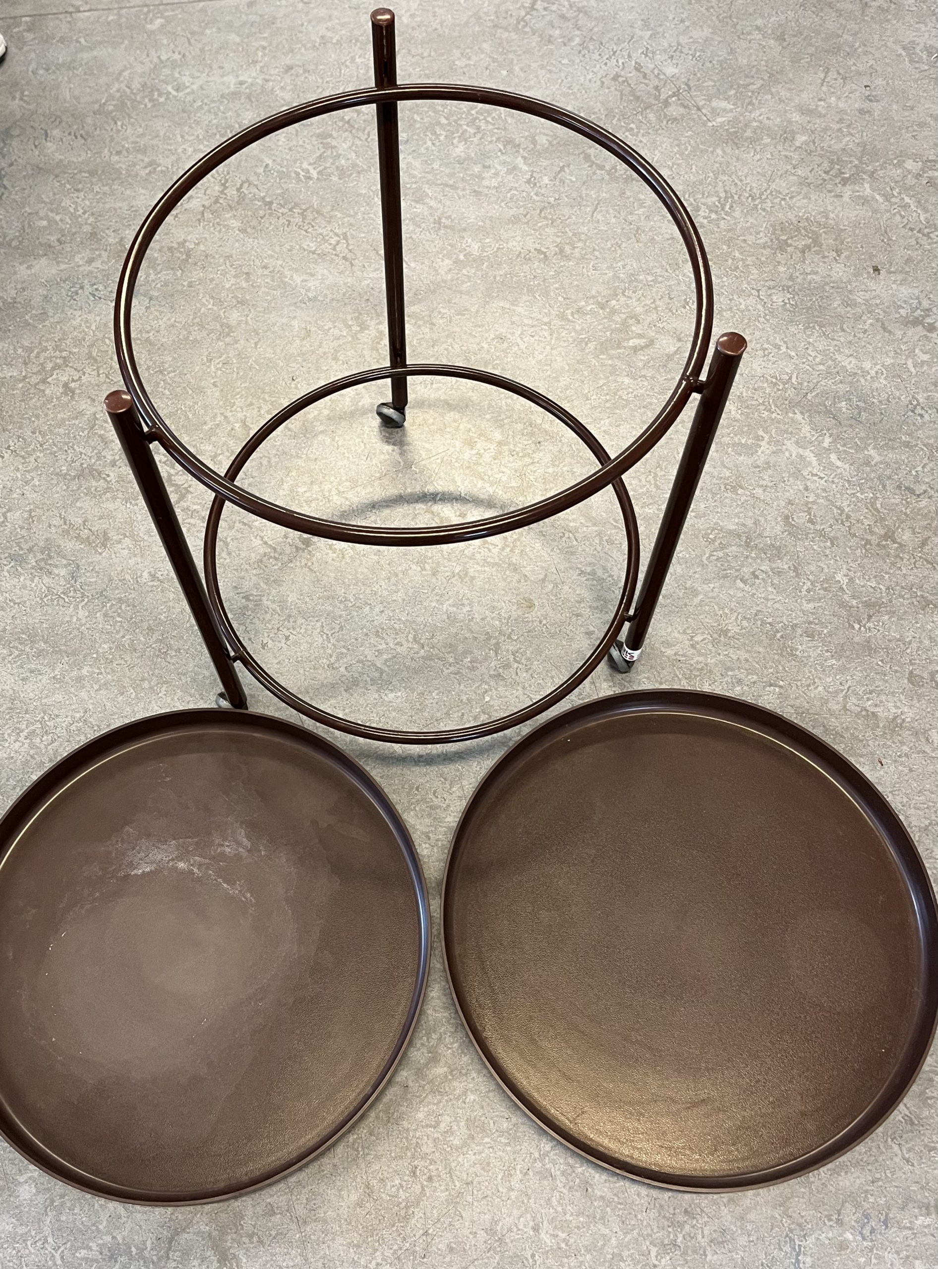 Retro bakke/rullebord fra BKS. Jernstel og 2 aftagelige bakker i brun plast. H: 54 cm – Ø: 46 cm.