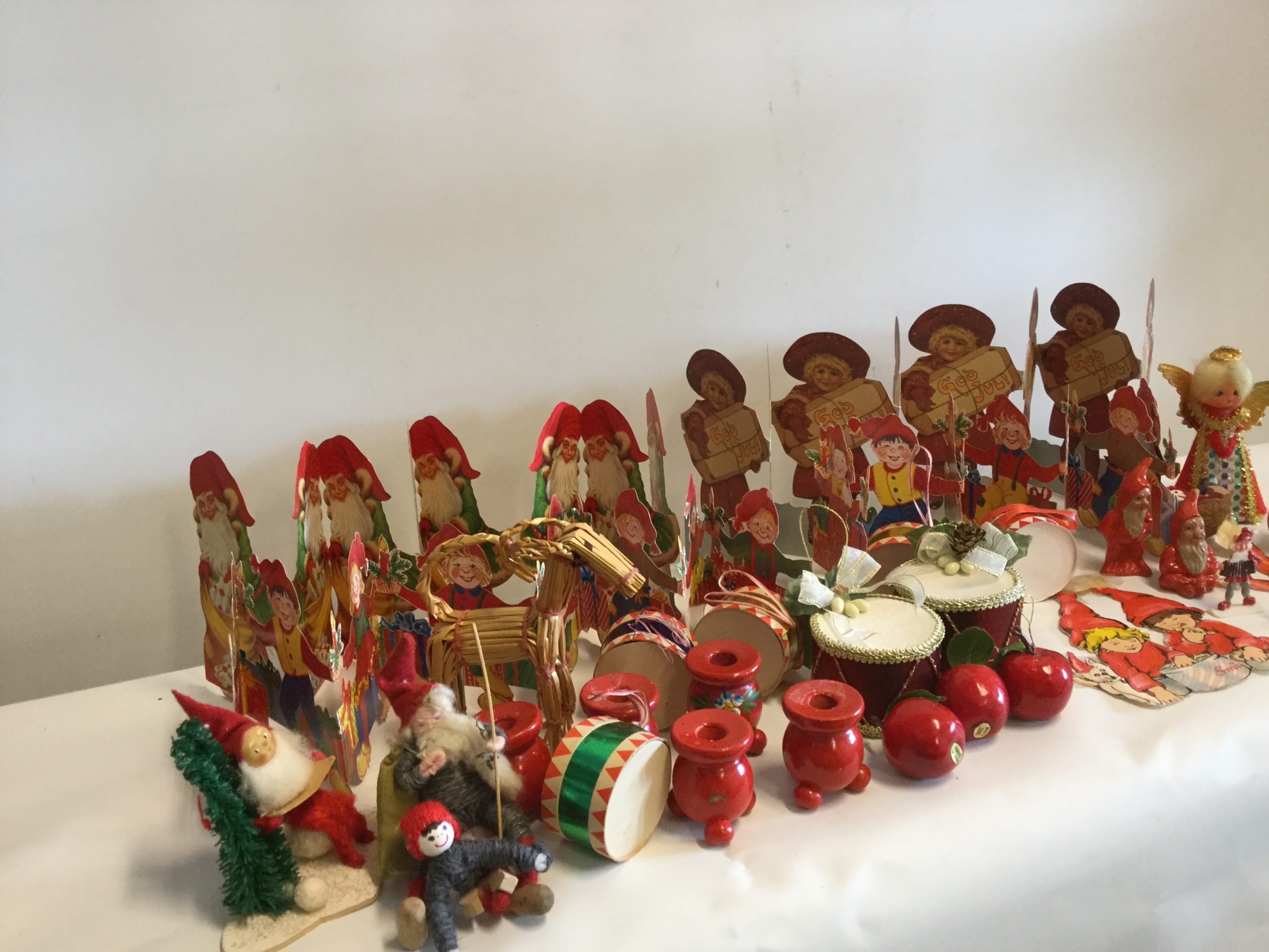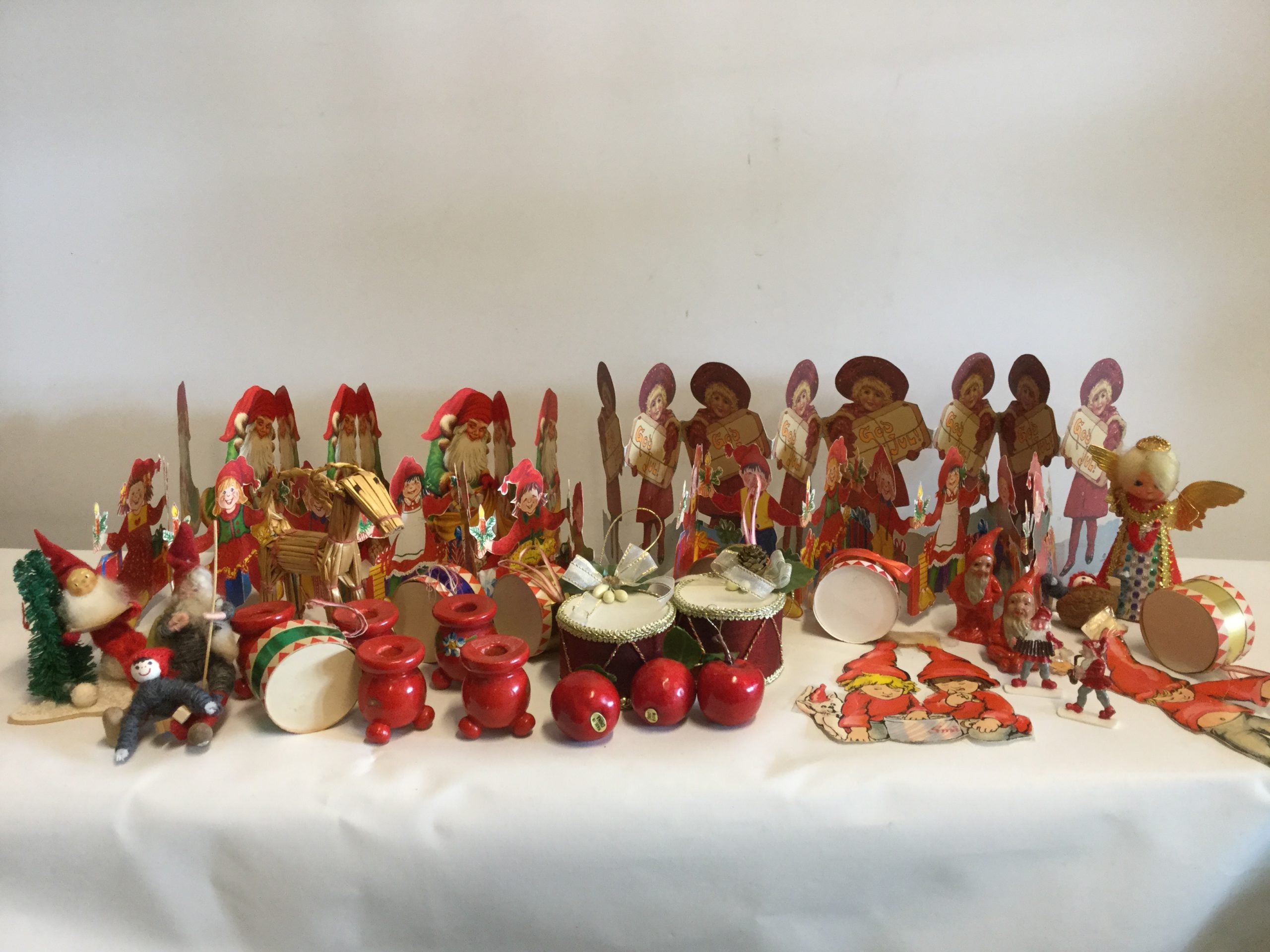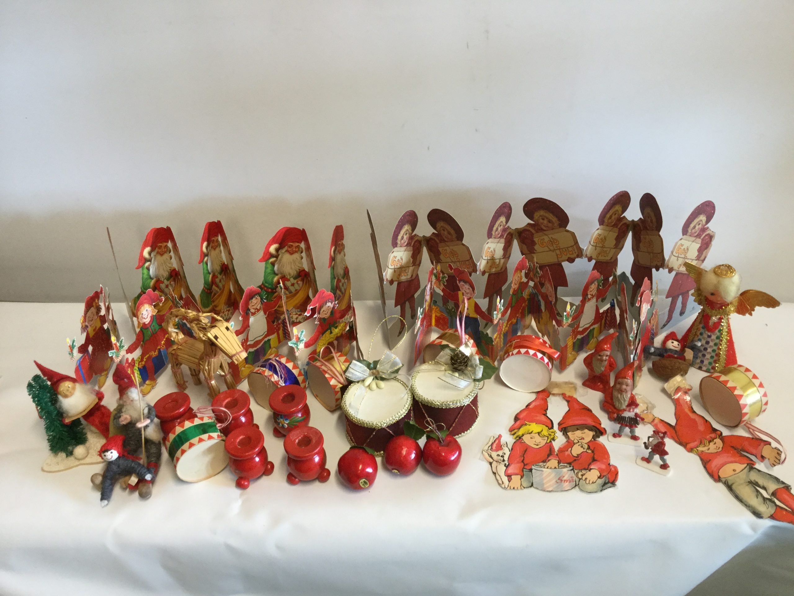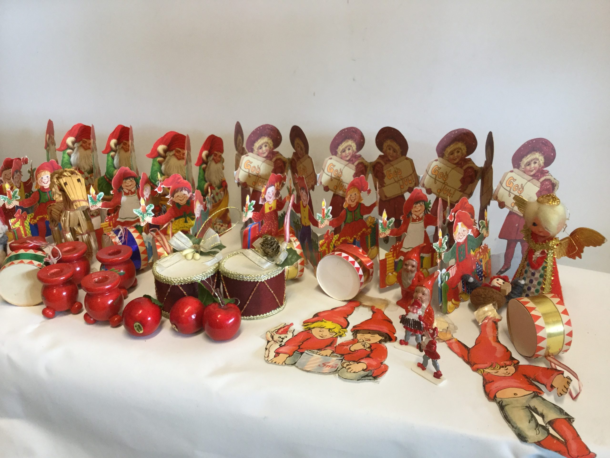 Blandet julepynt, bl.a. trommer, papirranker og kravlenisser