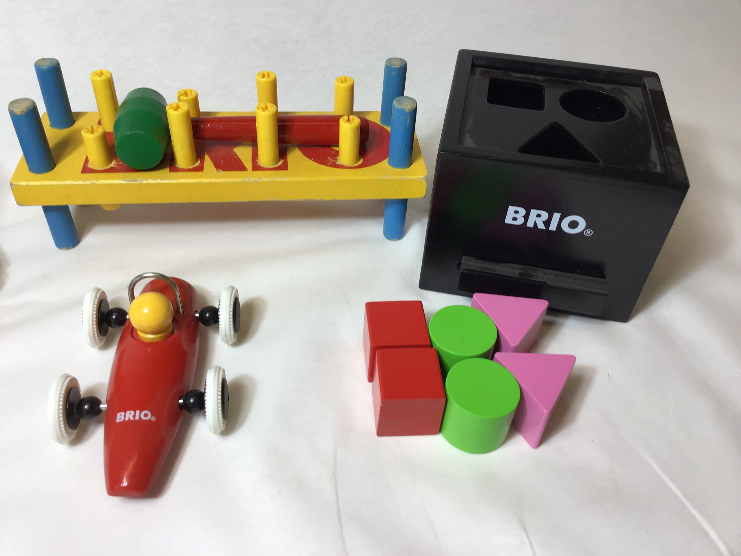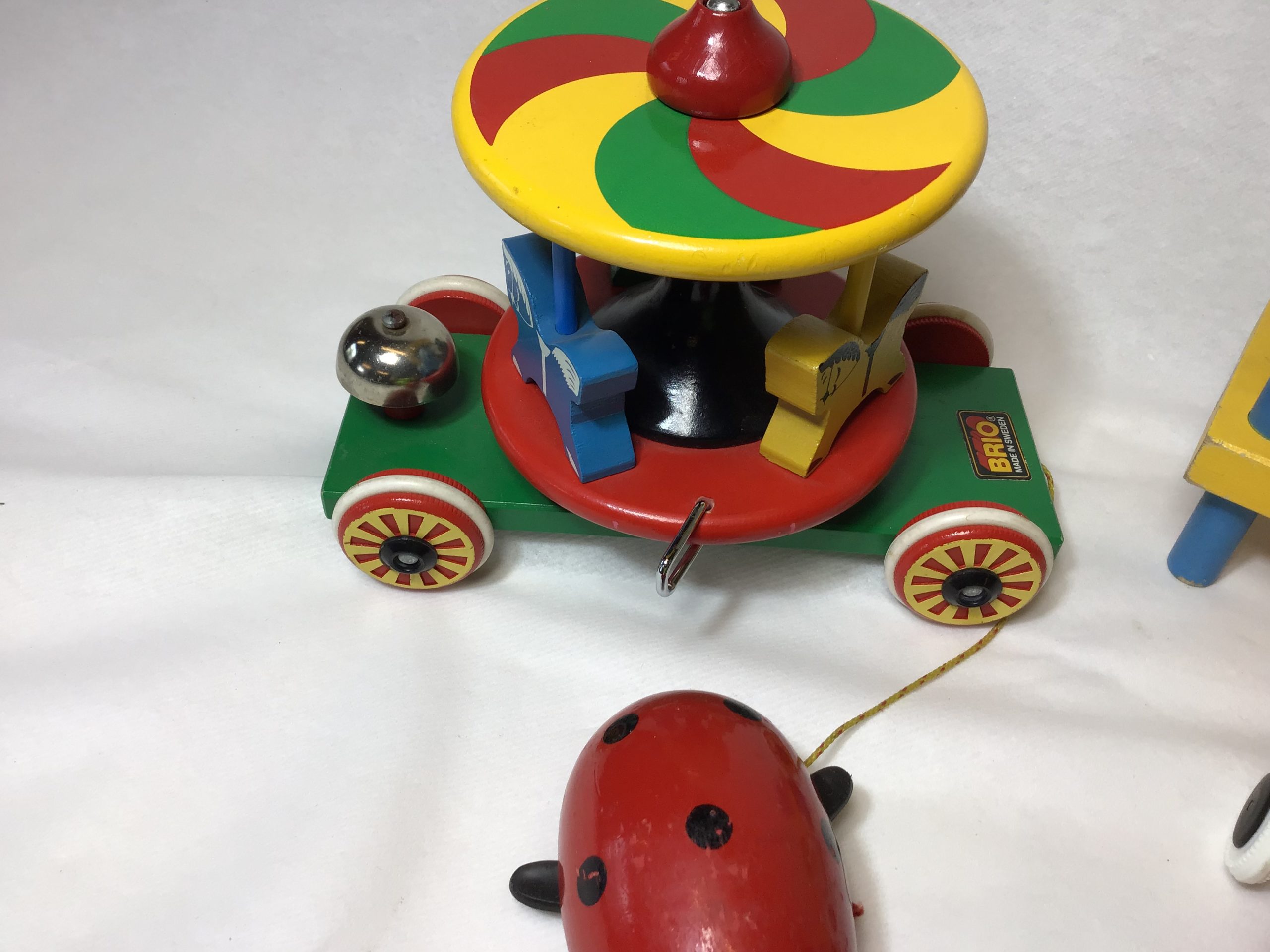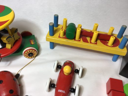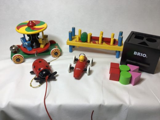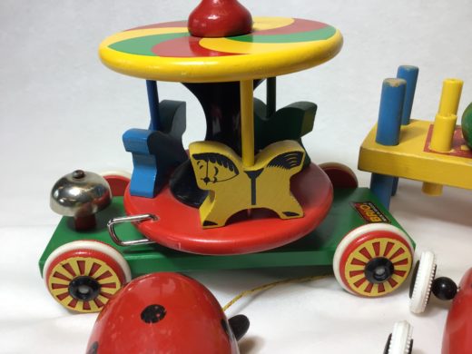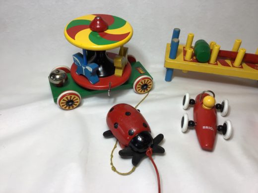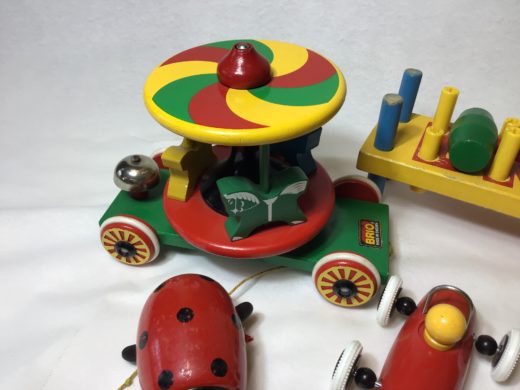 Karrusel, hammerbræt, puttekasse, mariehøne og bil.