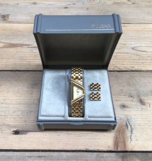 Dameur i rustfrit stål (guldfarvet) fra Pulsar. Inkl. to ekstra led til rem og opbevaringsæske i plastik.