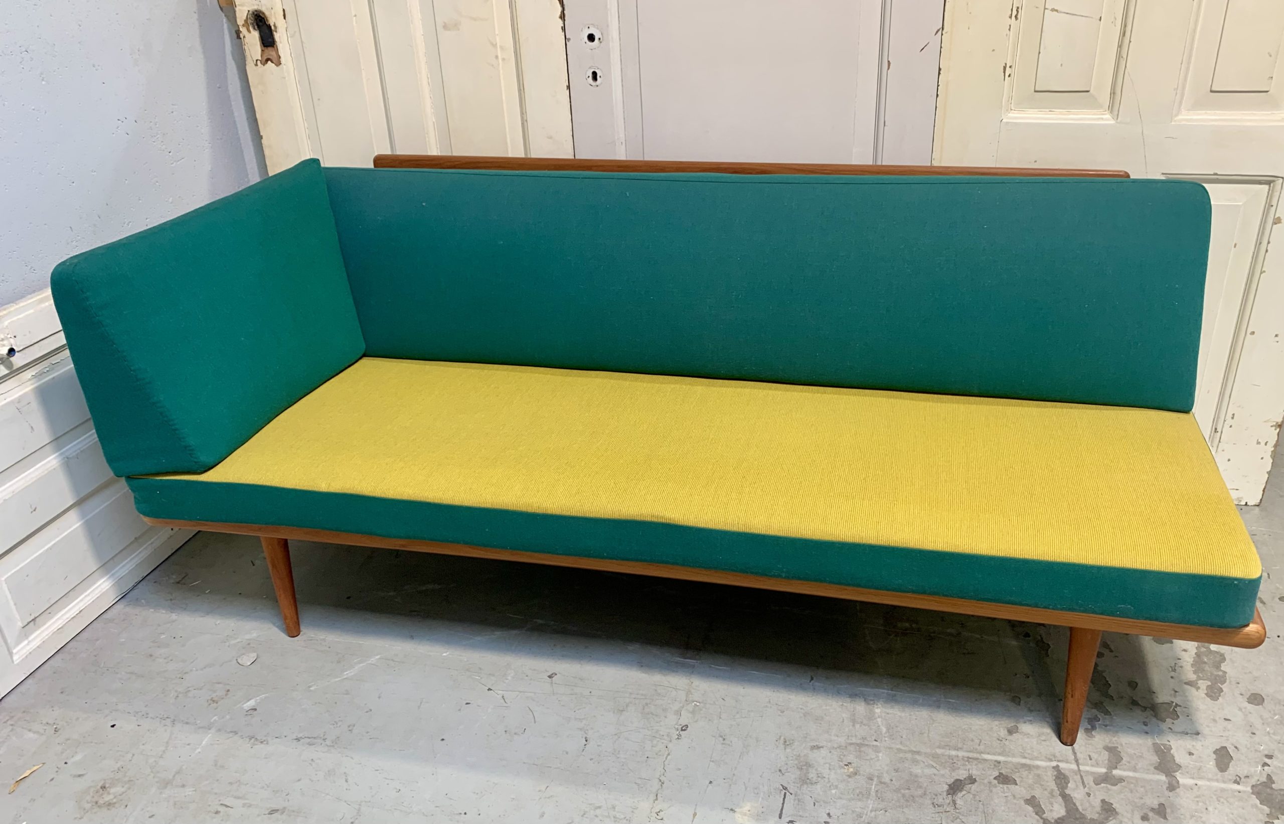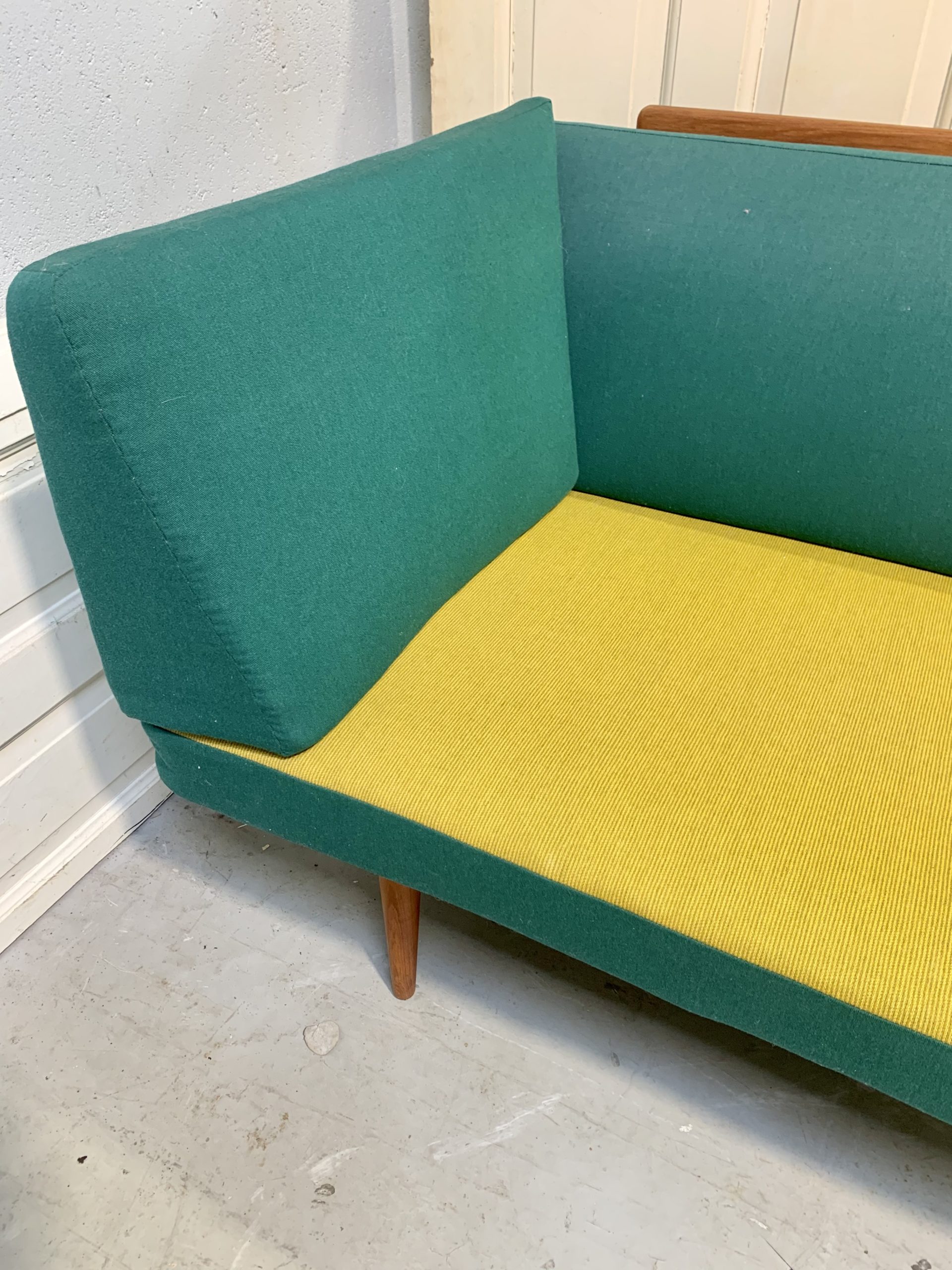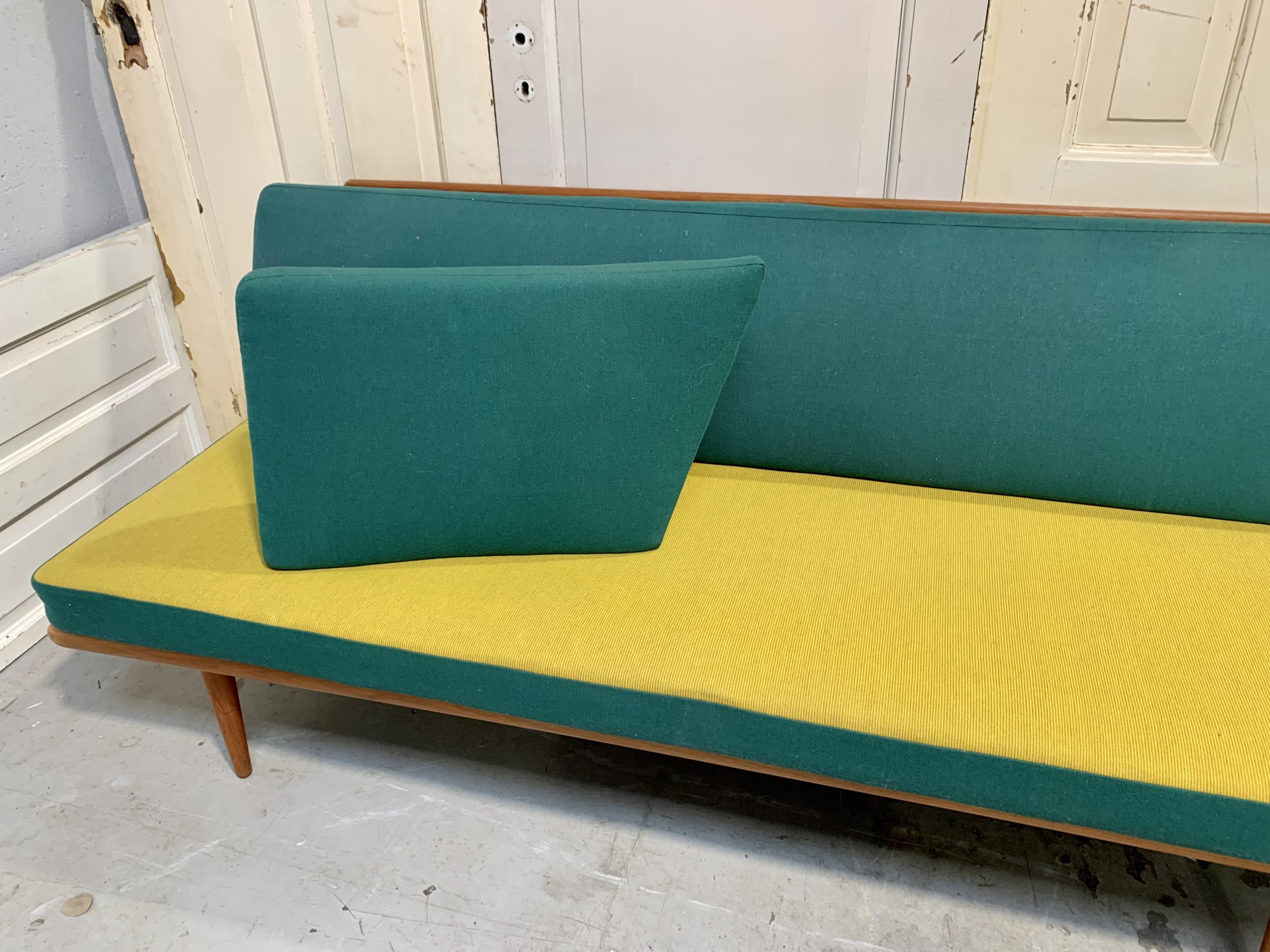 Daybed FD 417, designet af Hvidt og Mølgaard. Sofaen står i original og super flot stand. Den består af stel i teaktræ samt løs madras, ryghynde og hjørnehynde. Alle hynder er betrukket med uldstof i grøn og gul. Mål ca. H. 83 L. 190 B. 77 cm. Fremstillet hos France & Daverkosen i 1950-60’erne.