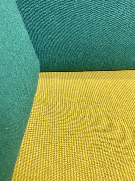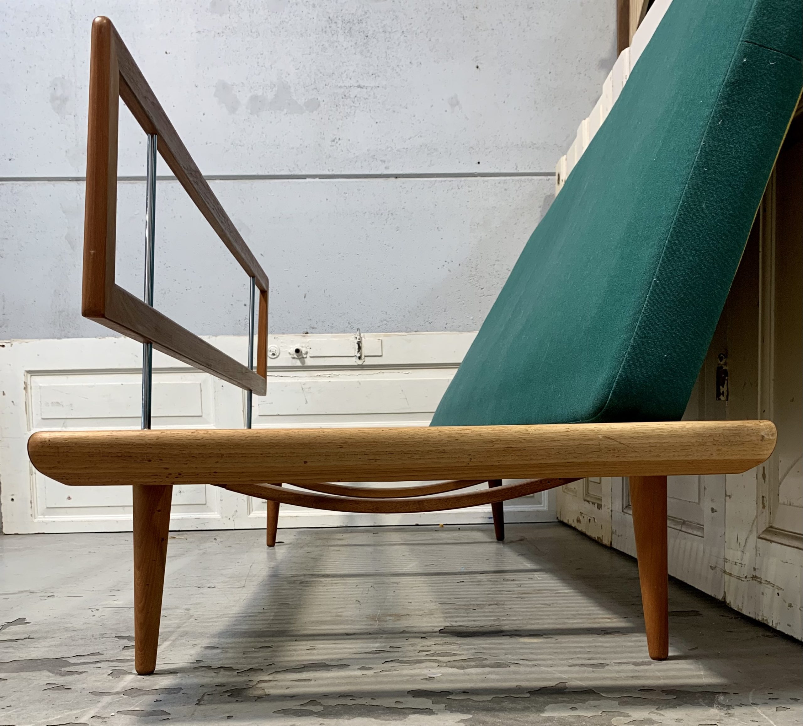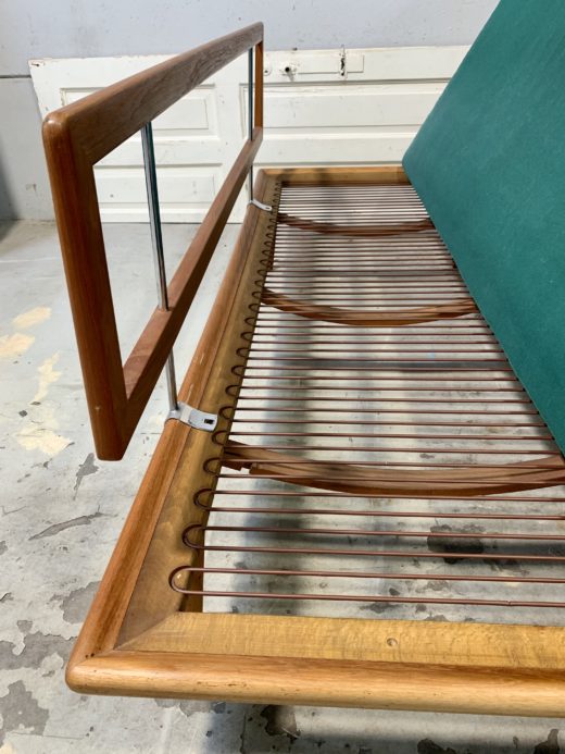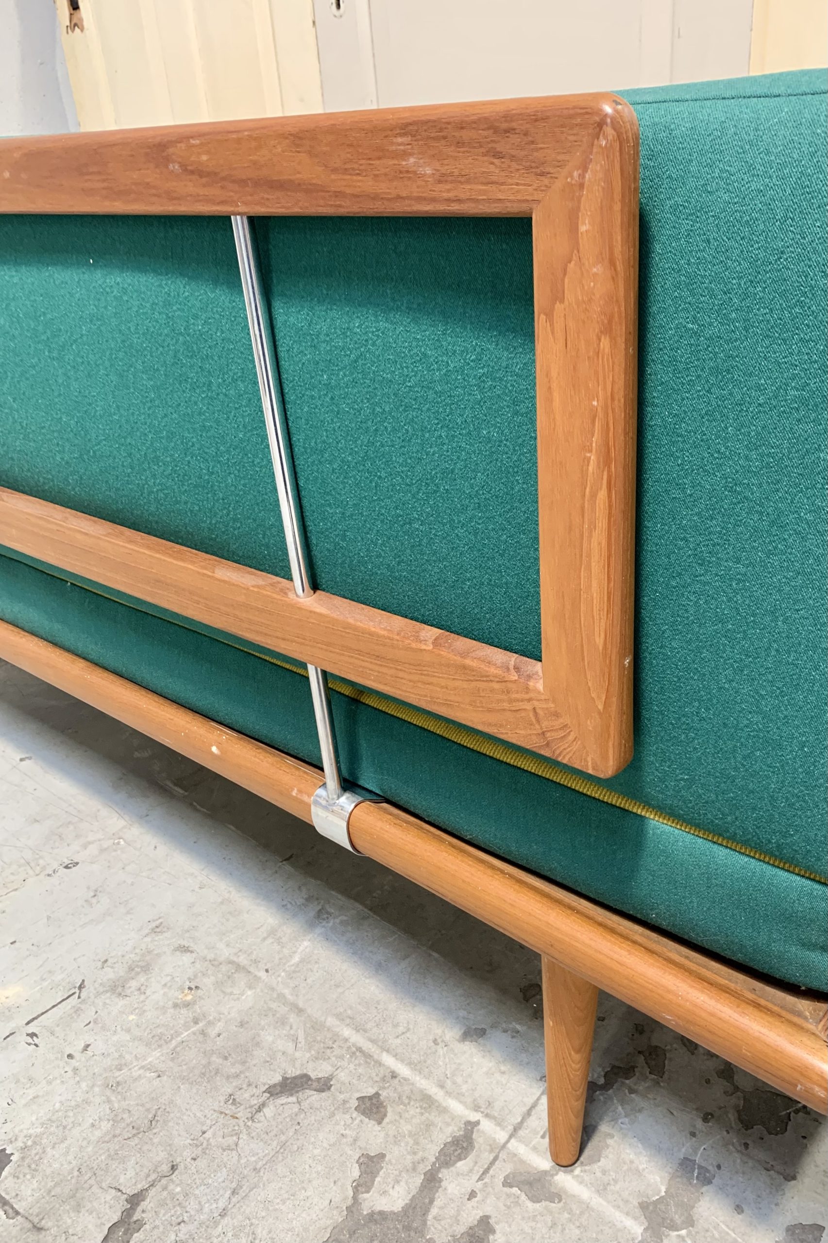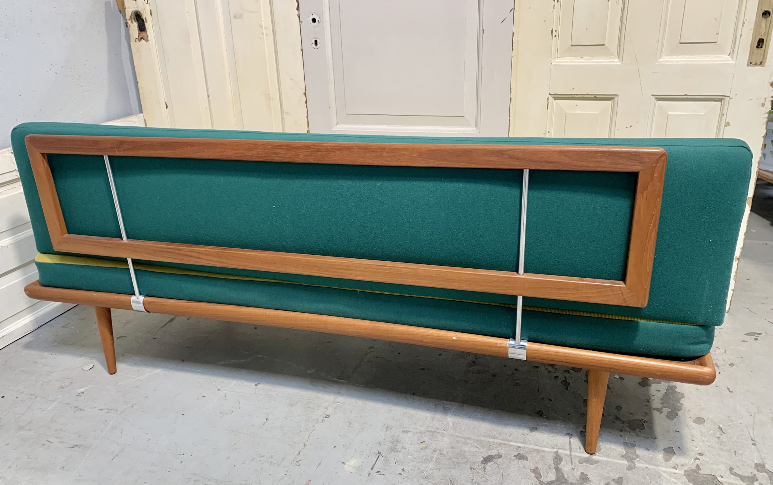 Daybed FD 417, designet af Hvidt og Mølgaard. Sofaen står i original og super flot stand. Den består af stel i teaktræ samt løs madras, ryghynde og hjørnehynde. Alle hynder er betrukket med uldstof i grøn og gul. Mål ca. H. 83 L. 190 B. 77 cm. Fremstillet hos France & Daverkosen i 1950-60’erne.