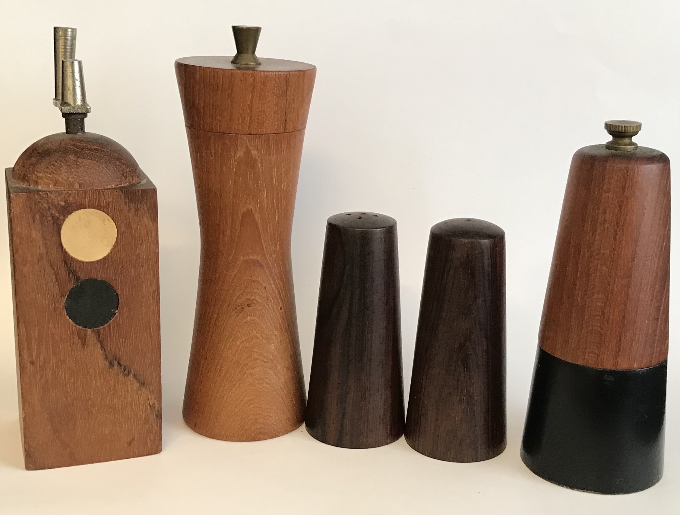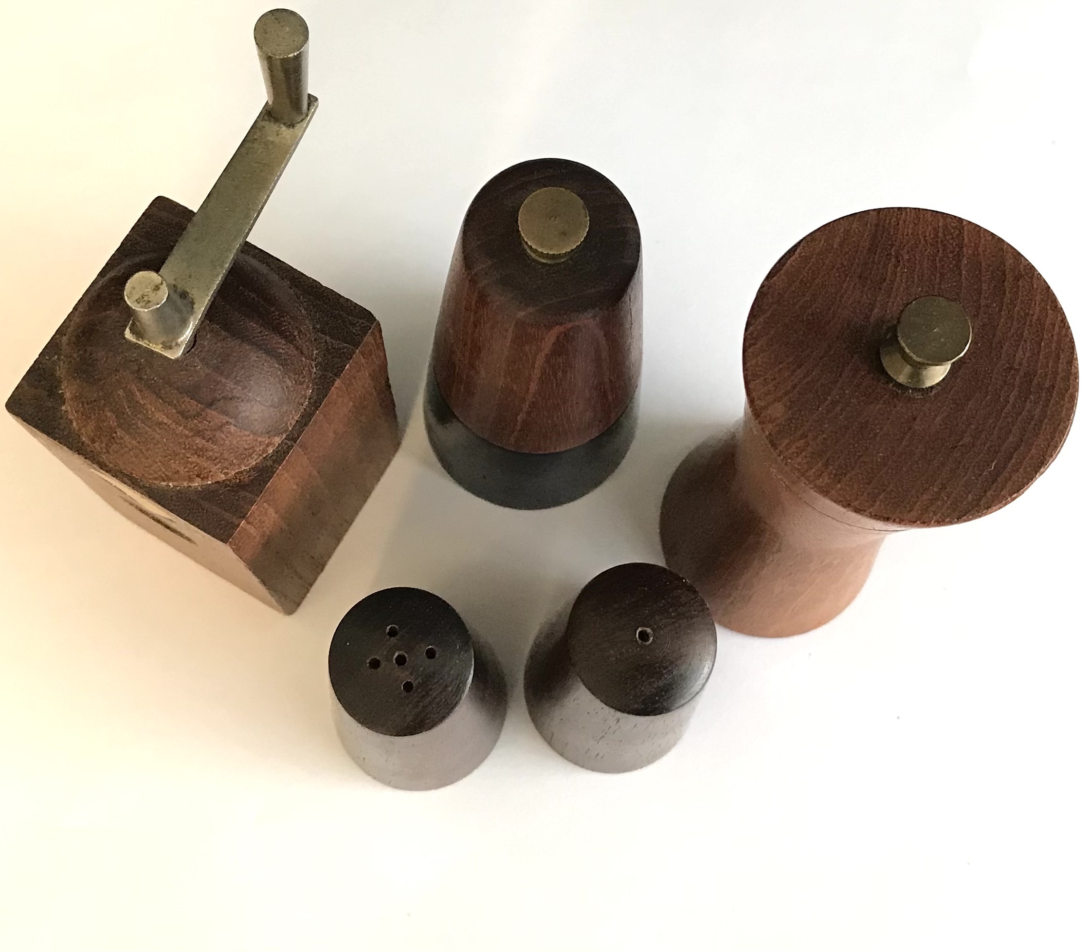 Diverse Retro peberkværne og salt/peber i forskellige træsorter bl.a. teak og palisander. Fra Laurids Lønborg og andre.