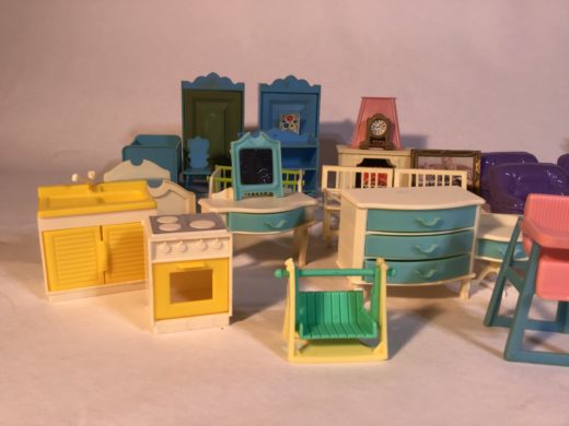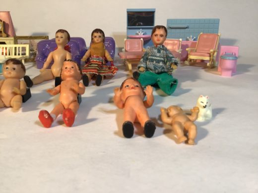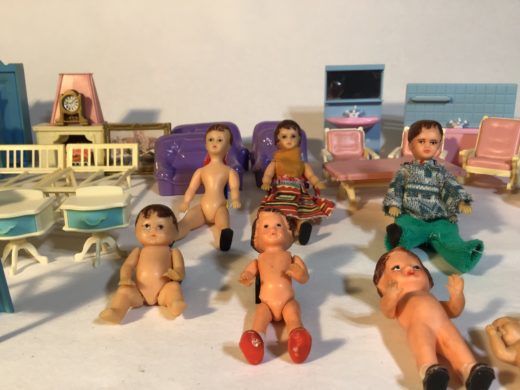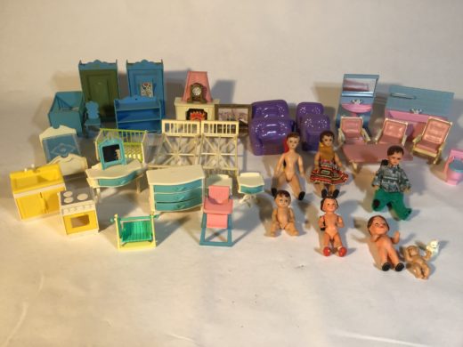 7 dukker og mange møbler i plast