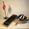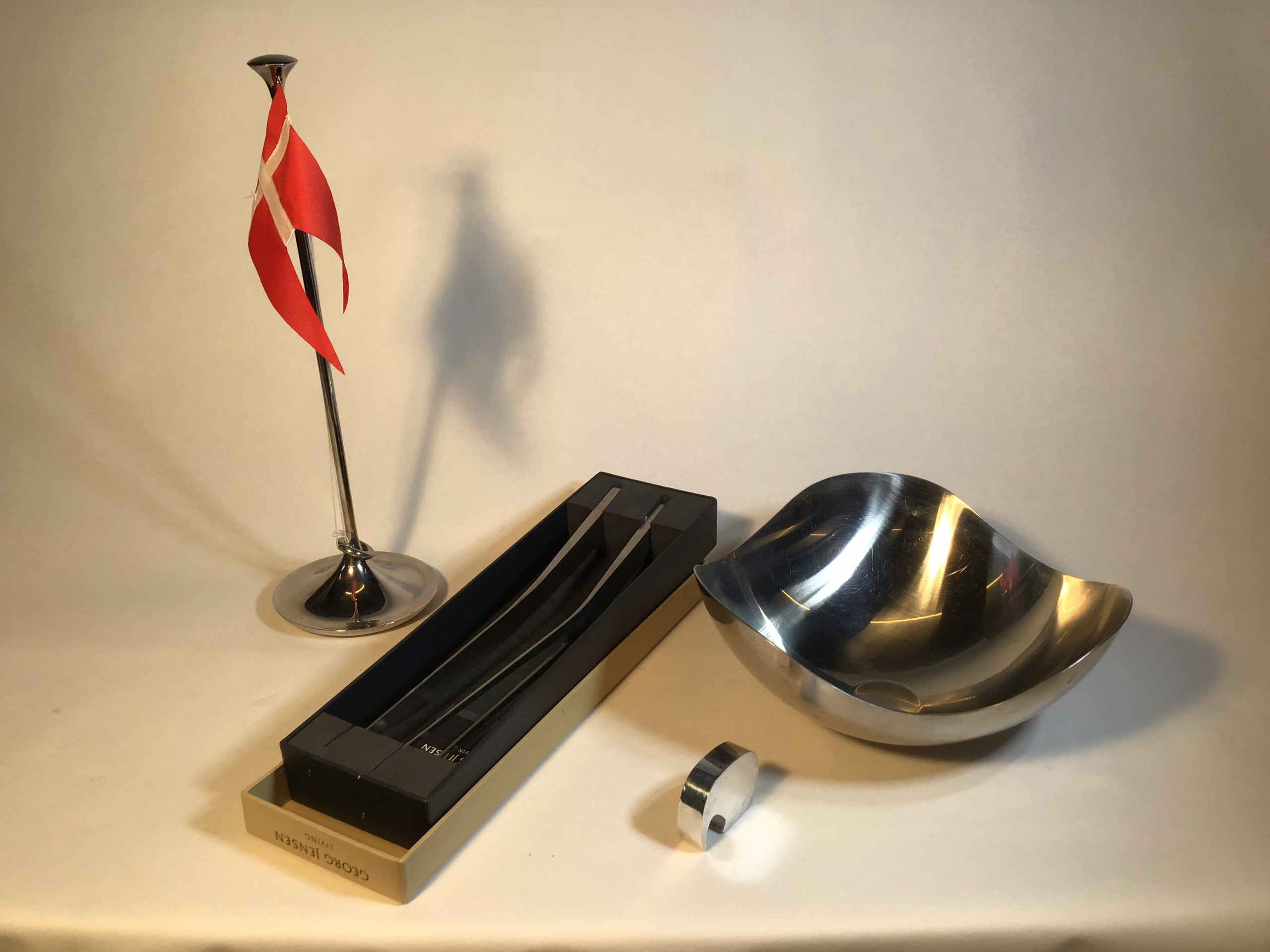 Skål, flagstang, oplukker (elefant) samt forskærersæt. Sidstnævnte i original emballage.