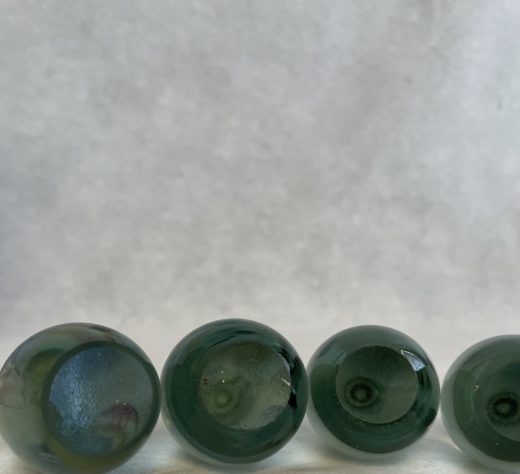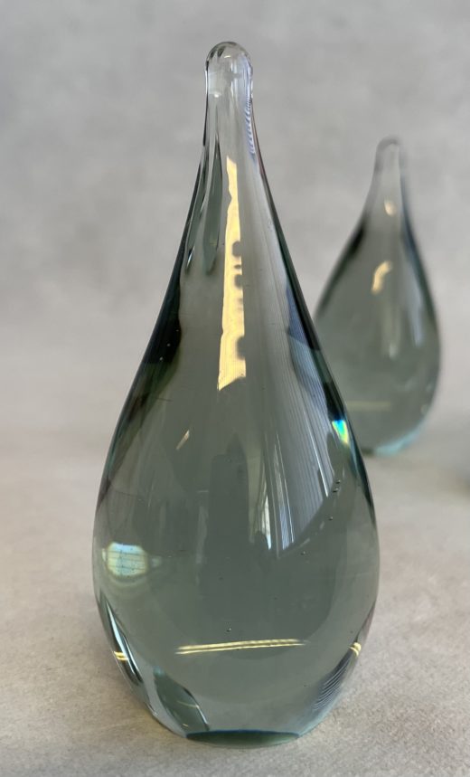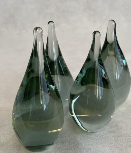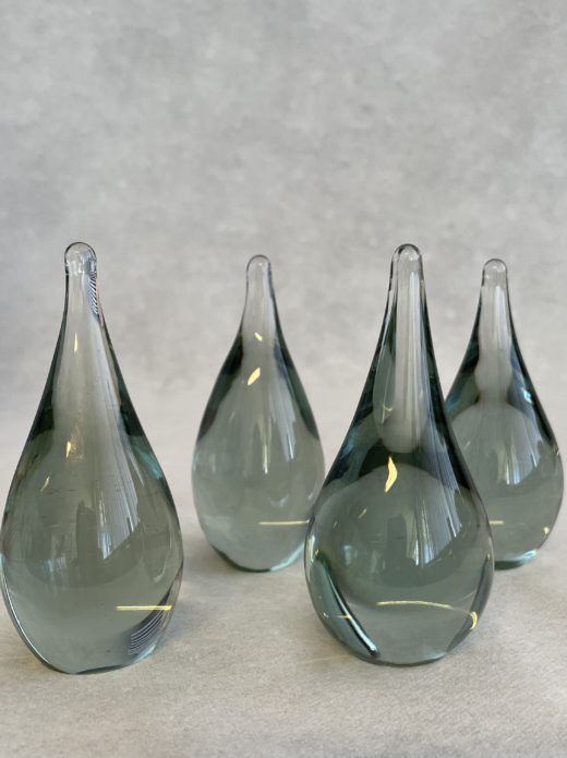 4 stk. glasdråber i blå/gråt glas. B: 5 cm midt – H: 10 cm.