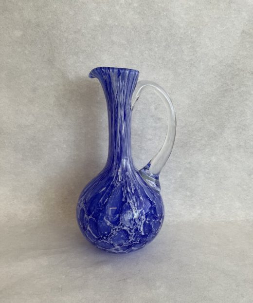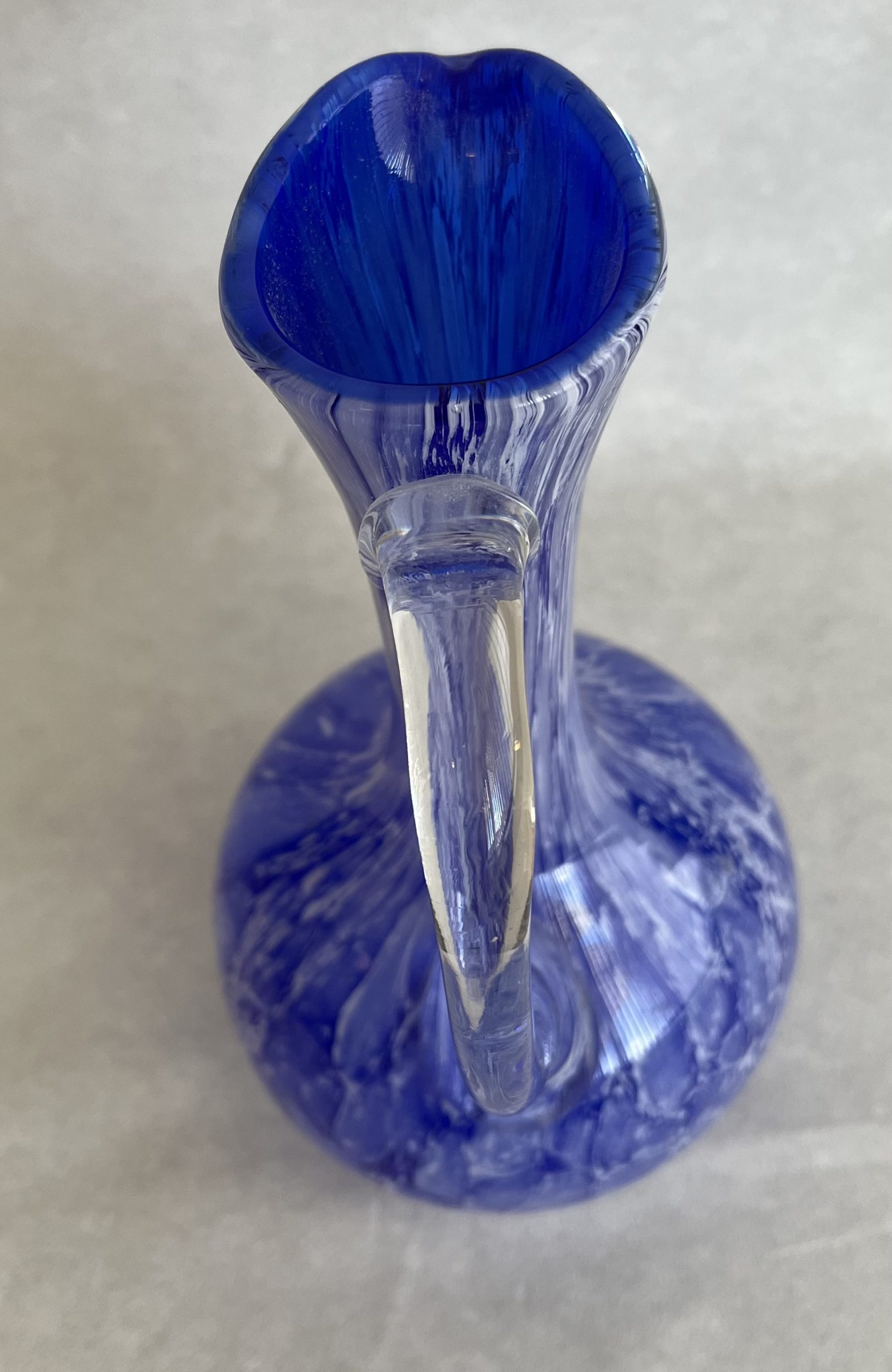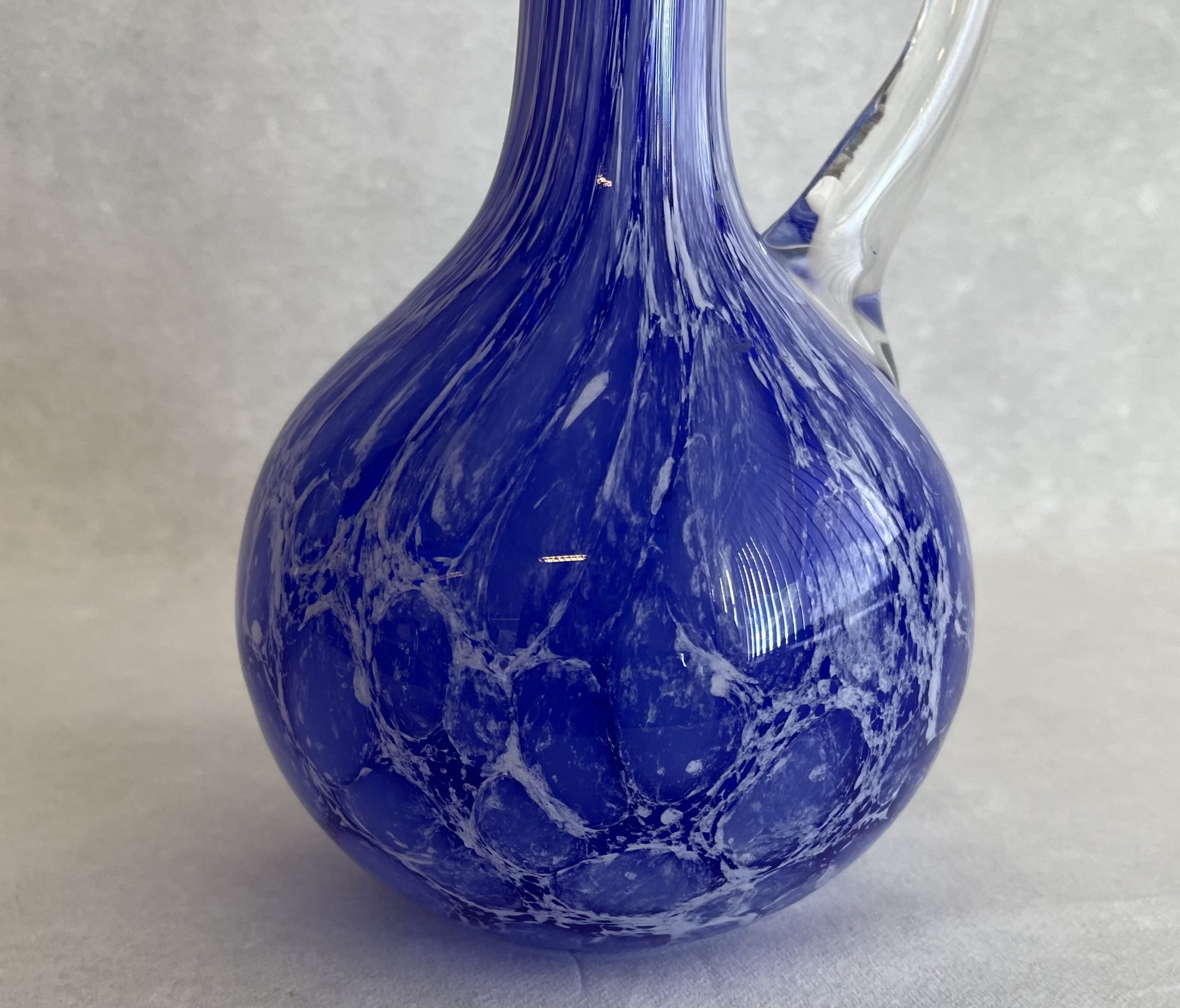 Kanden har lidt brugsspor fx. et lille skrab i glasset samt ridser på hanken. Har en slir stribe nederst på kanden.