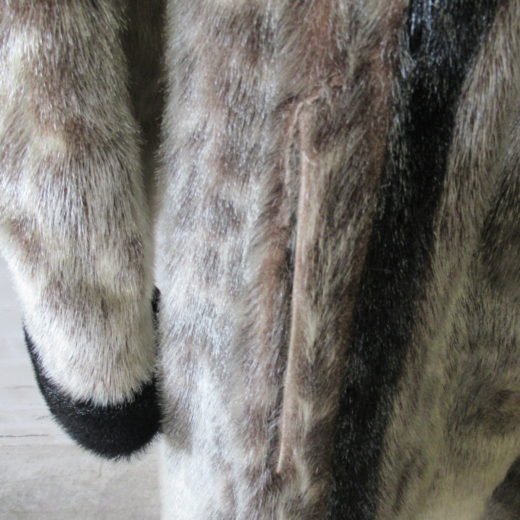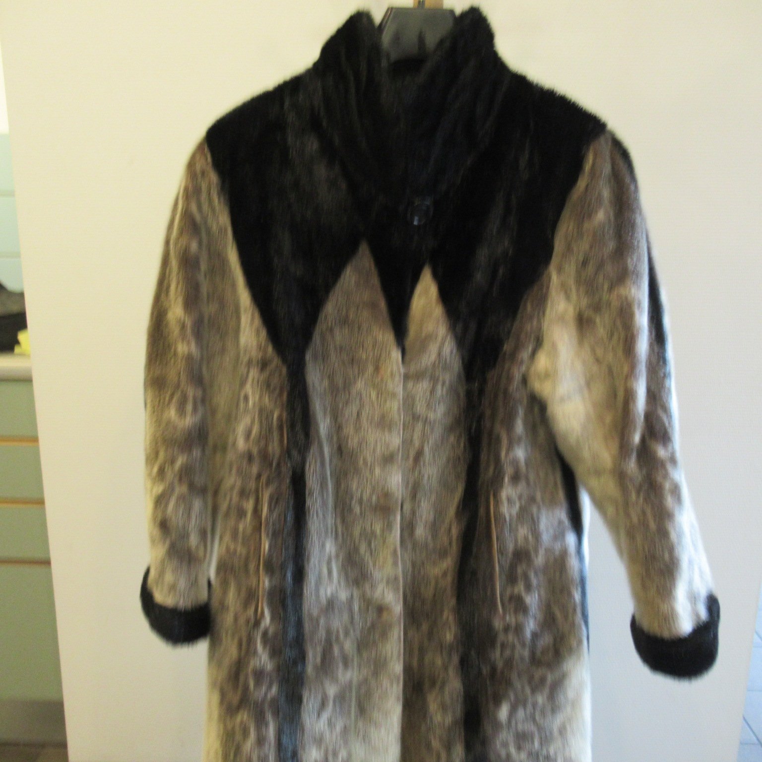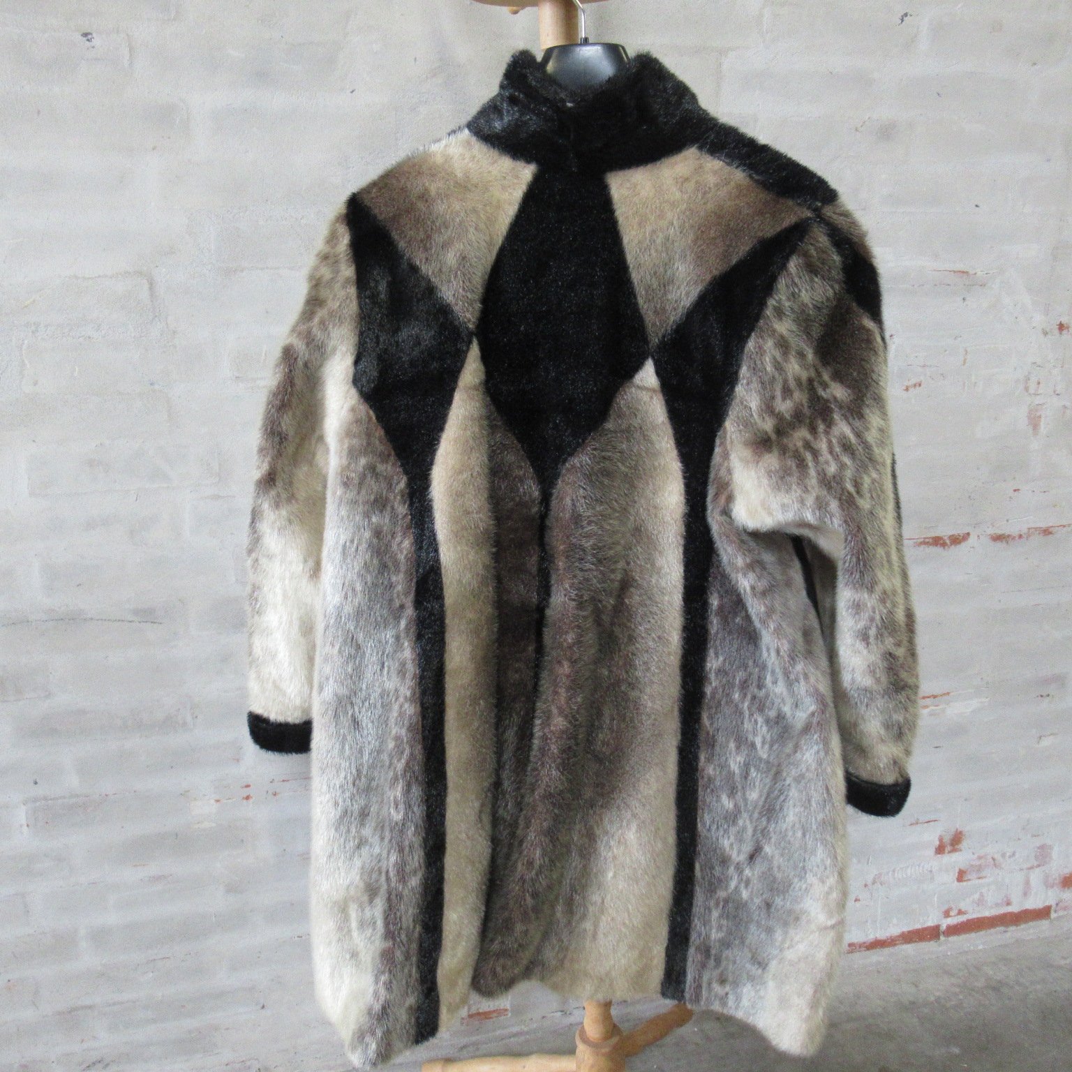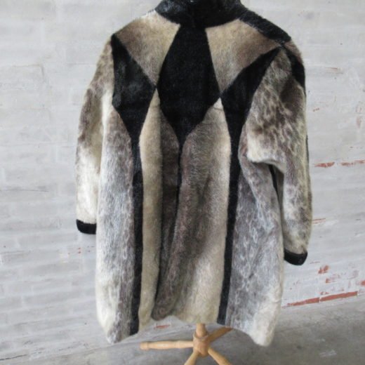 Størrelse fremgår ikke men måler fra skulder til skulder 45 cm, fra ærmegab til ærmegab 68 cm og fra nakke til nederste søm 104 cm.