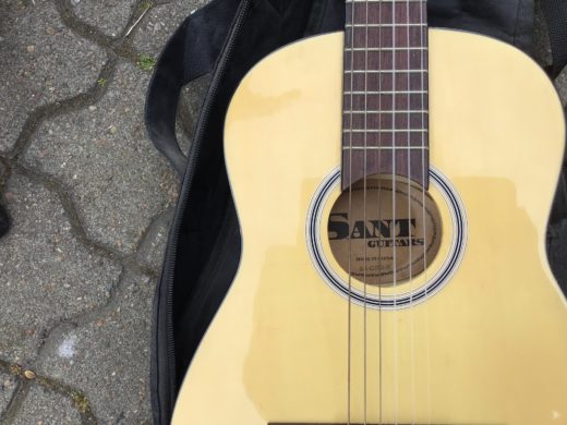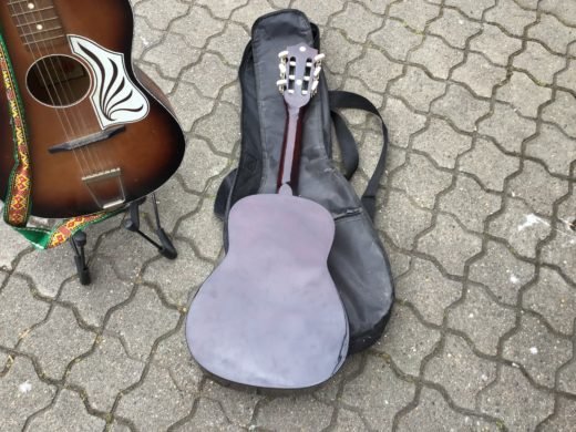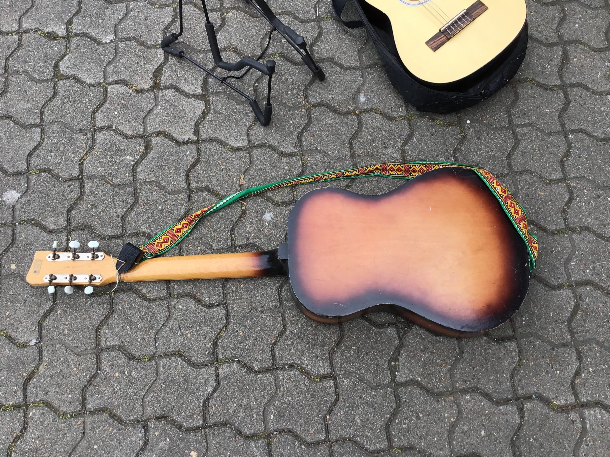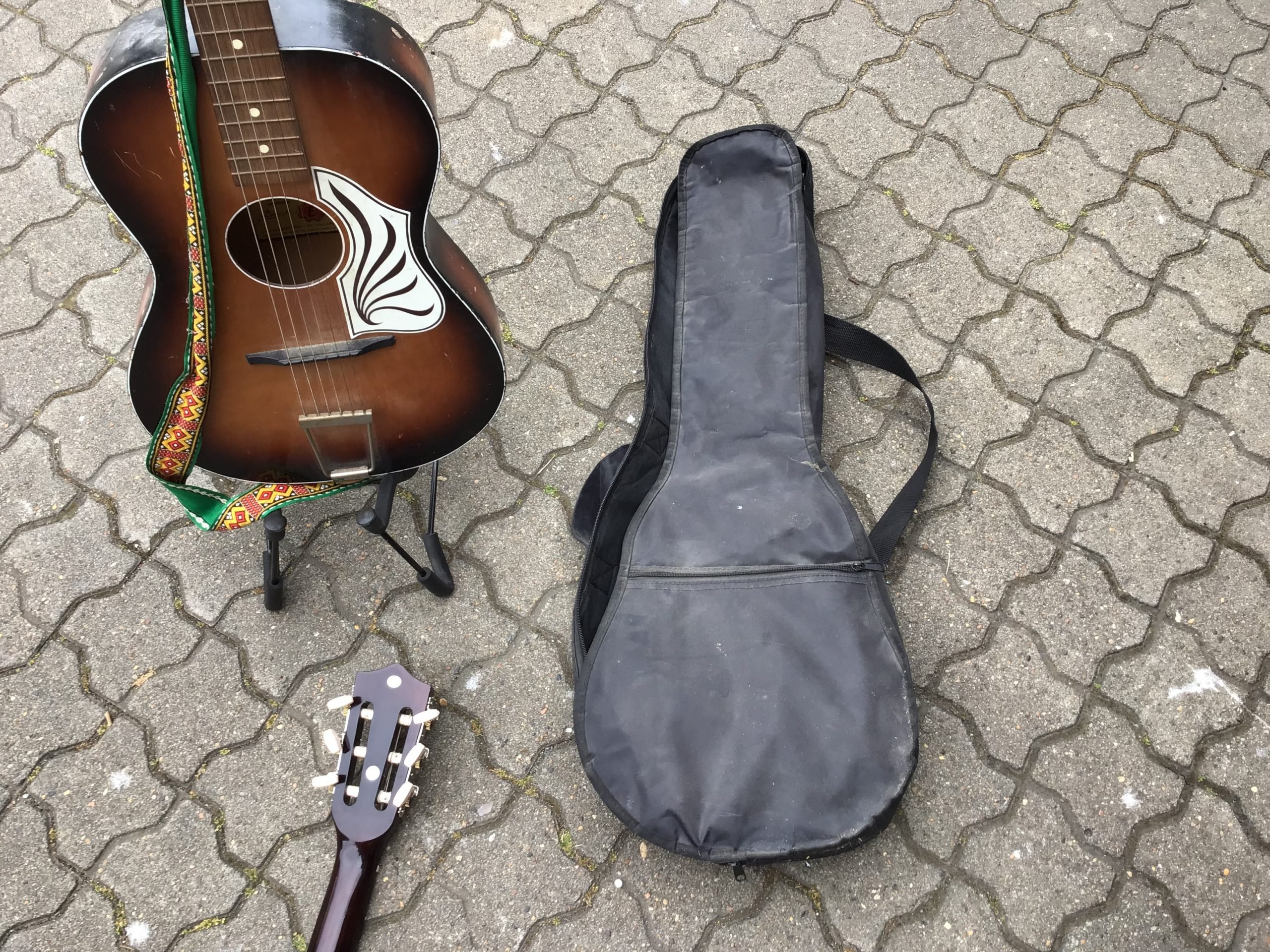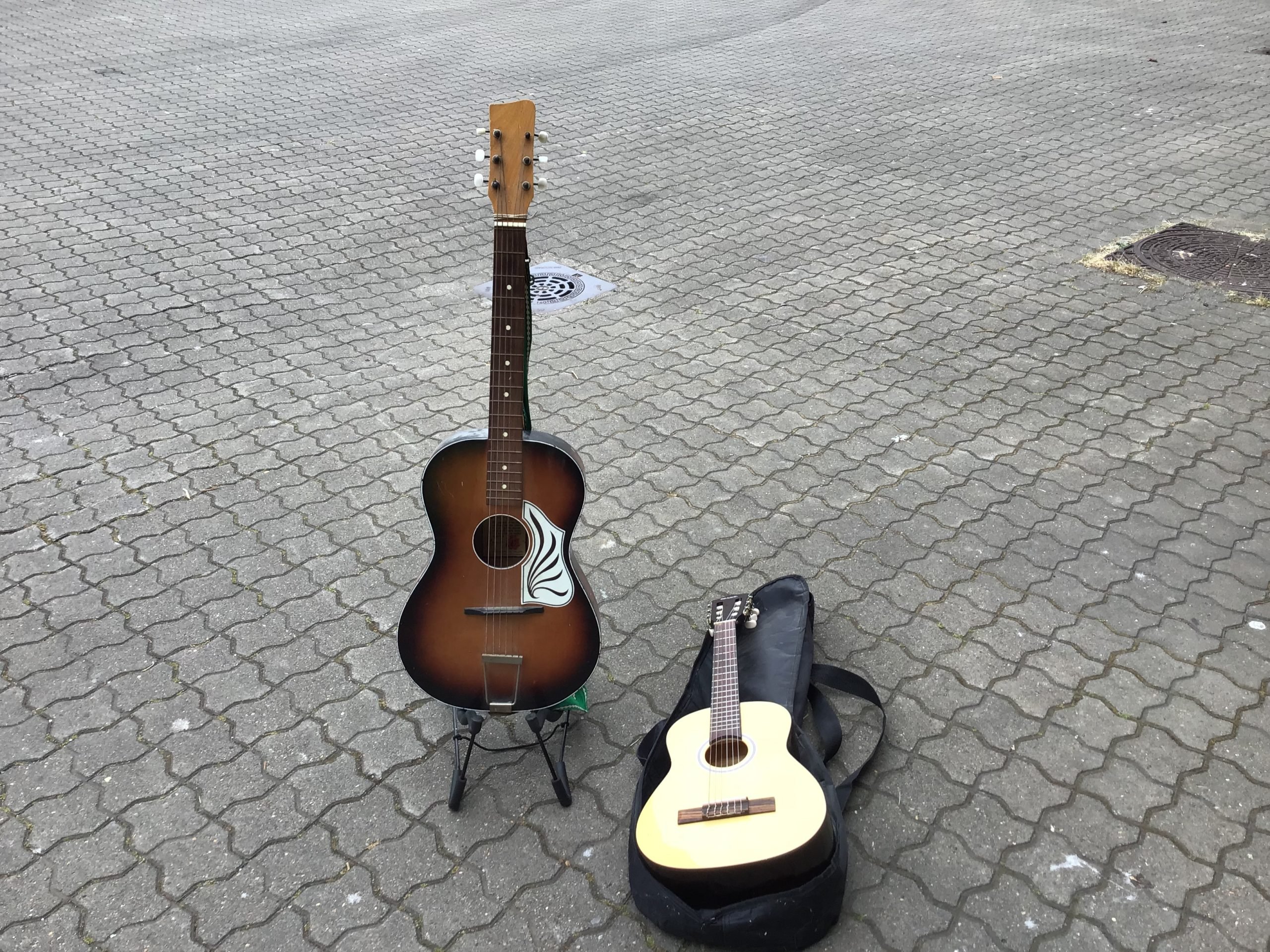 2 guitarer samt stativ. Den lille har ekstra strenge og taske.