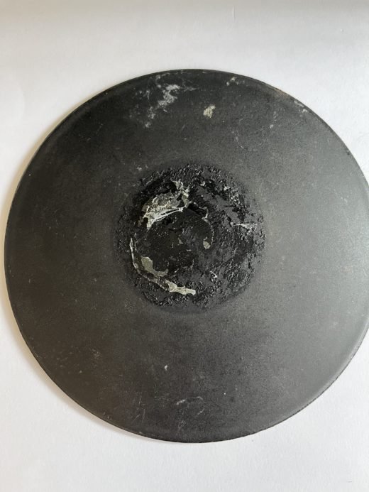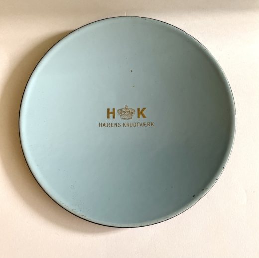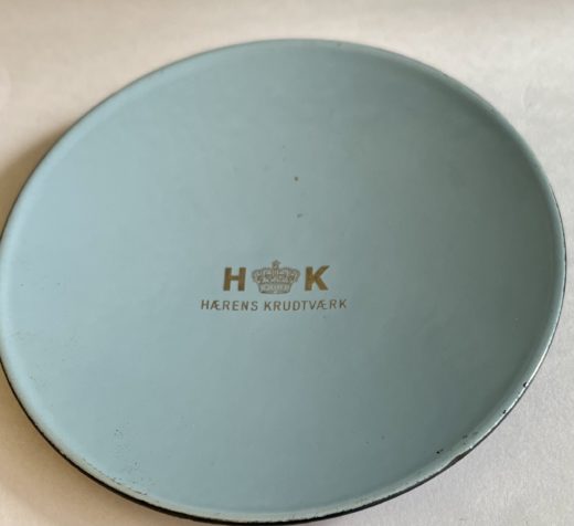 Lysblå emaljeplatte/tallerken/askebæger? fra Hærens krudtværk. Ø: 15 cm.