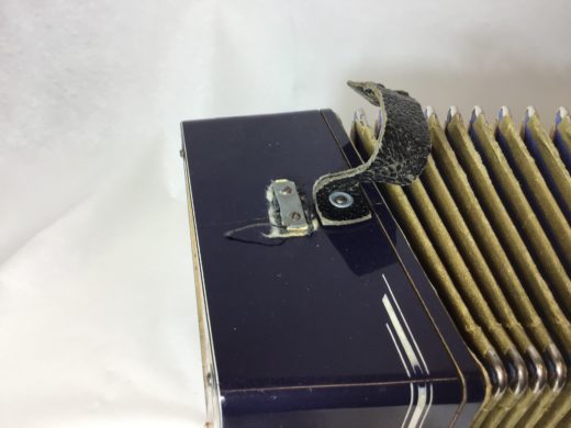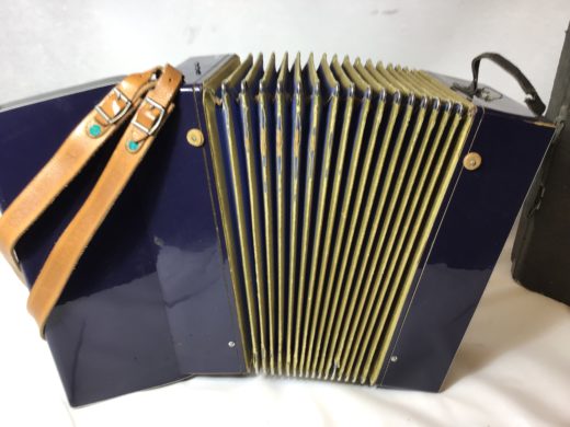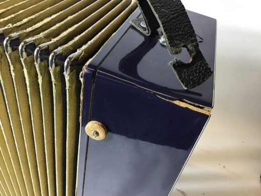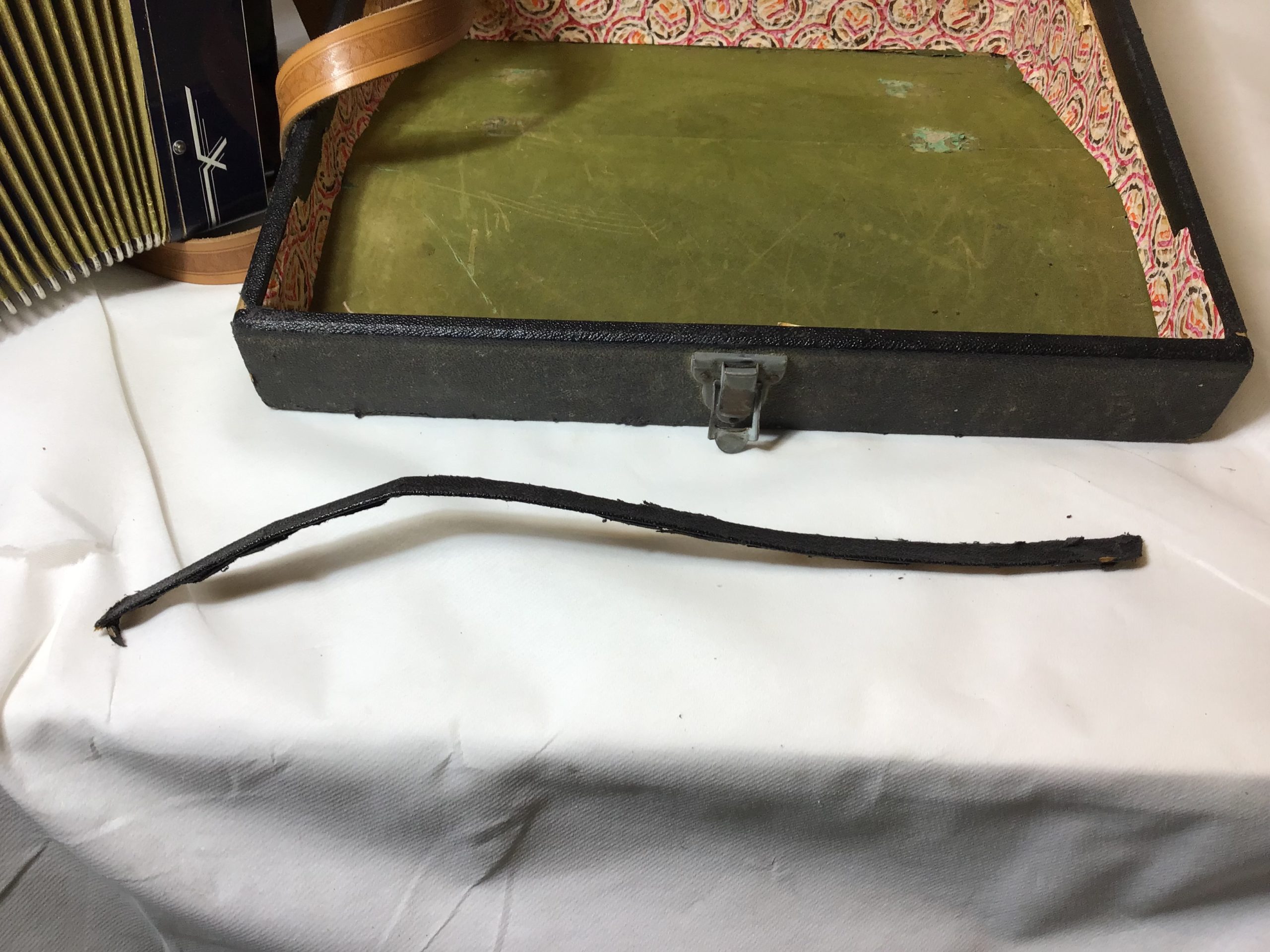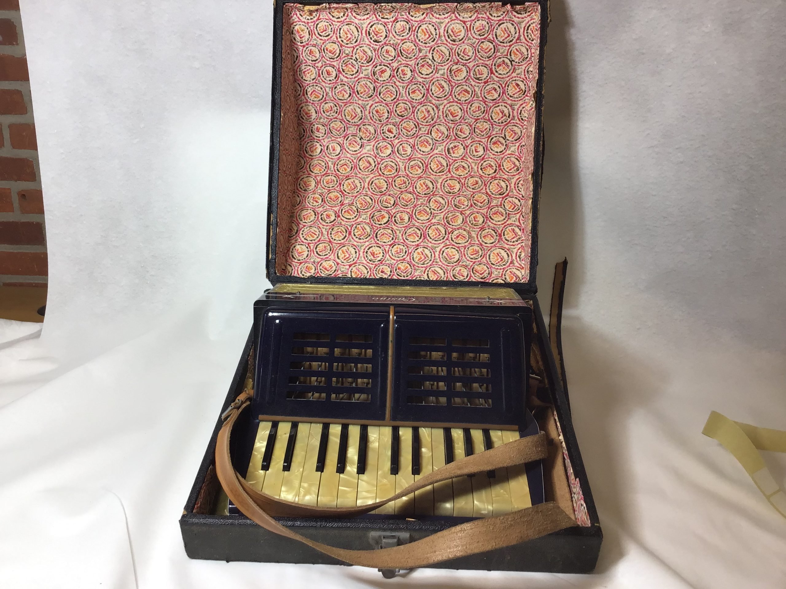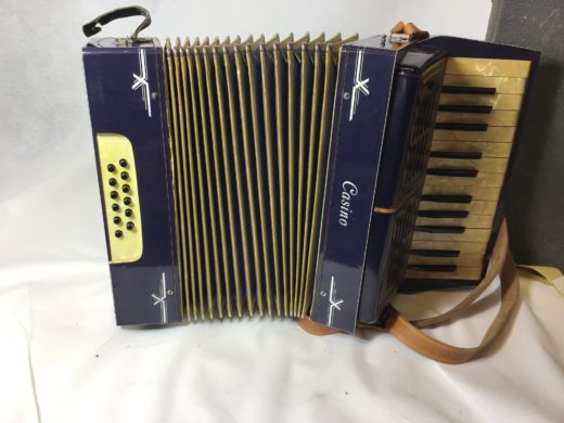 Casino harmonika. Kassen er i stykker i hængslet og i bunden, strop på harmonikaen er i stykker. Generelt mange brugsspor.