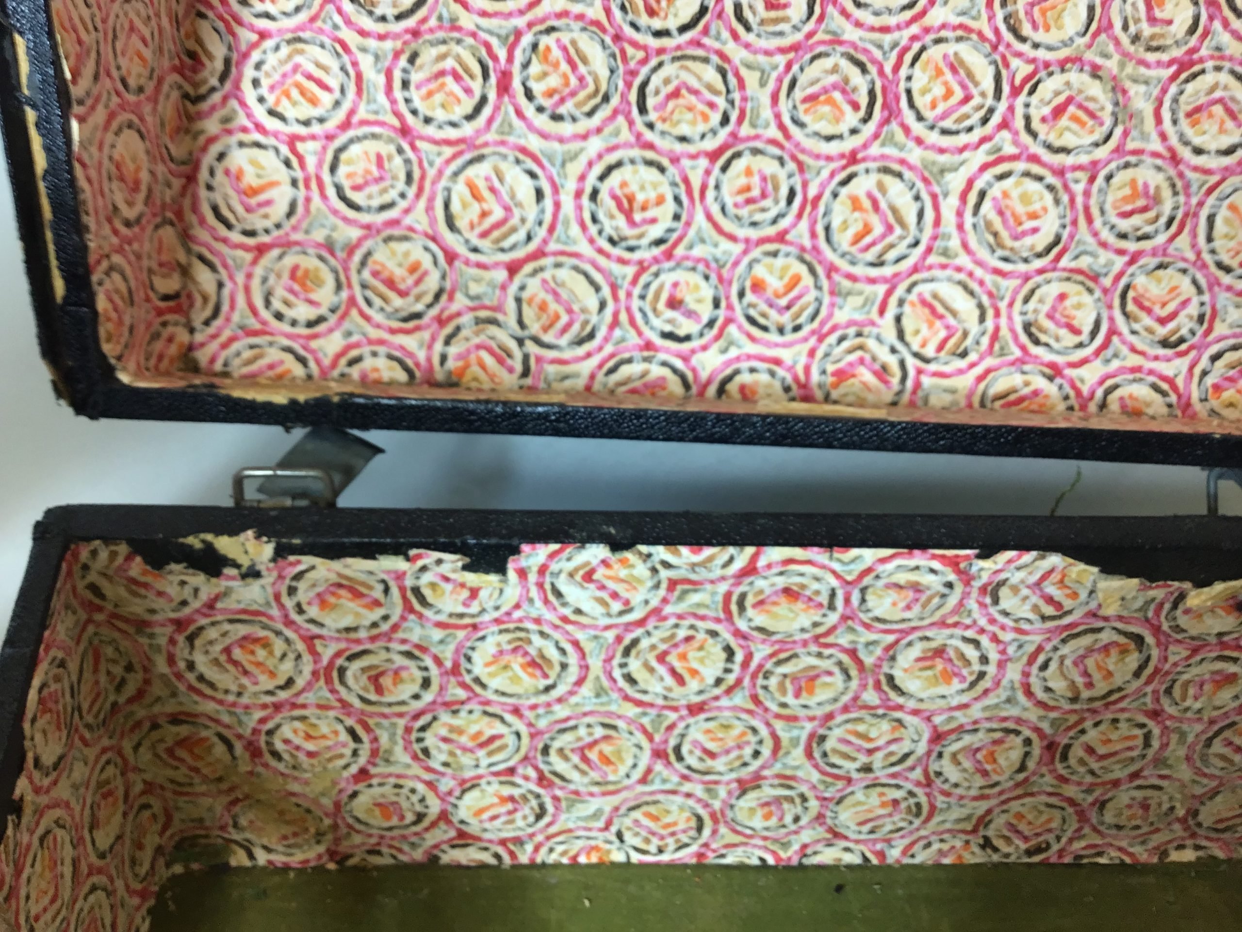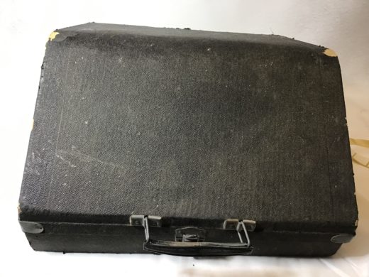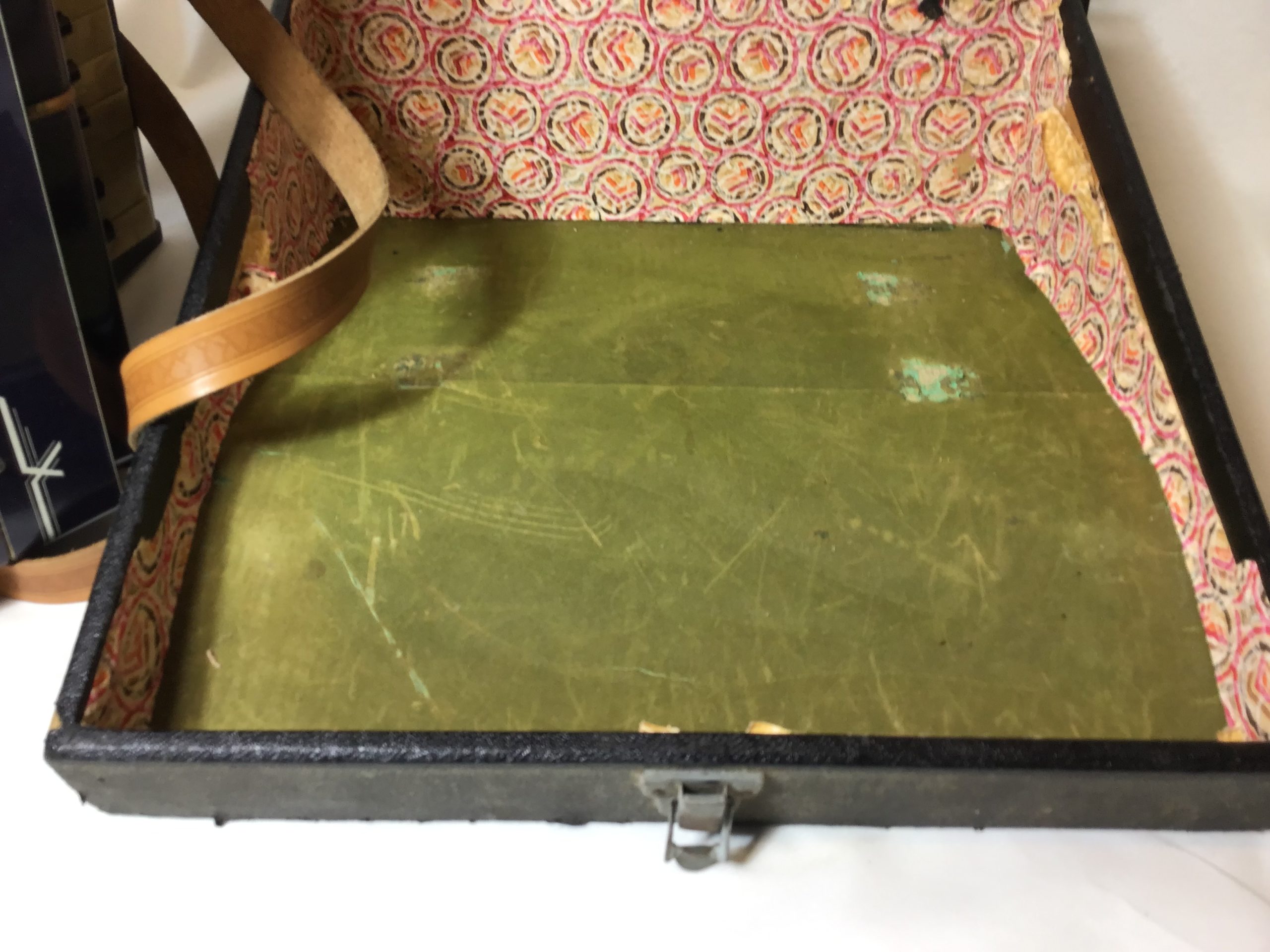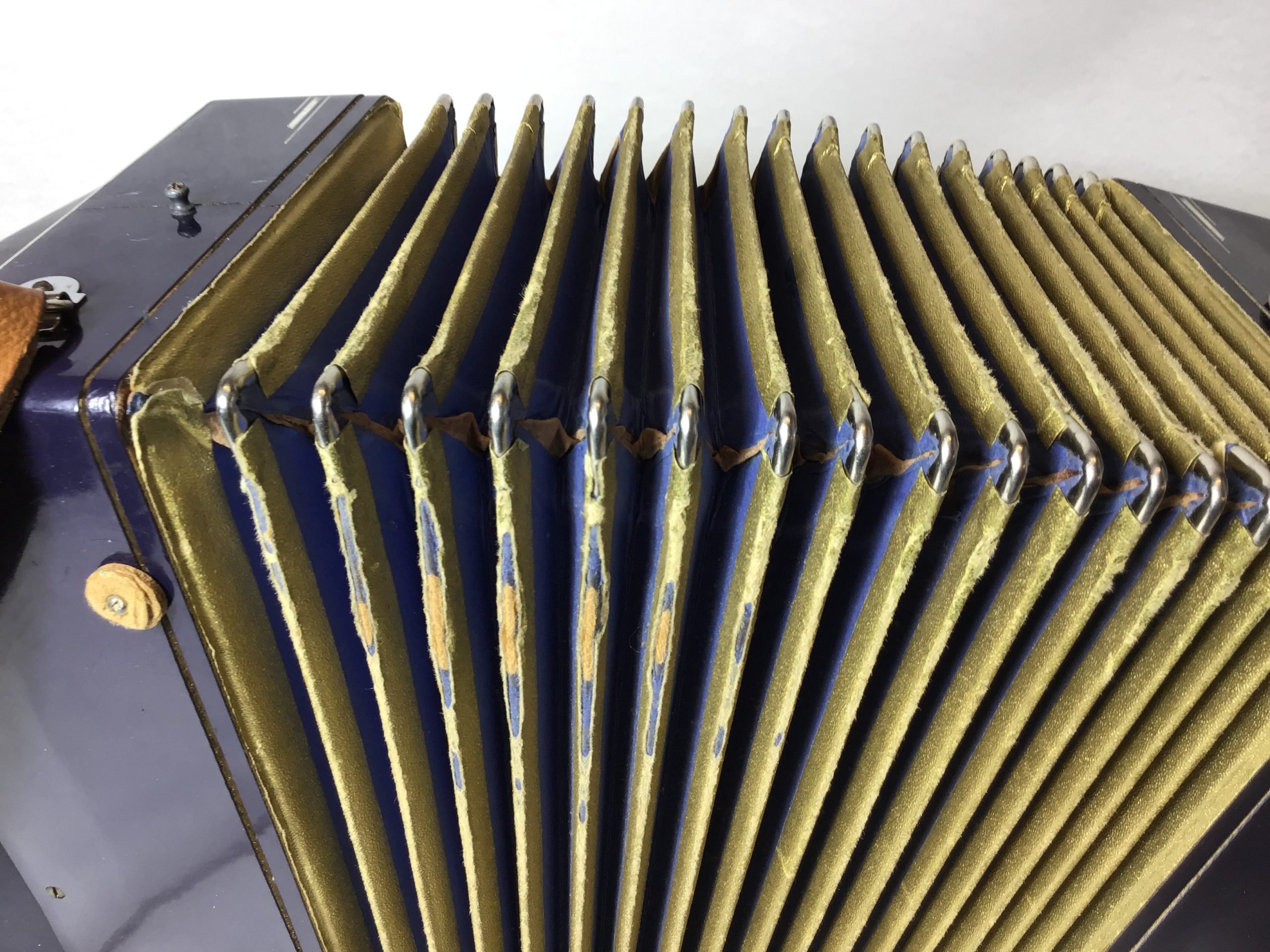 Casino harmonika. Kassen er i stykker i hængslet og i bunden, strop på harmonikaen er i stykker. Generelt mange brugsspor.