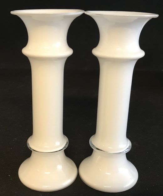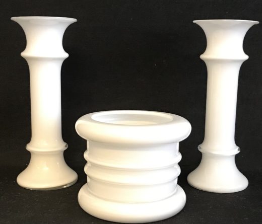 Mini Apoteker urtepotteskjuler i hvid opalglas H:7 cm samt 2 lysestager/vaser H: 14 cm.