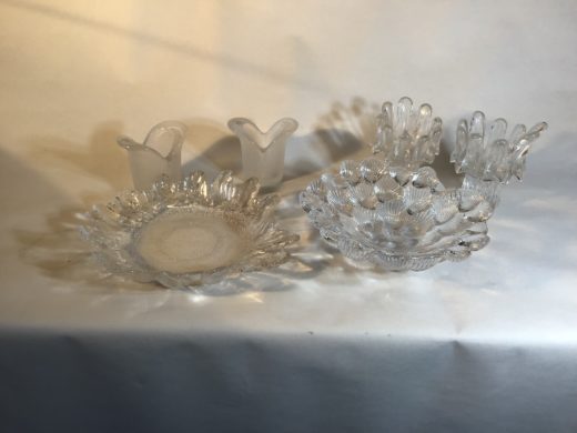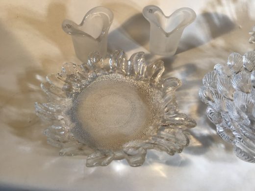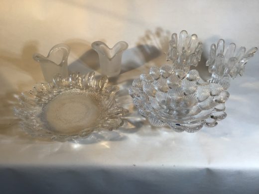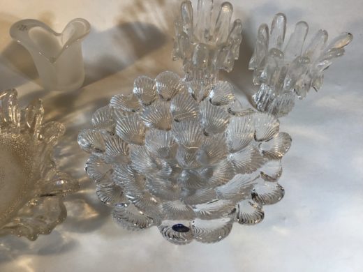 2 Kosta Boda lysestager, 2 holmegaard lysestager, 1 Holmegaard muslingefad og et fad uden mærke
