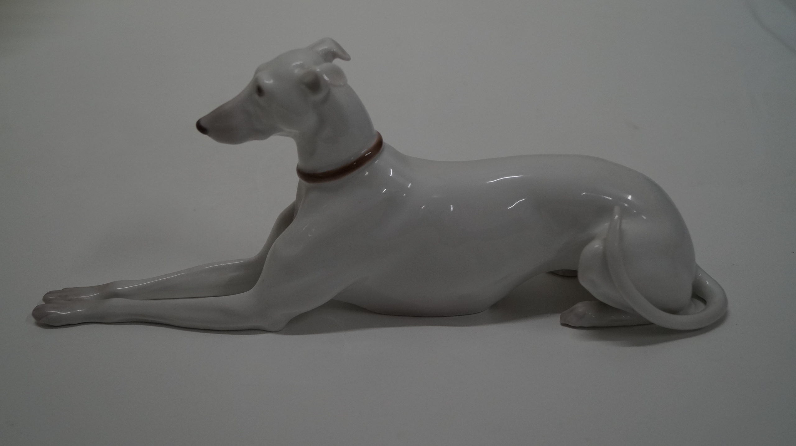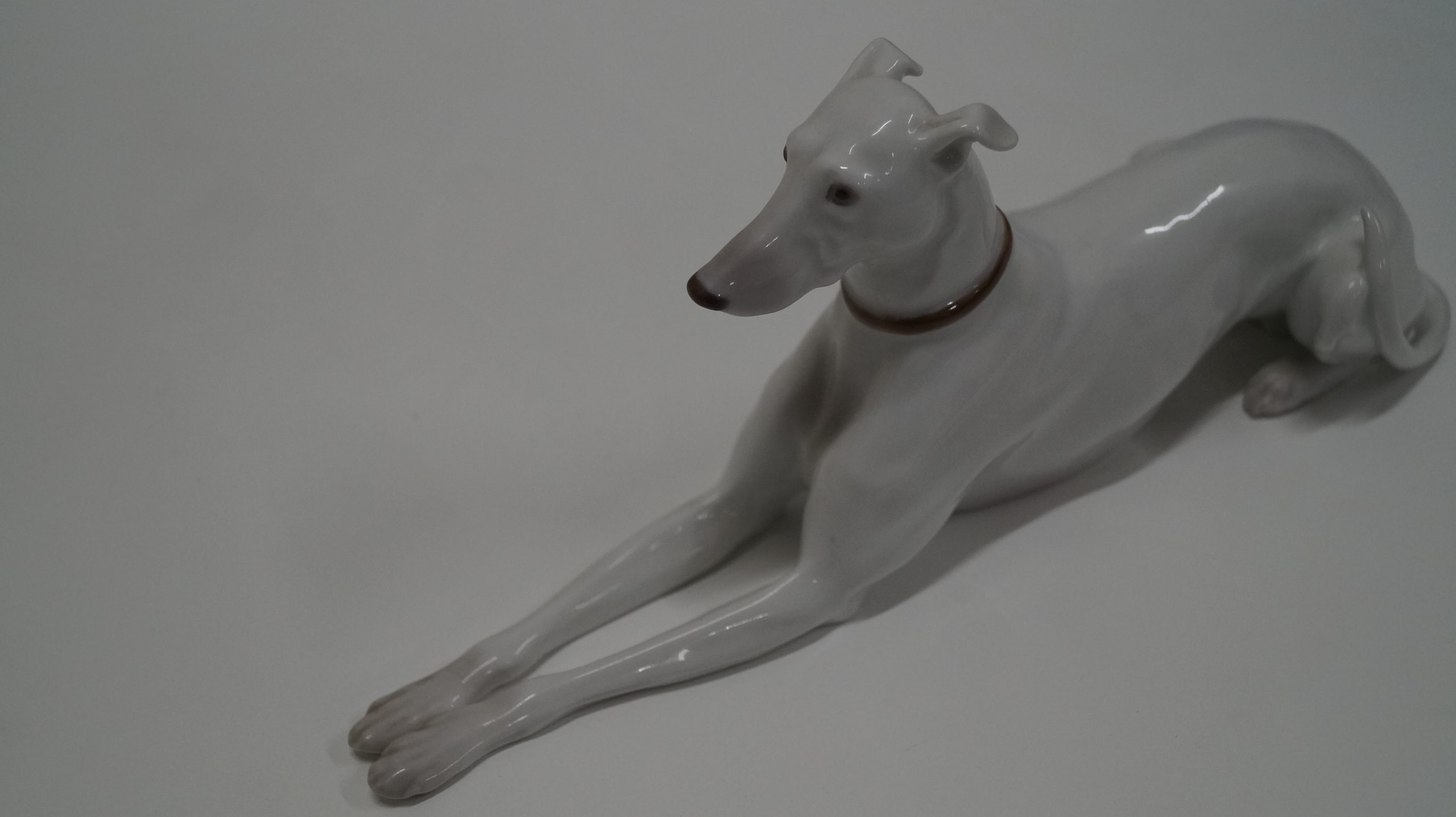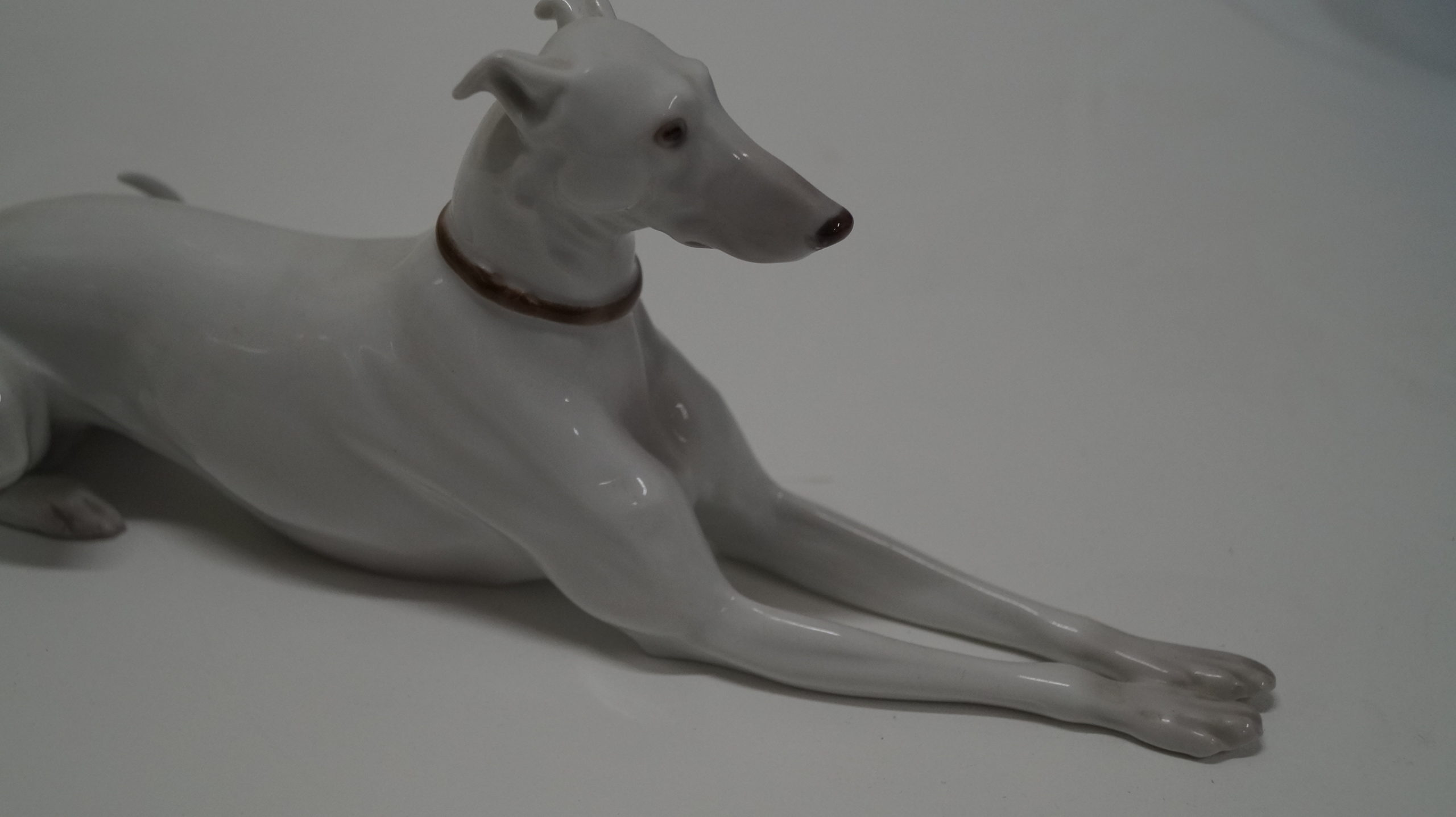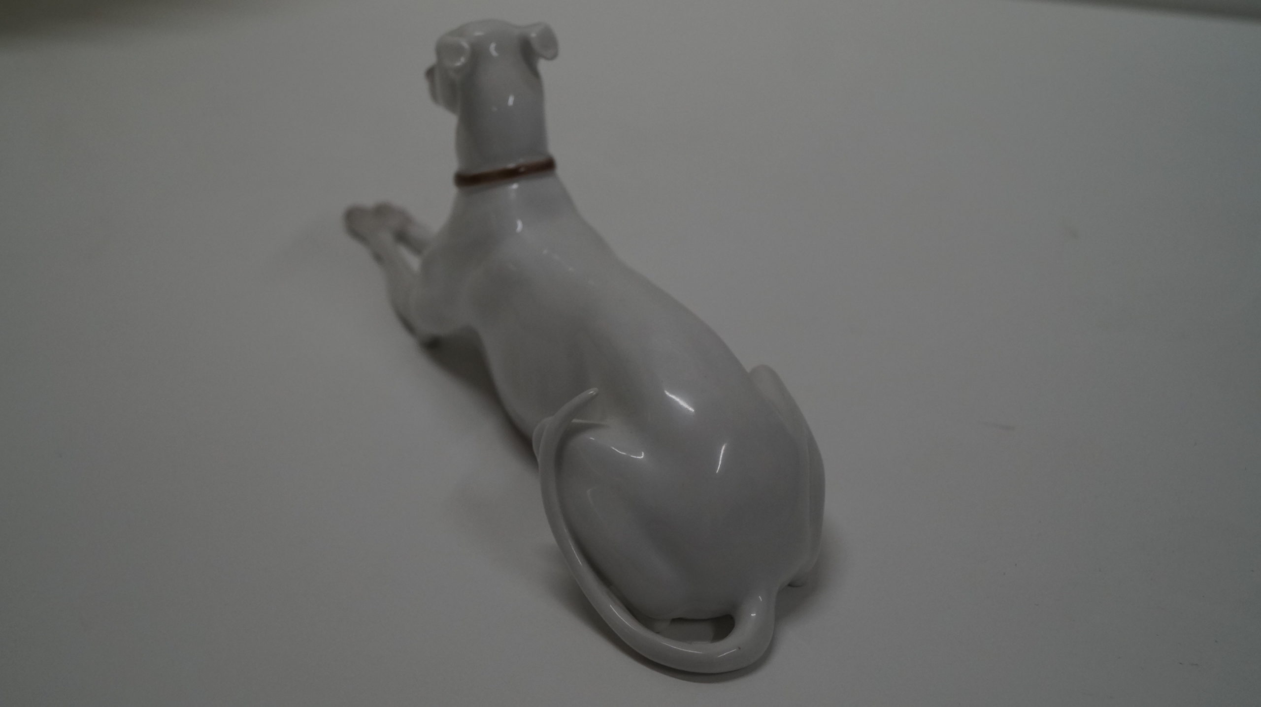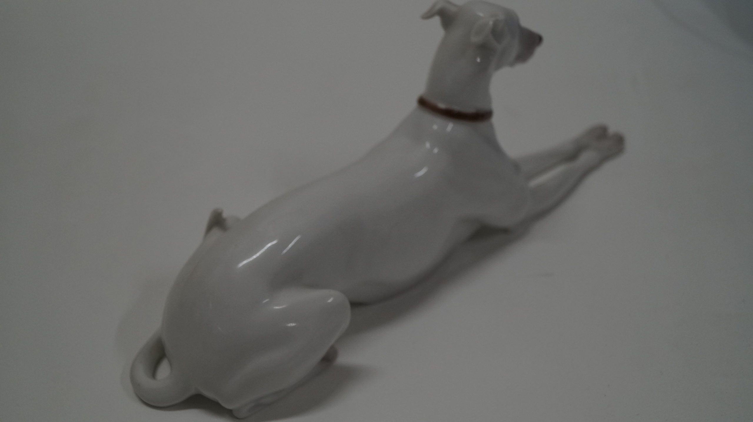 Fejlfri, hvid porcelænshund fra Den kongelige Porcelænsfabrik.