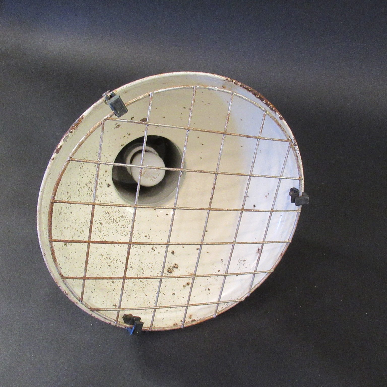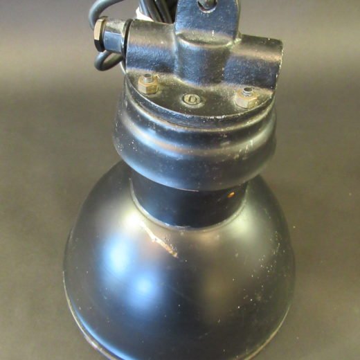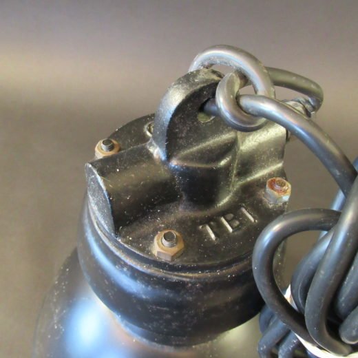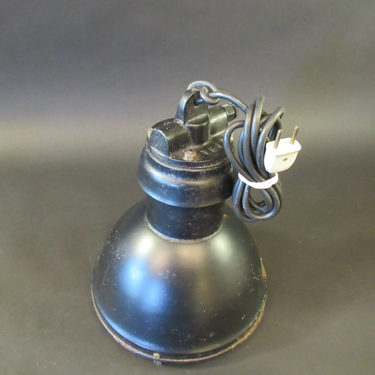 Industrilampe mærket TBI, der er monteret ledning med alm. stik.