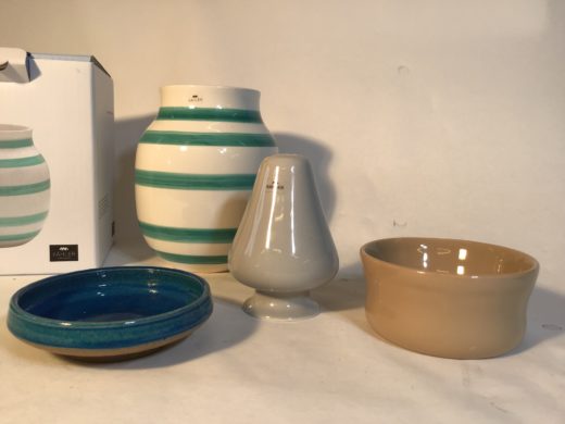 Vase H: 20 cm., Stage H: 13,5 cm., skål H: 6 cm., askebæger Ø: 13,5 cm.