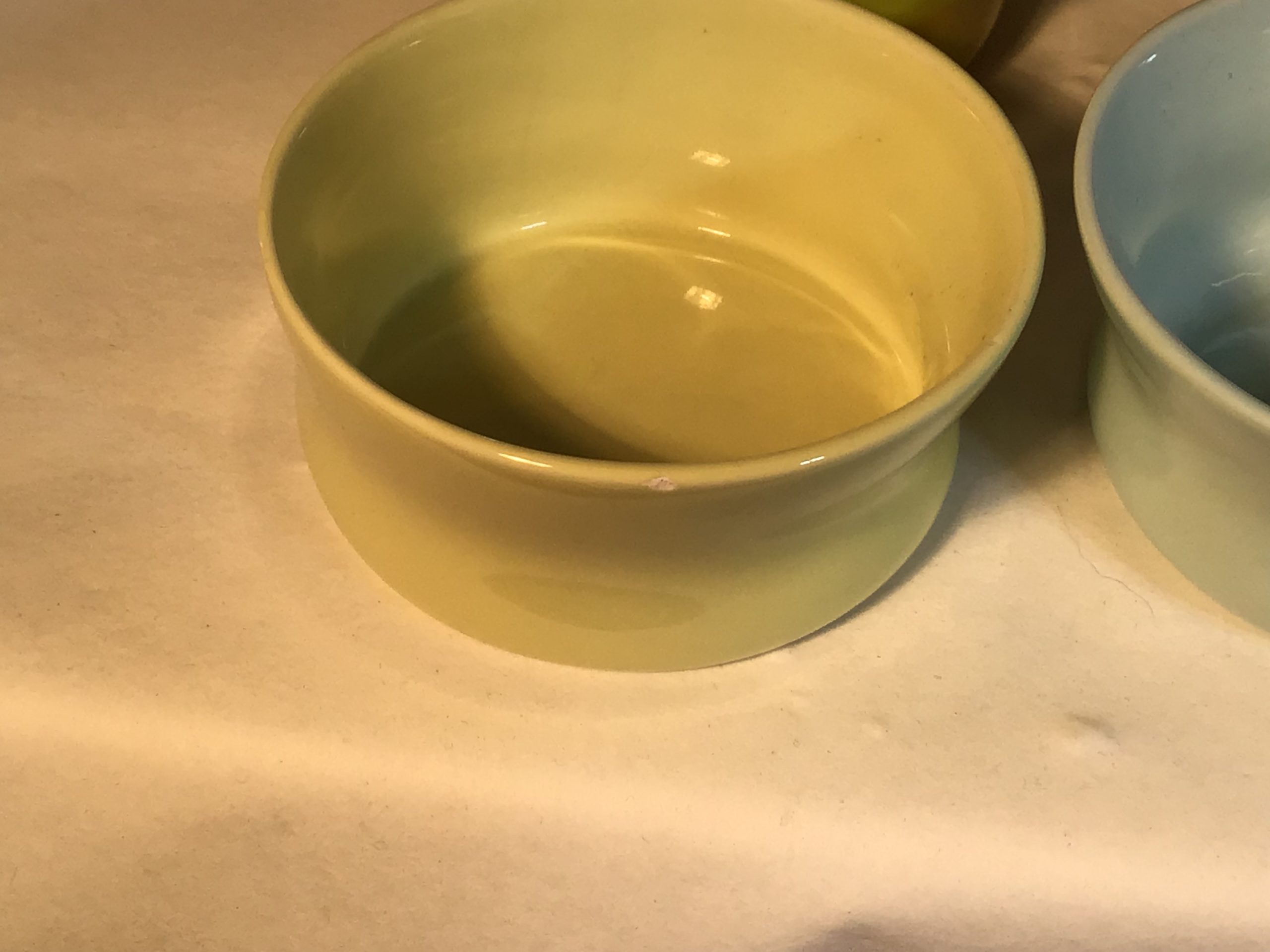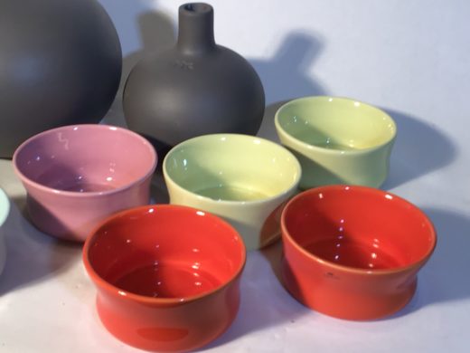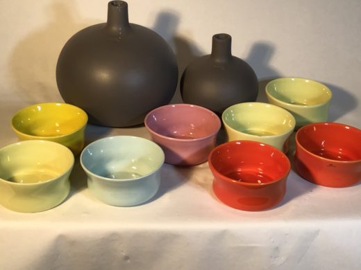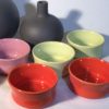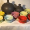 2 lysestager i forskellig størrelse samt 8 små skåle i forskellige farver- 2 med skår.