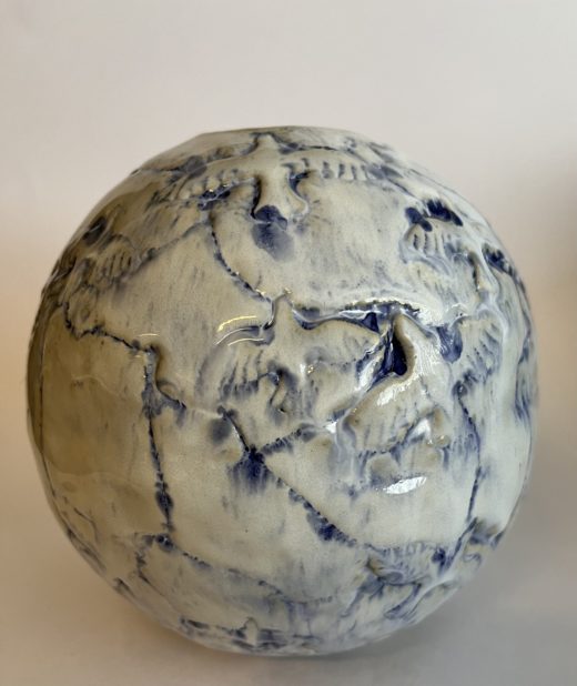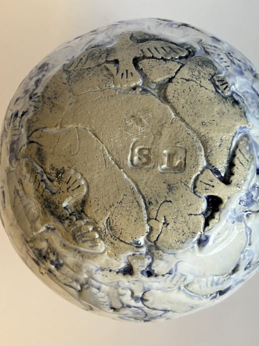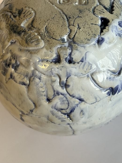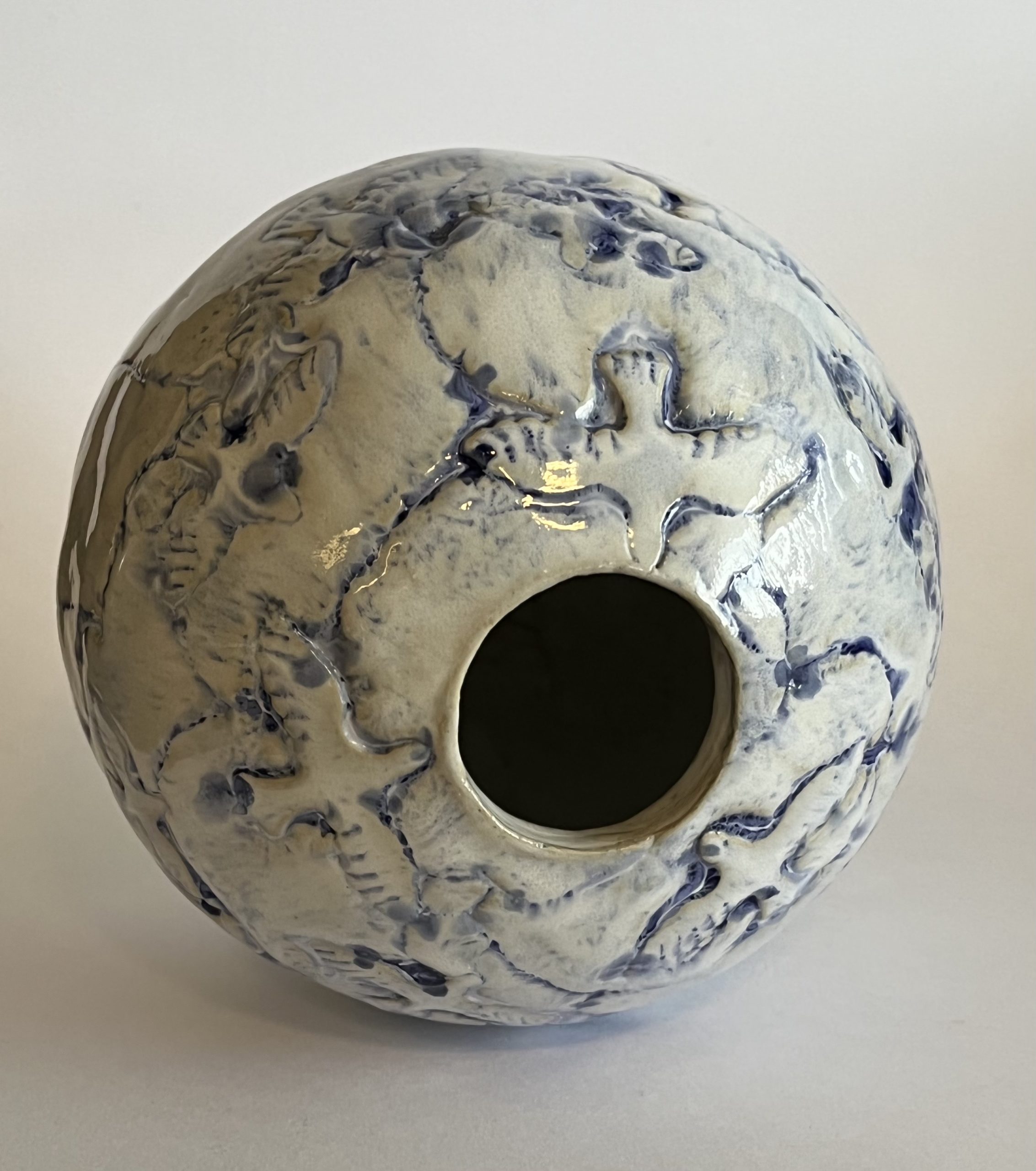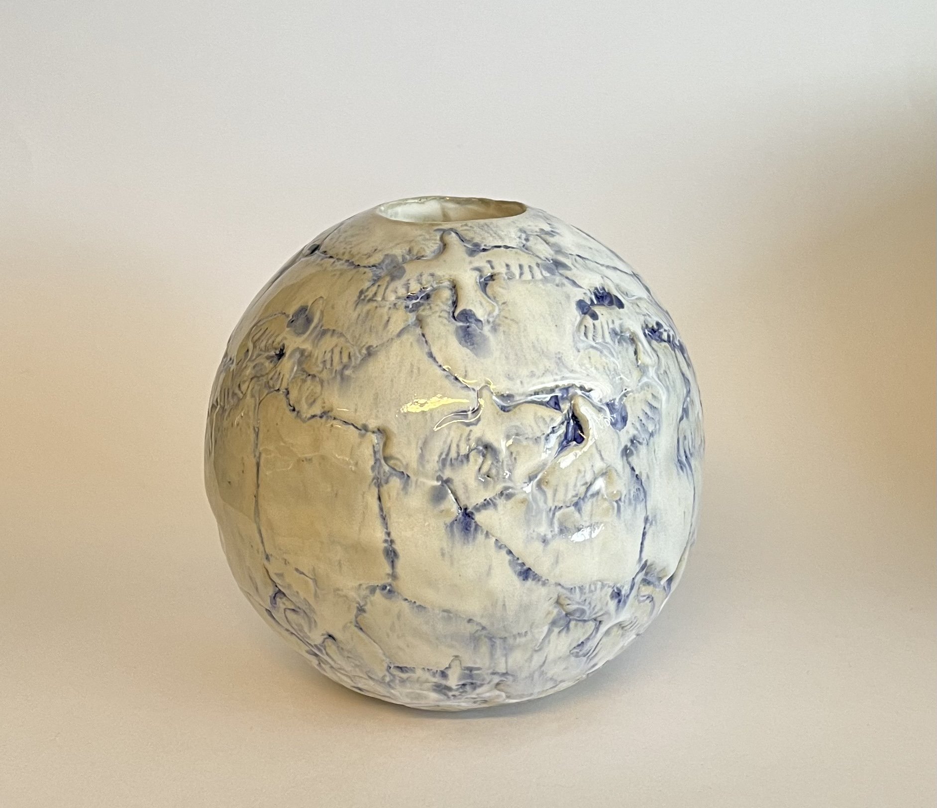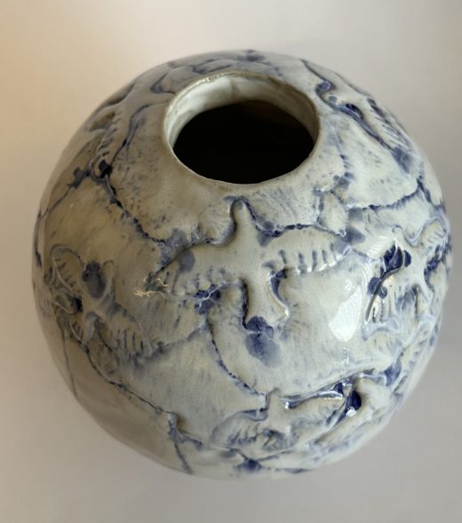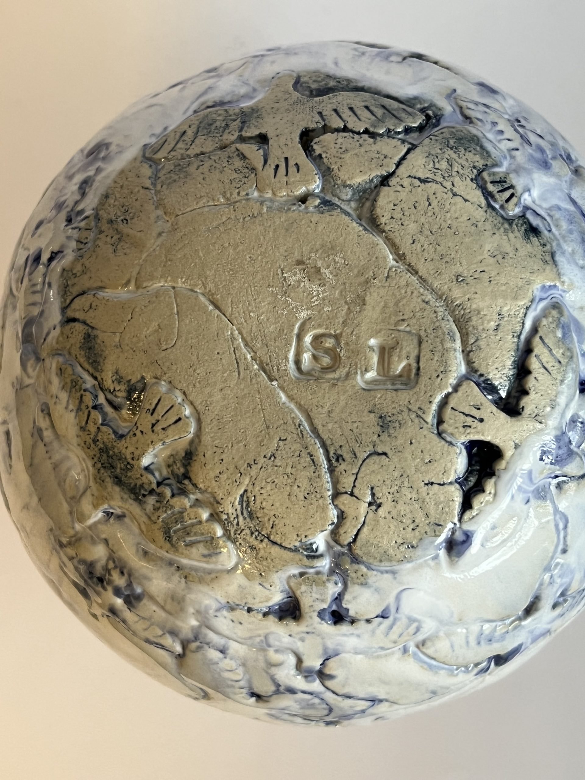 Kuglevase med fuglemotiv – hvid/blå glasur.