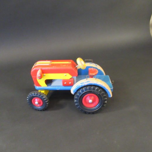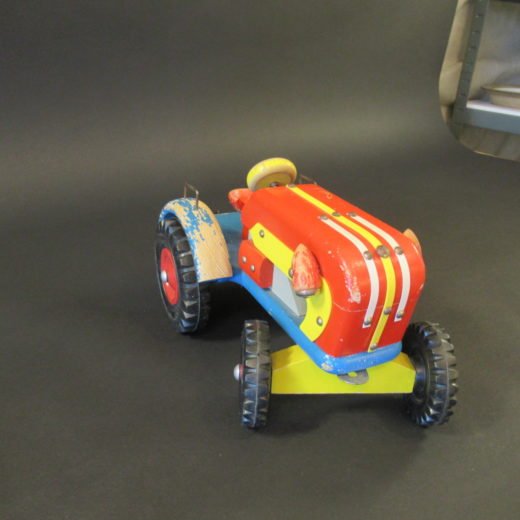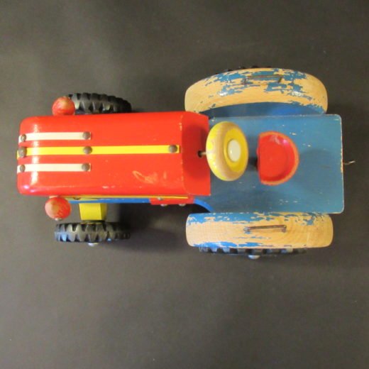 Gammel, legetøjstraktor udformet i træ, hjul af plastik.