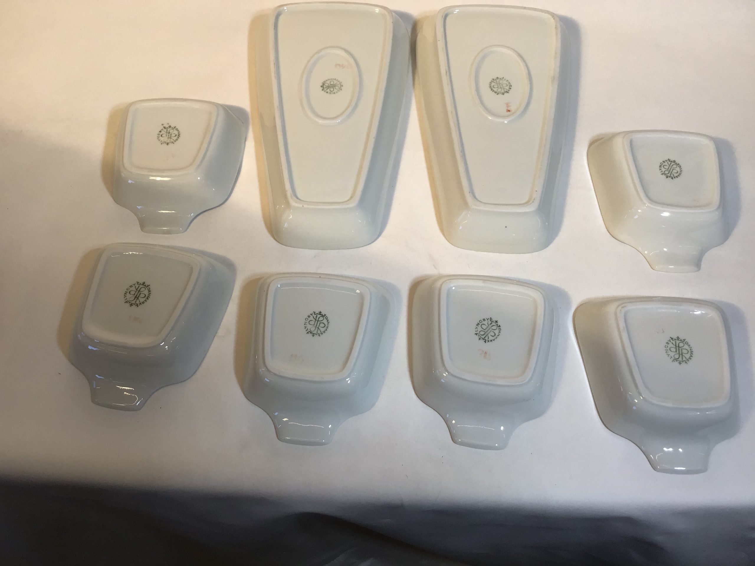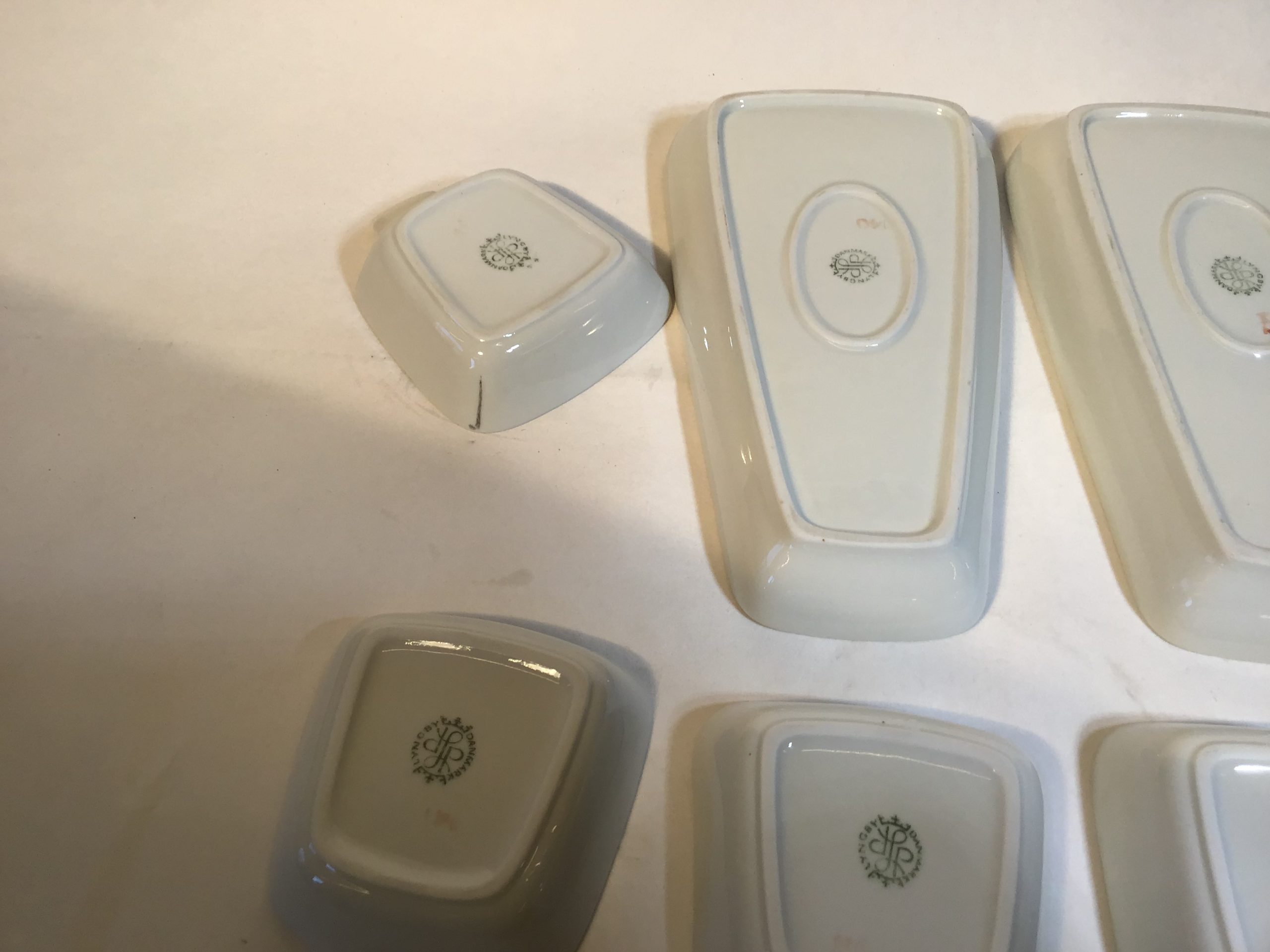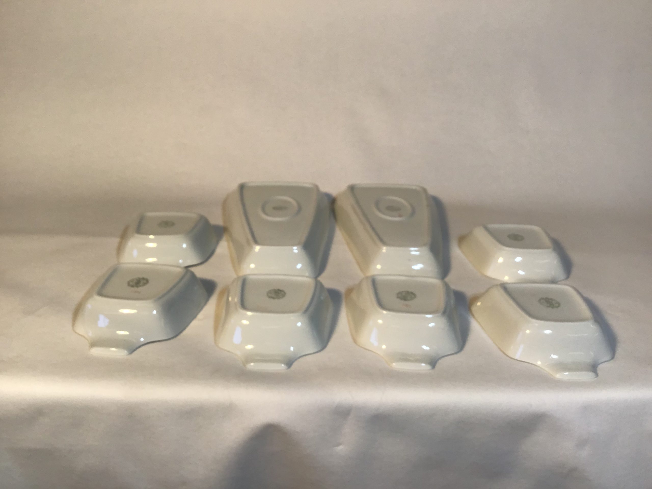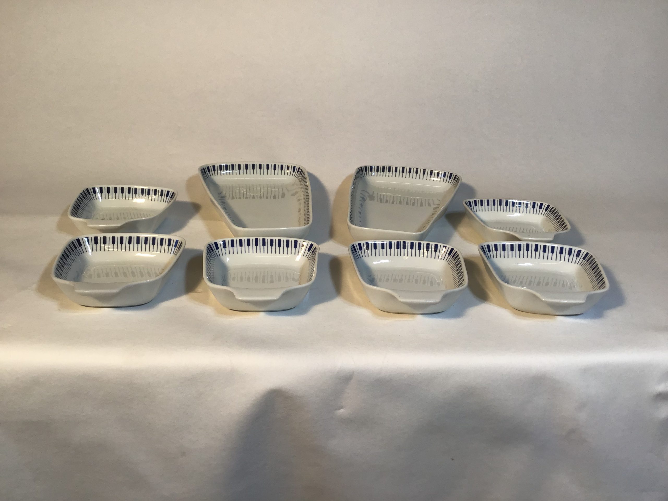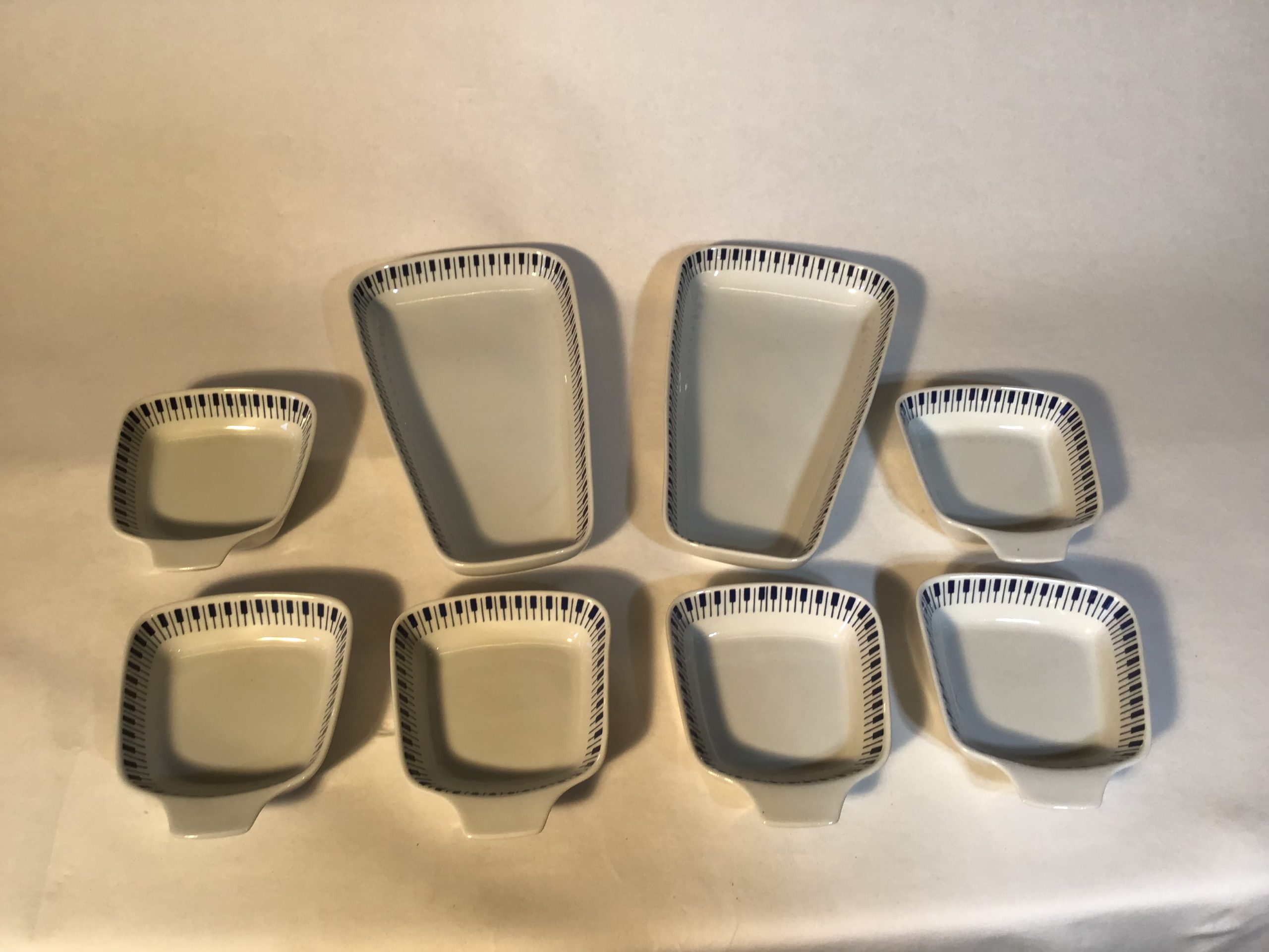 2 store og 4 små med blå kant. Der er en streg på det ene, se billede