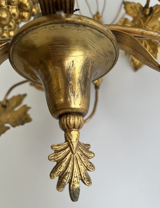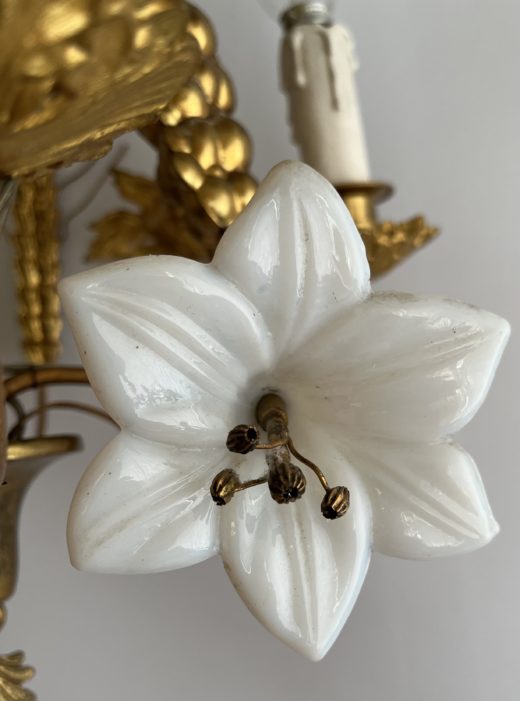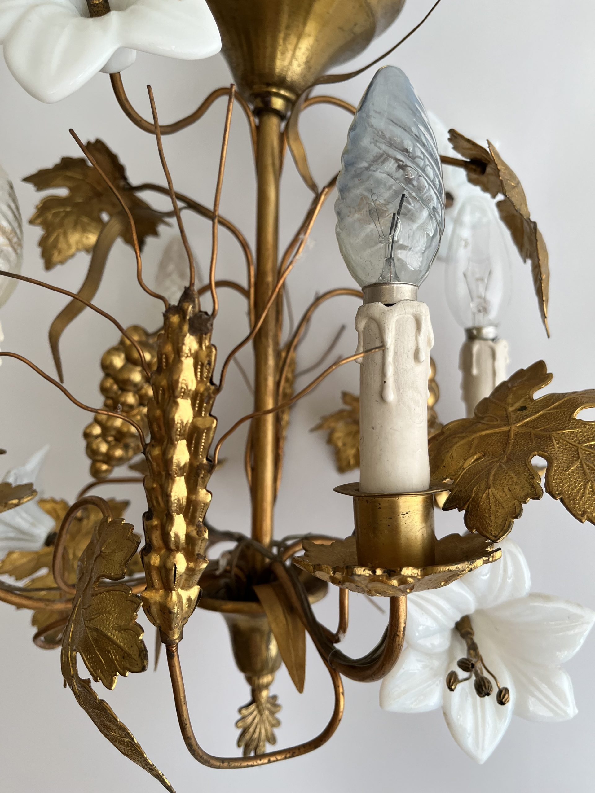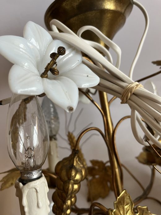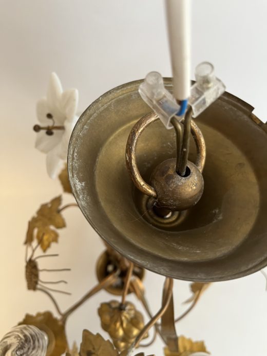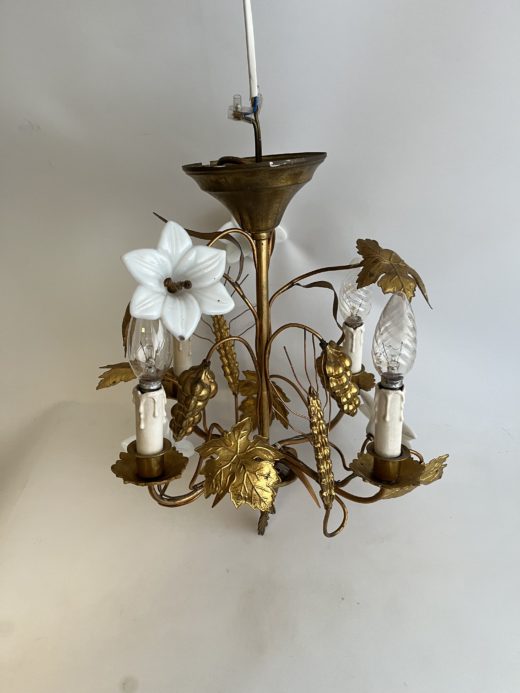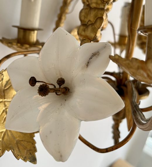 Lysekrone i fransk stil med glasblomster og fine detaljer.