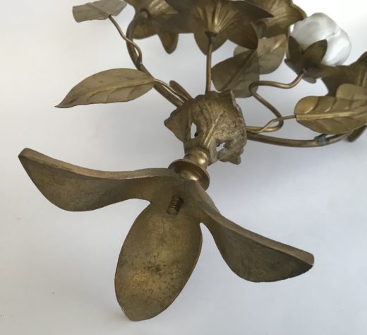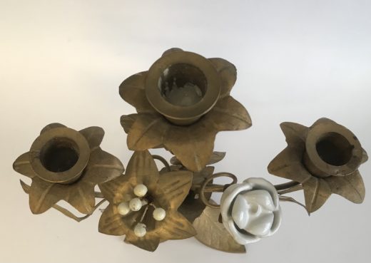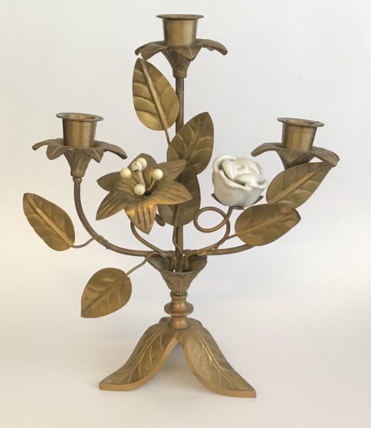Lysestage med porcelænsrose. H: 29,5 cm – B: midt 25 cm.