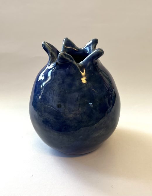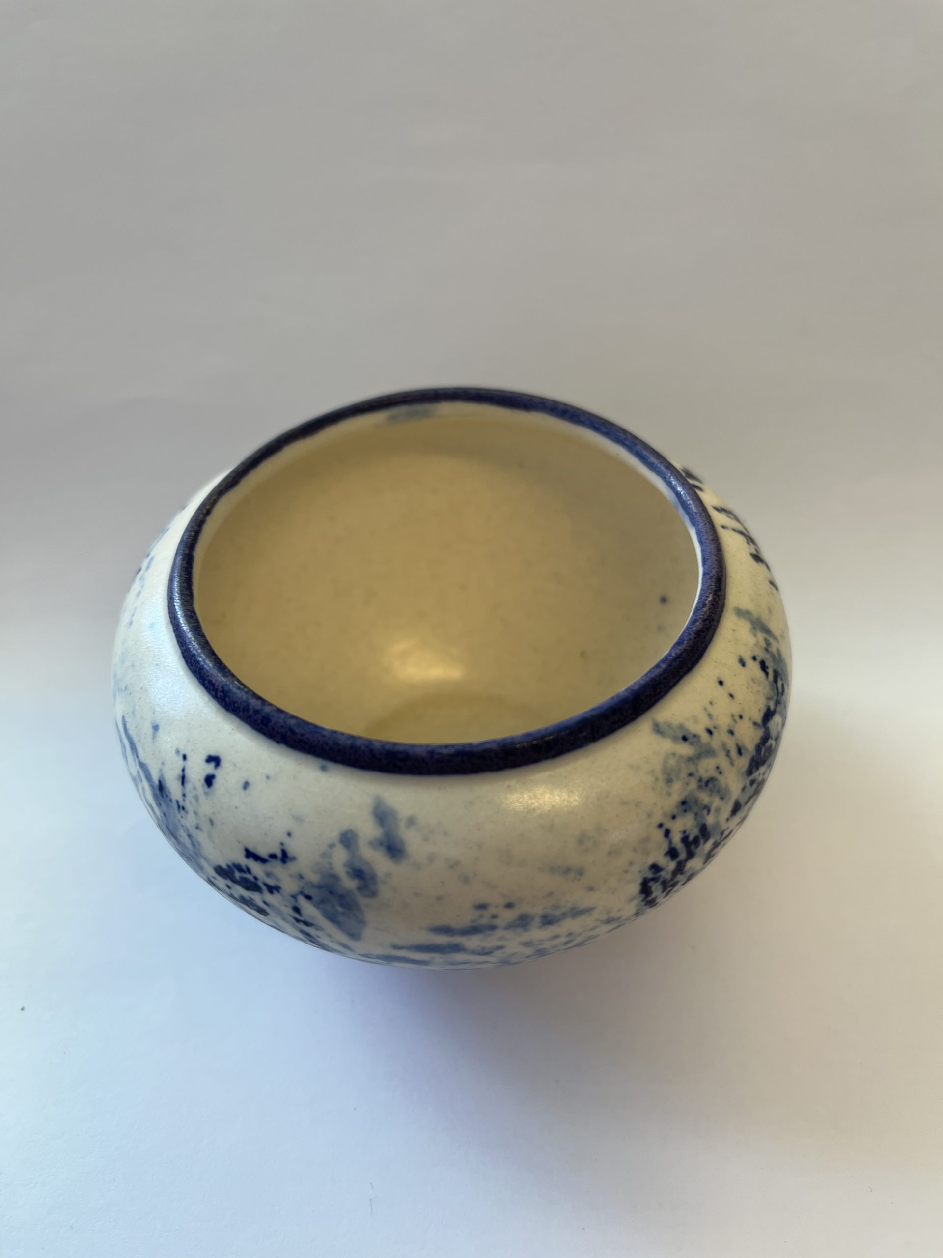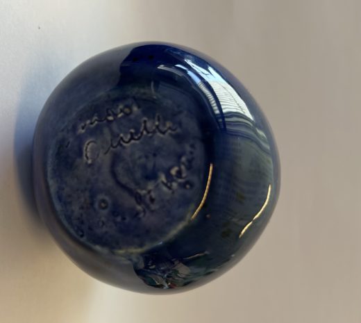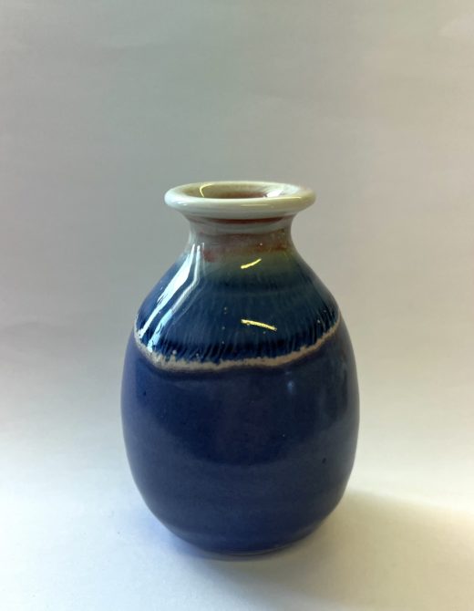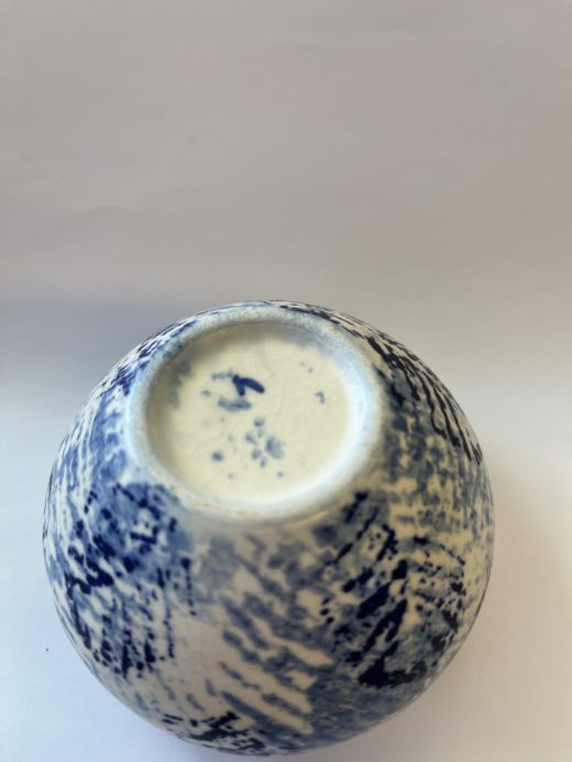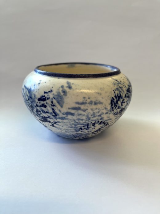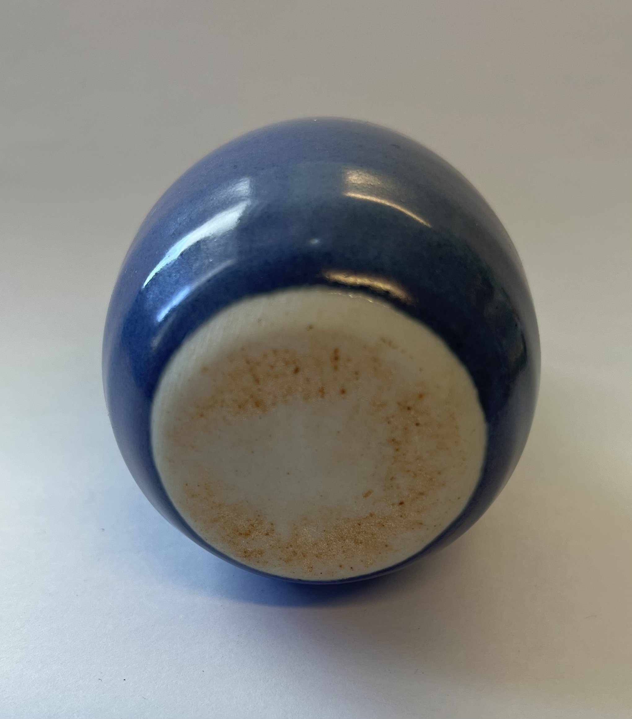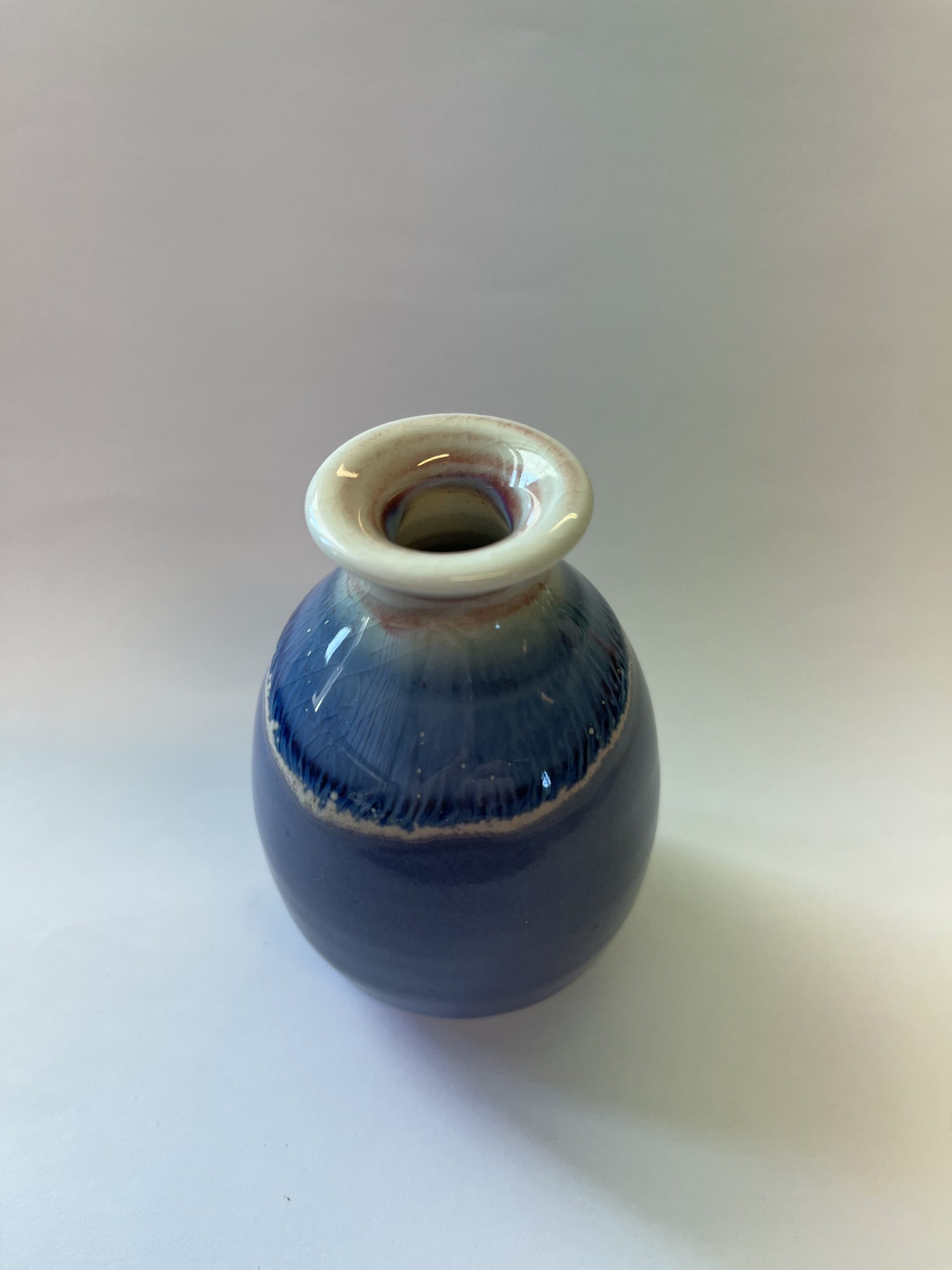 Blå flerfarvet vase H: 8 cm – Bredde midt: 6 cm. Har glasurkrakkeleringer.