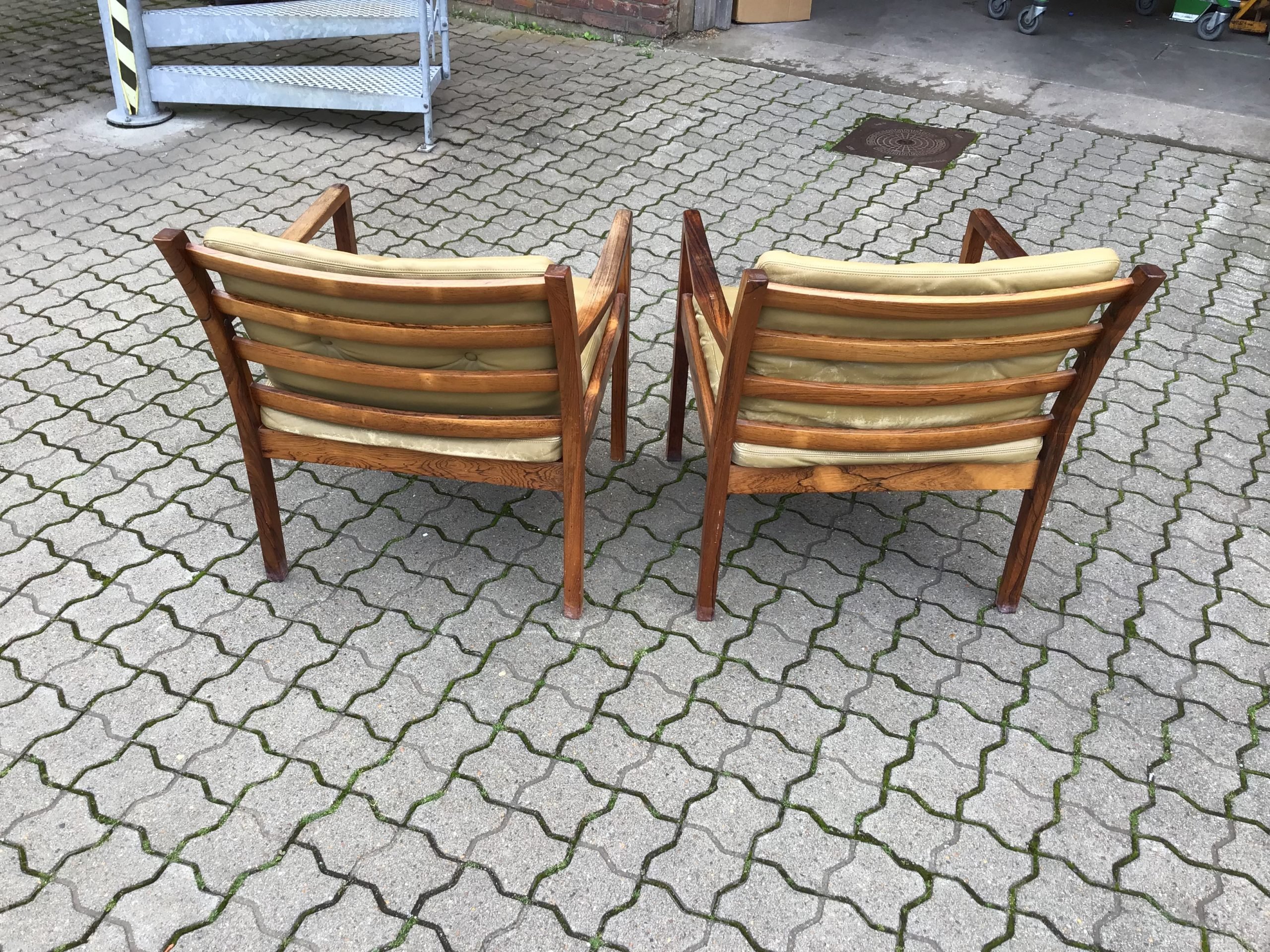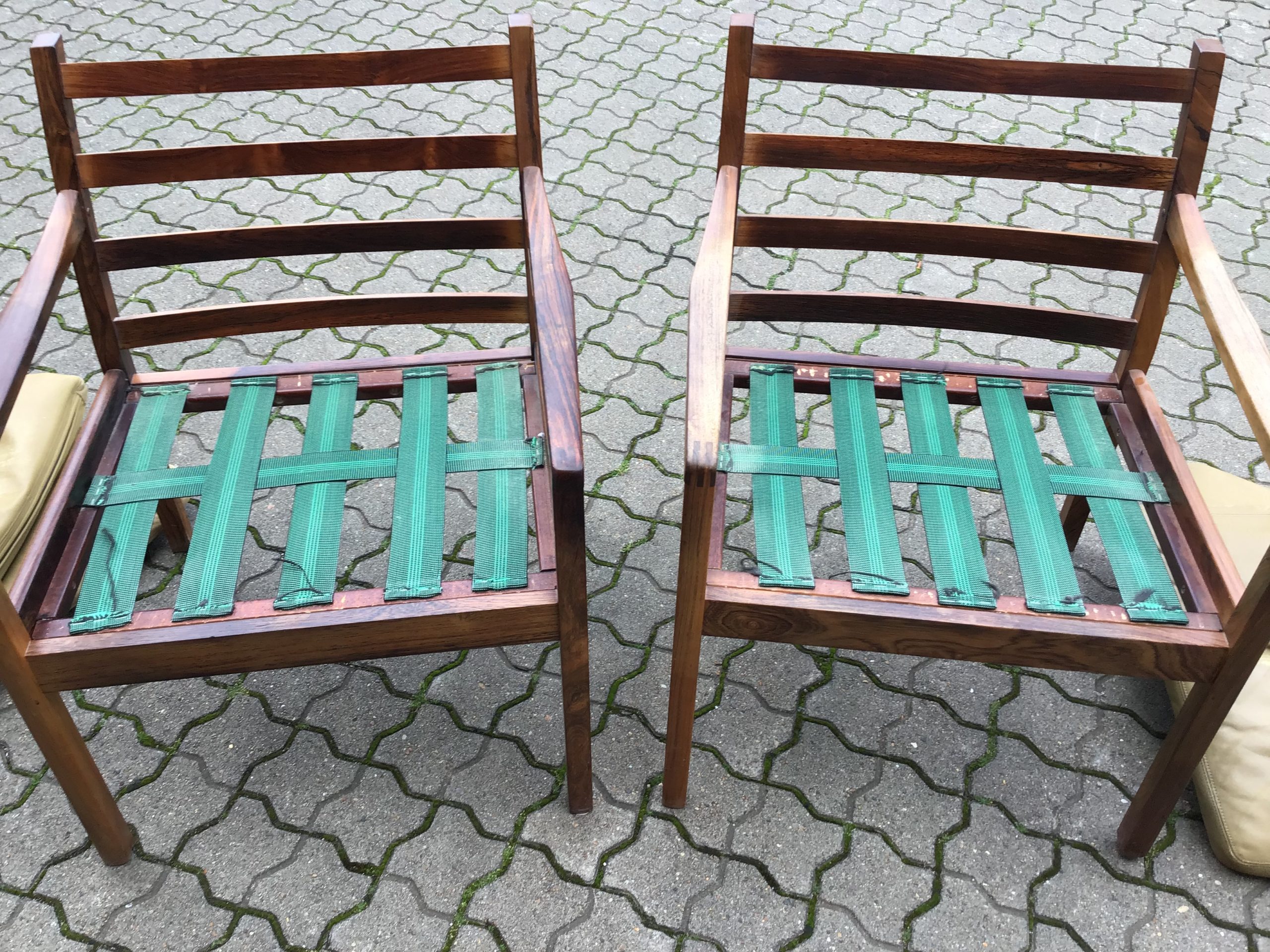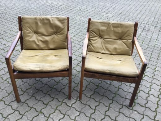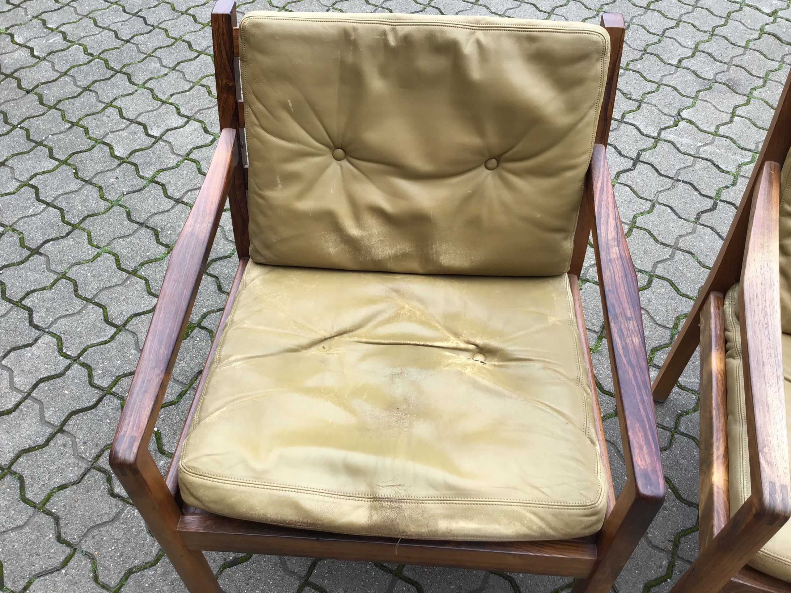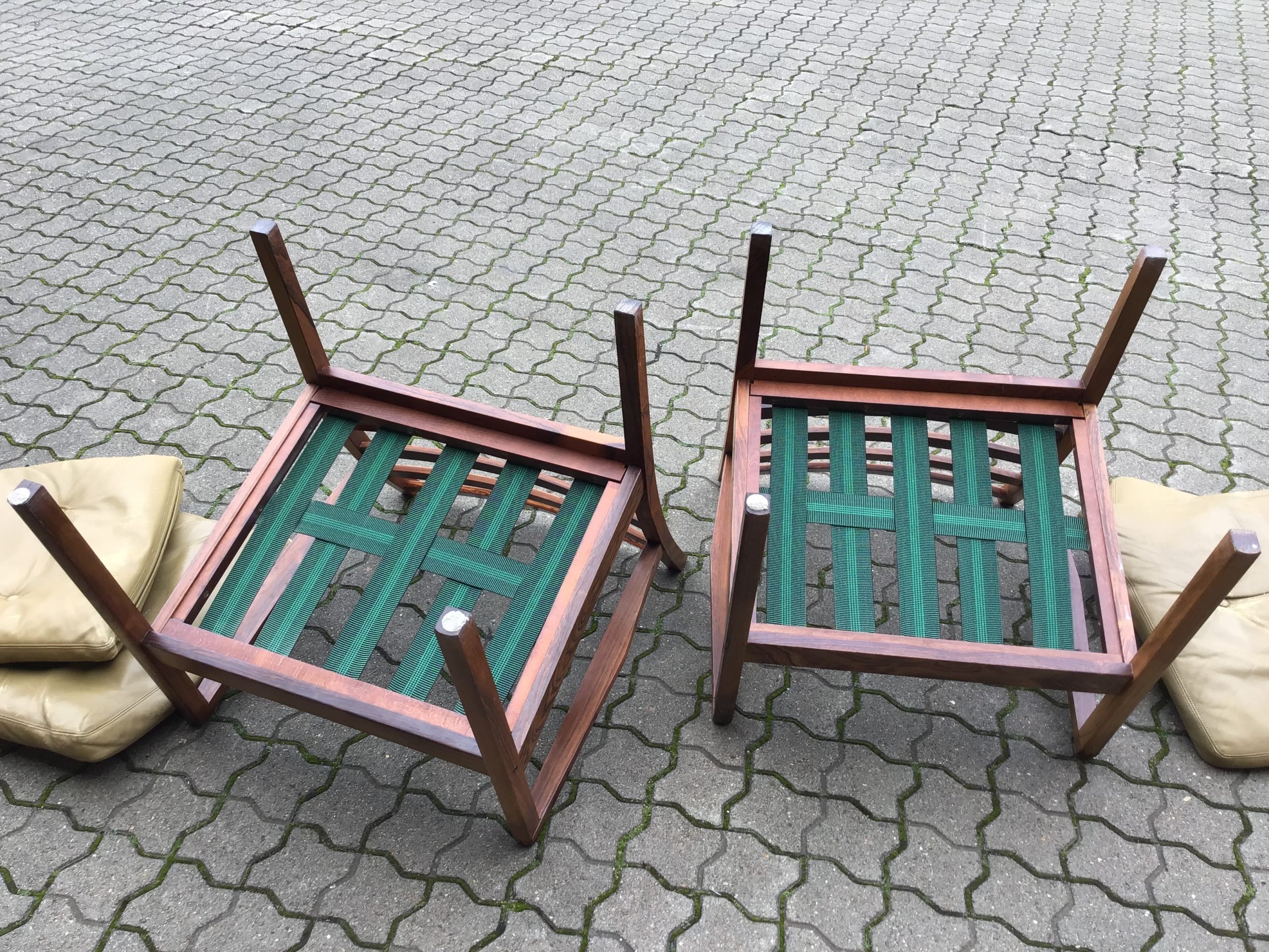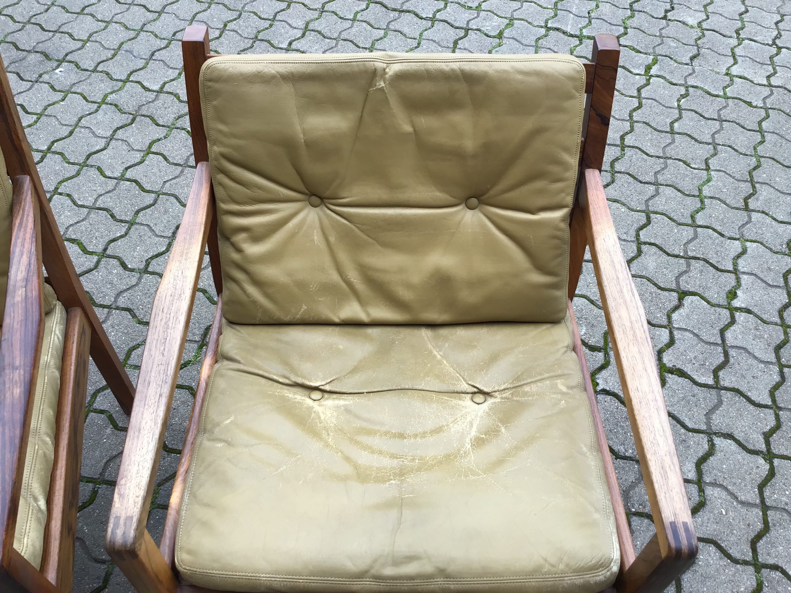 2 lænestole i palisandertræ med læderhynder. Hynderne trænger til istandsættelse- se billeder.