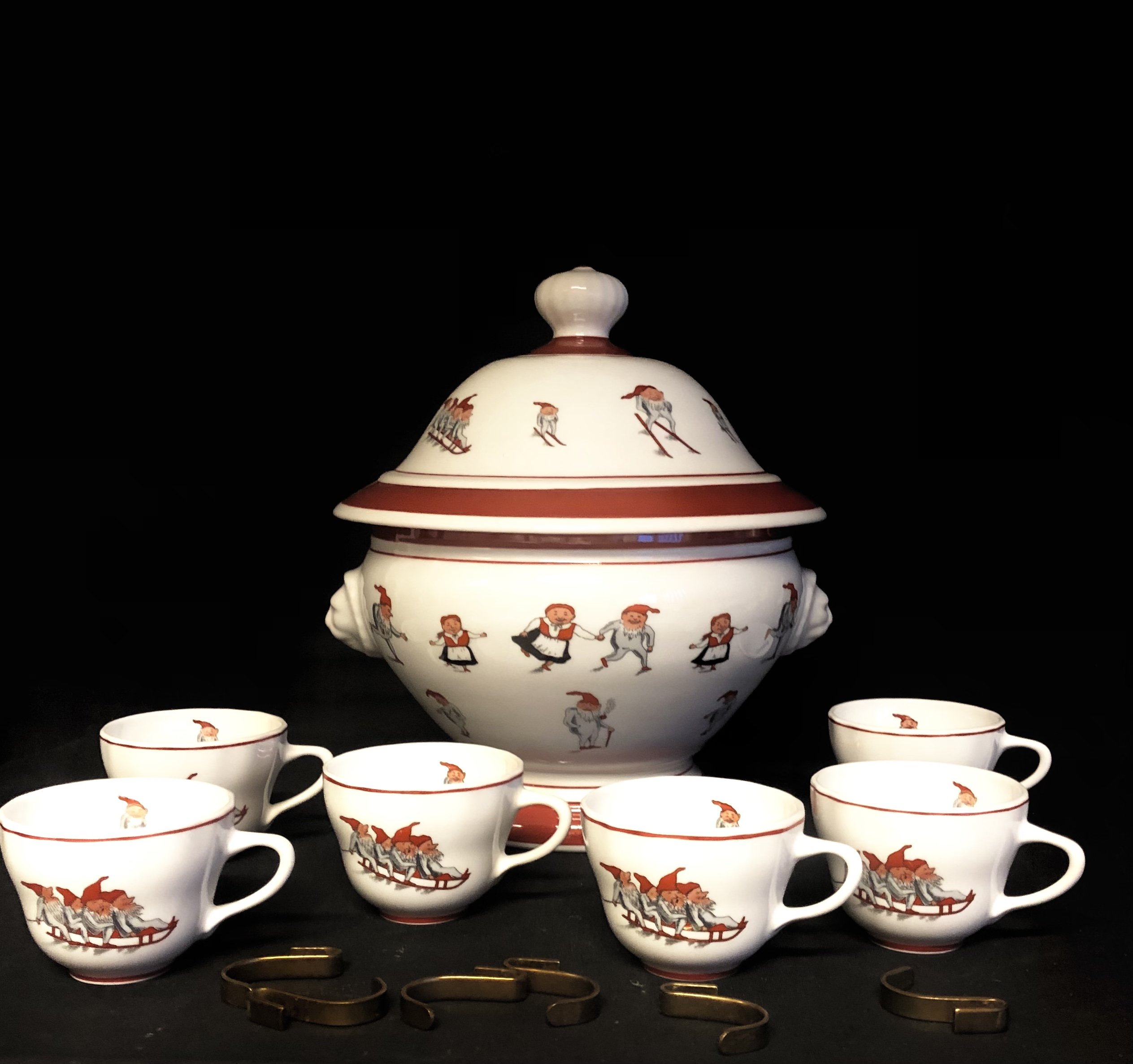 Juleterrin med nissemotiv, kopper samt messingkroge til ophæng.