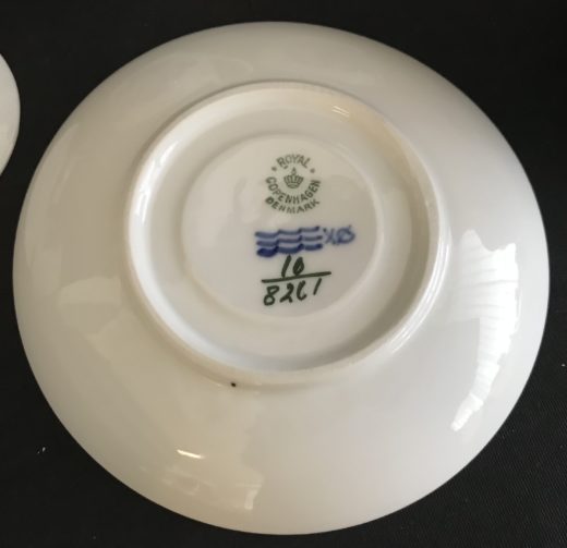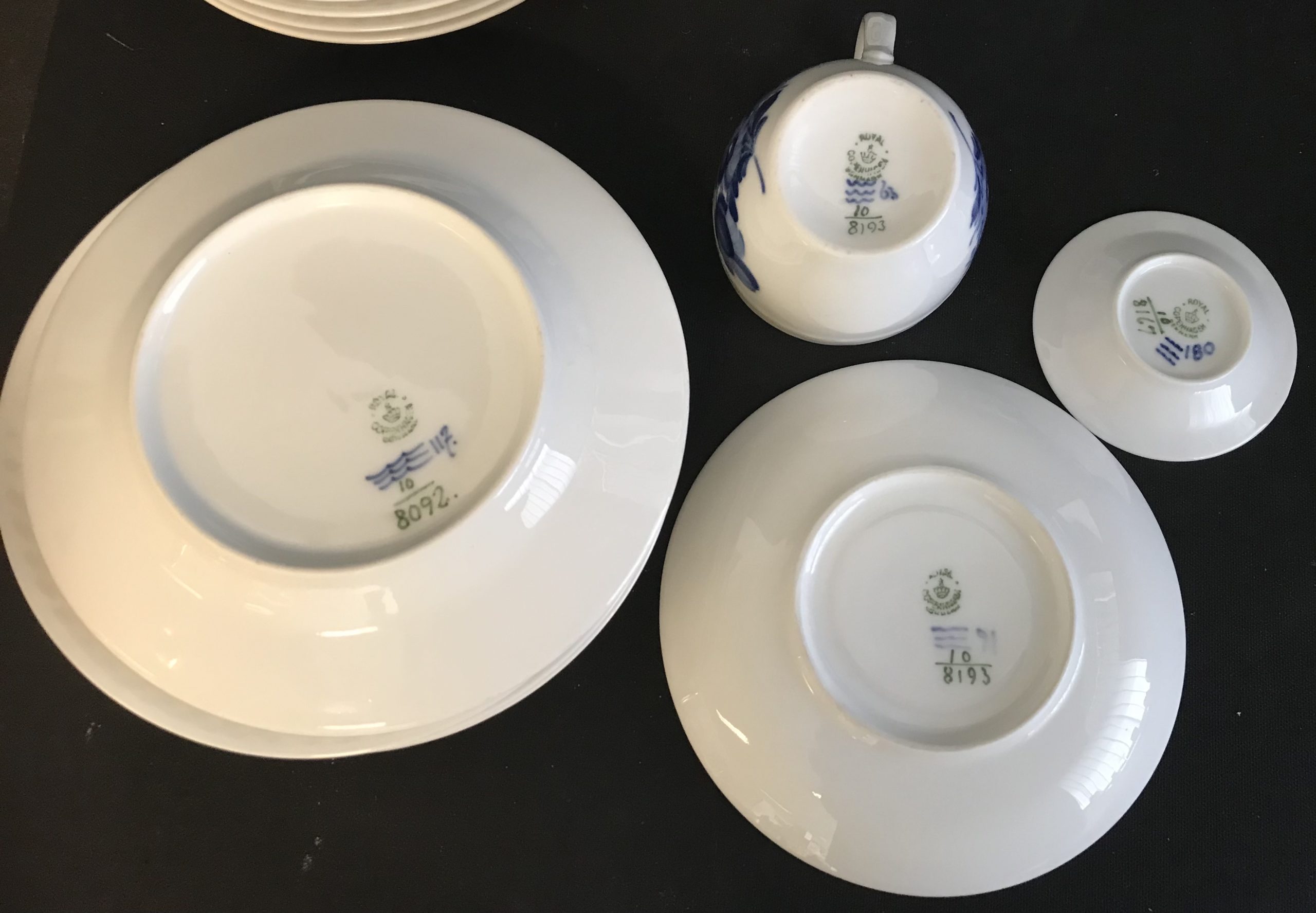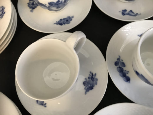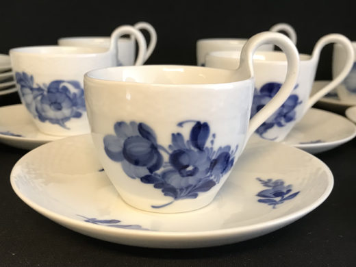 Royal Copenhagen Blå Blomst flettet: 7 kaffekopper, 7 underkopper, 8 kagetallerkener & 1 asiet. Underkopper består af 2 stk 10-8261 og 5 stk #10-8193.