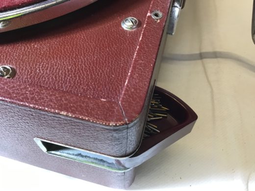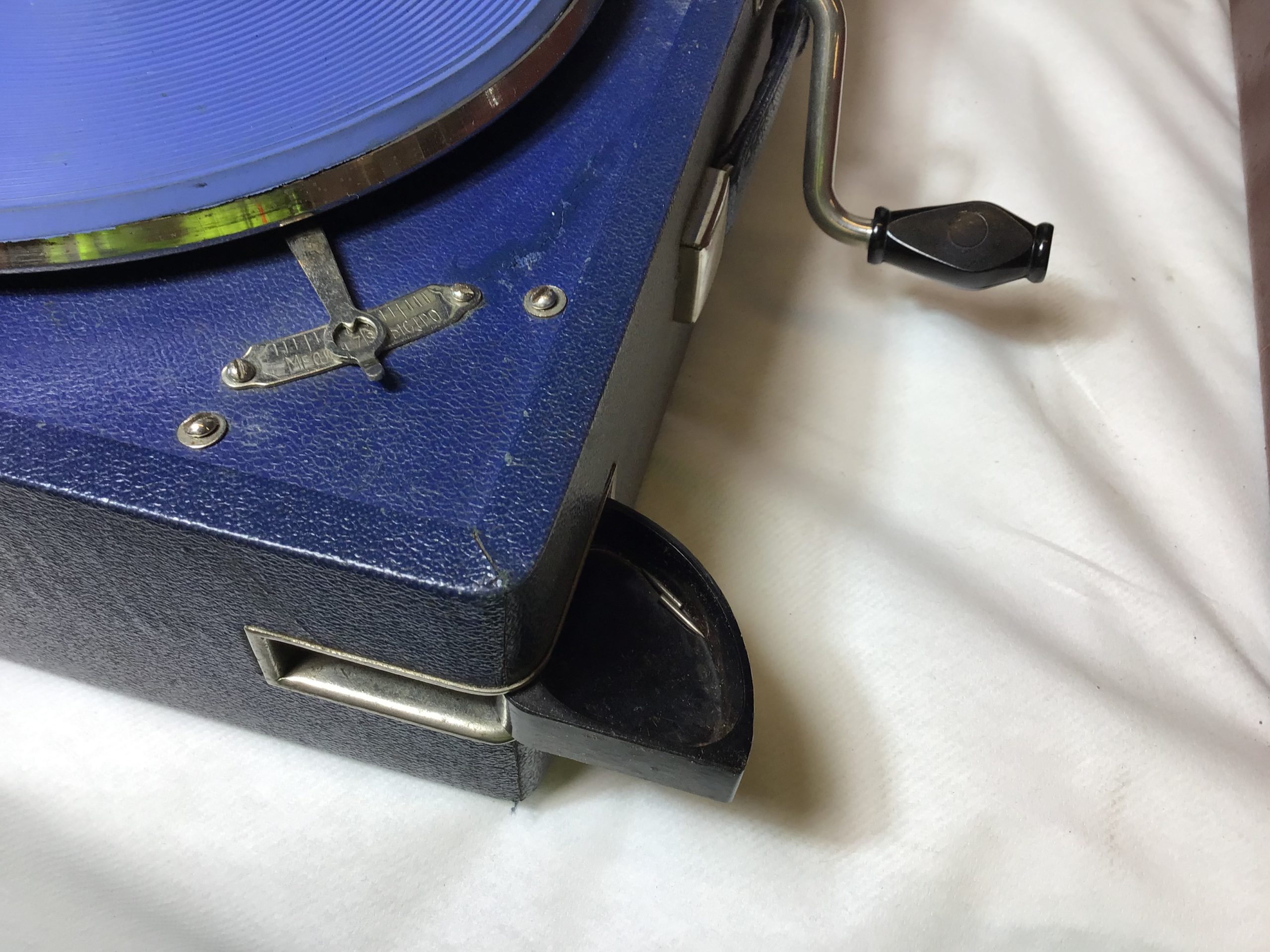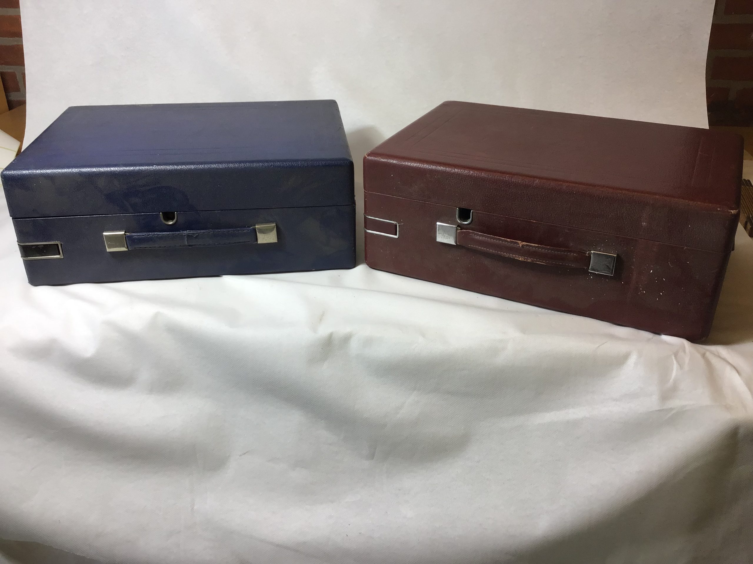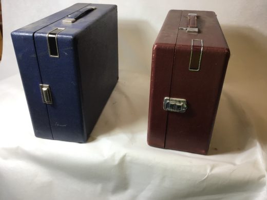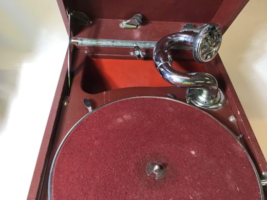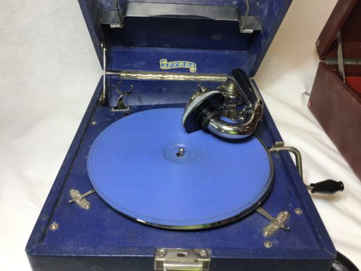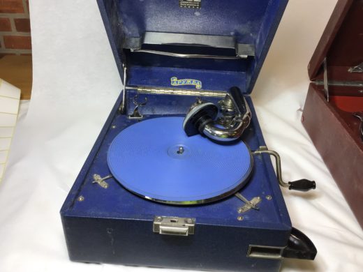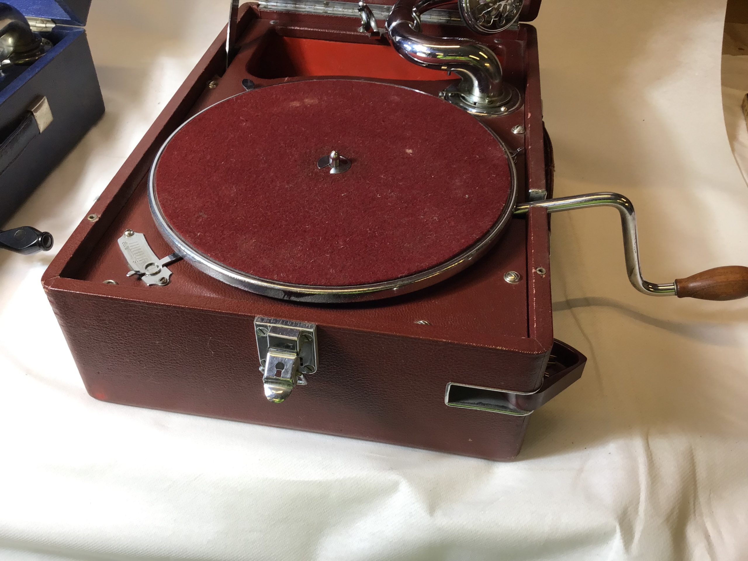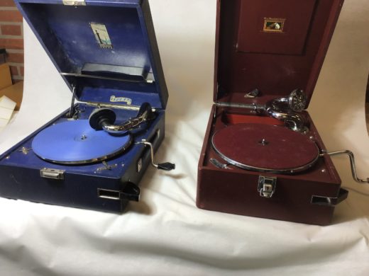 2 rejsegrammofoner med håndsving. Ikke testet.