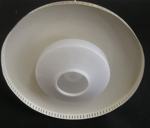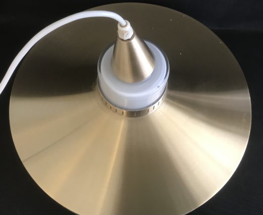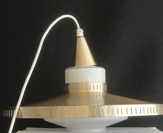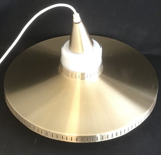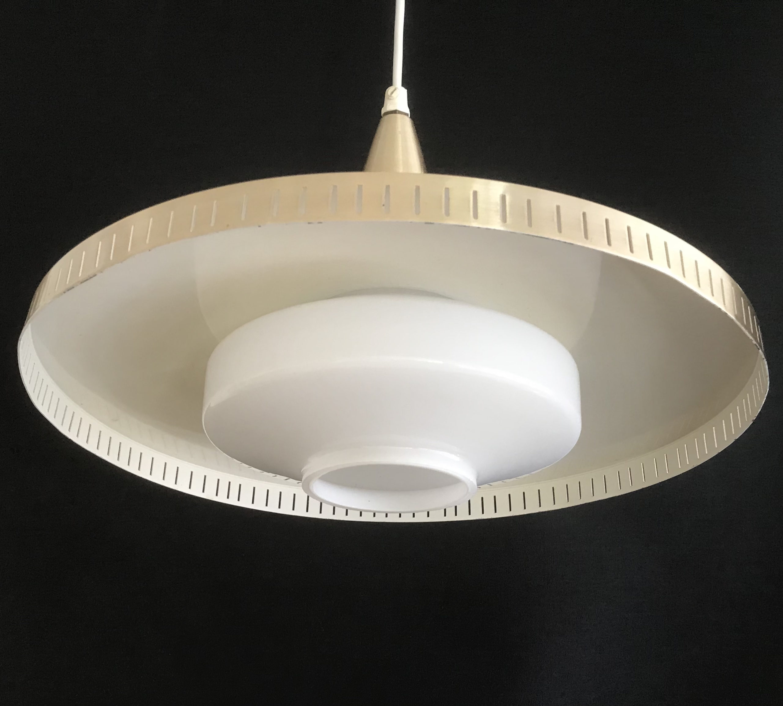 Lampe i metal/messing og opalglas. Fremstår med brugsspor fx. Lidt malerstænk som kan fjernes. se billeder. Dia: 50 cm