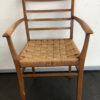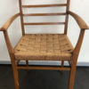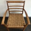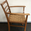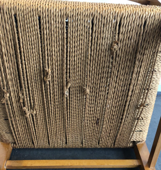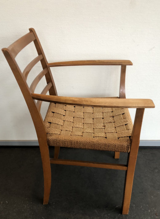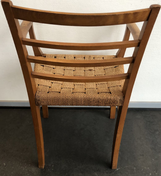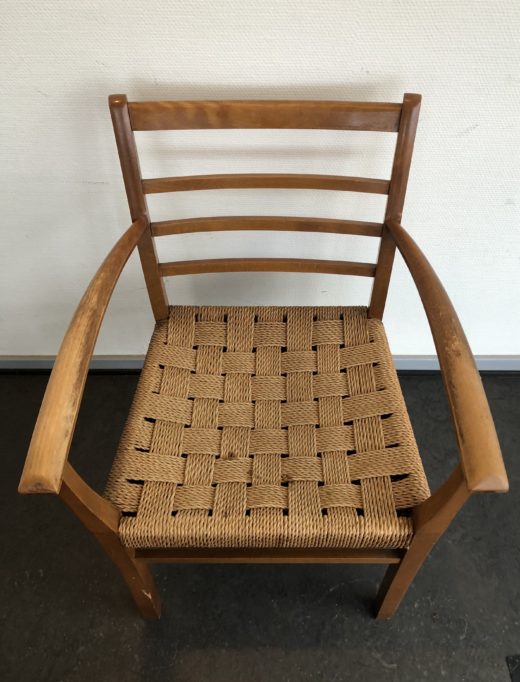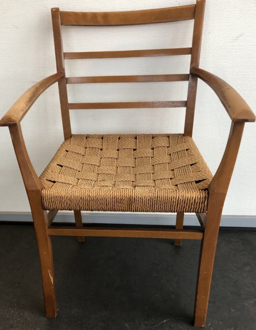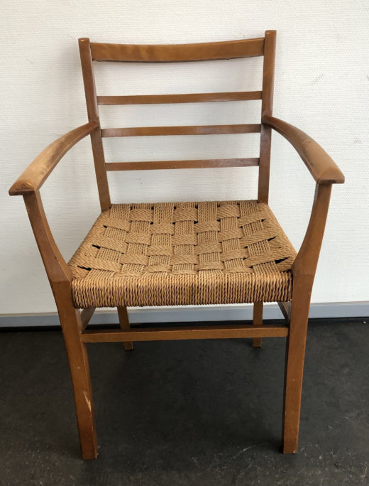 Fremstår med brugsspor, herunder hak i stoleben, slid på armlæn samt et par pletter på sæde.
