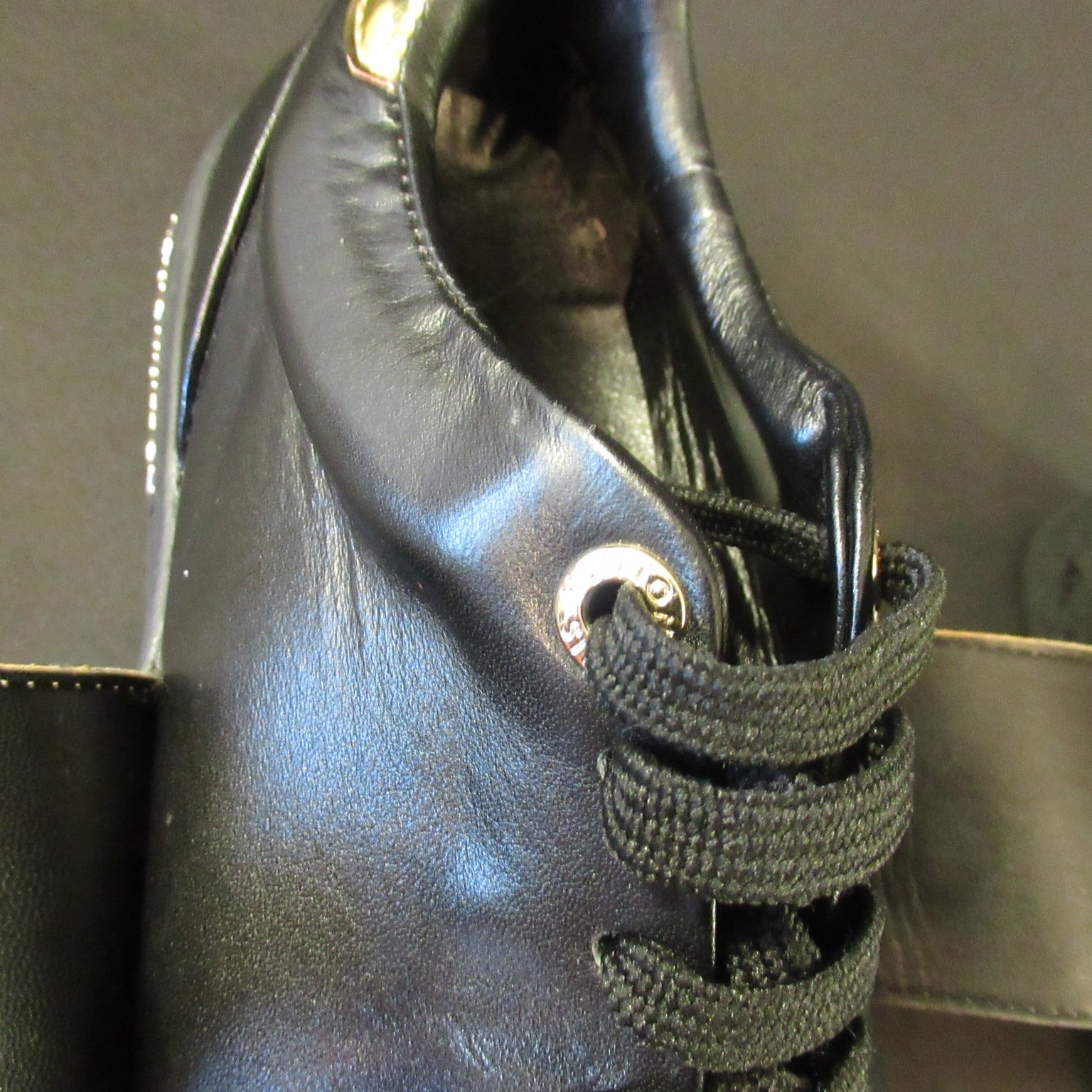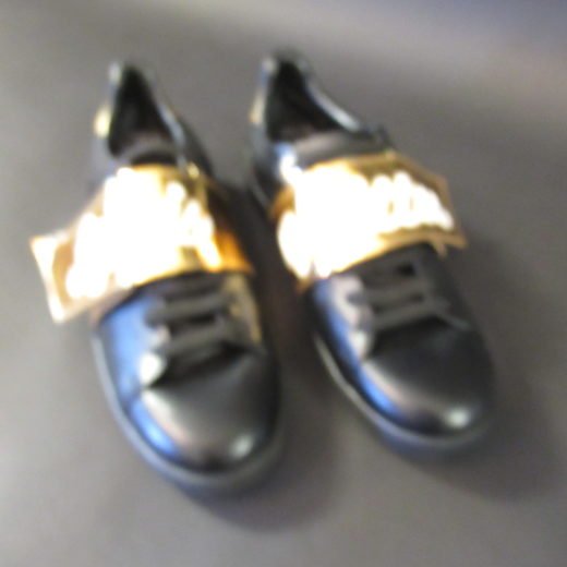 Sneaker str 40, sort læder, snørebånd og guld velcrolukning.