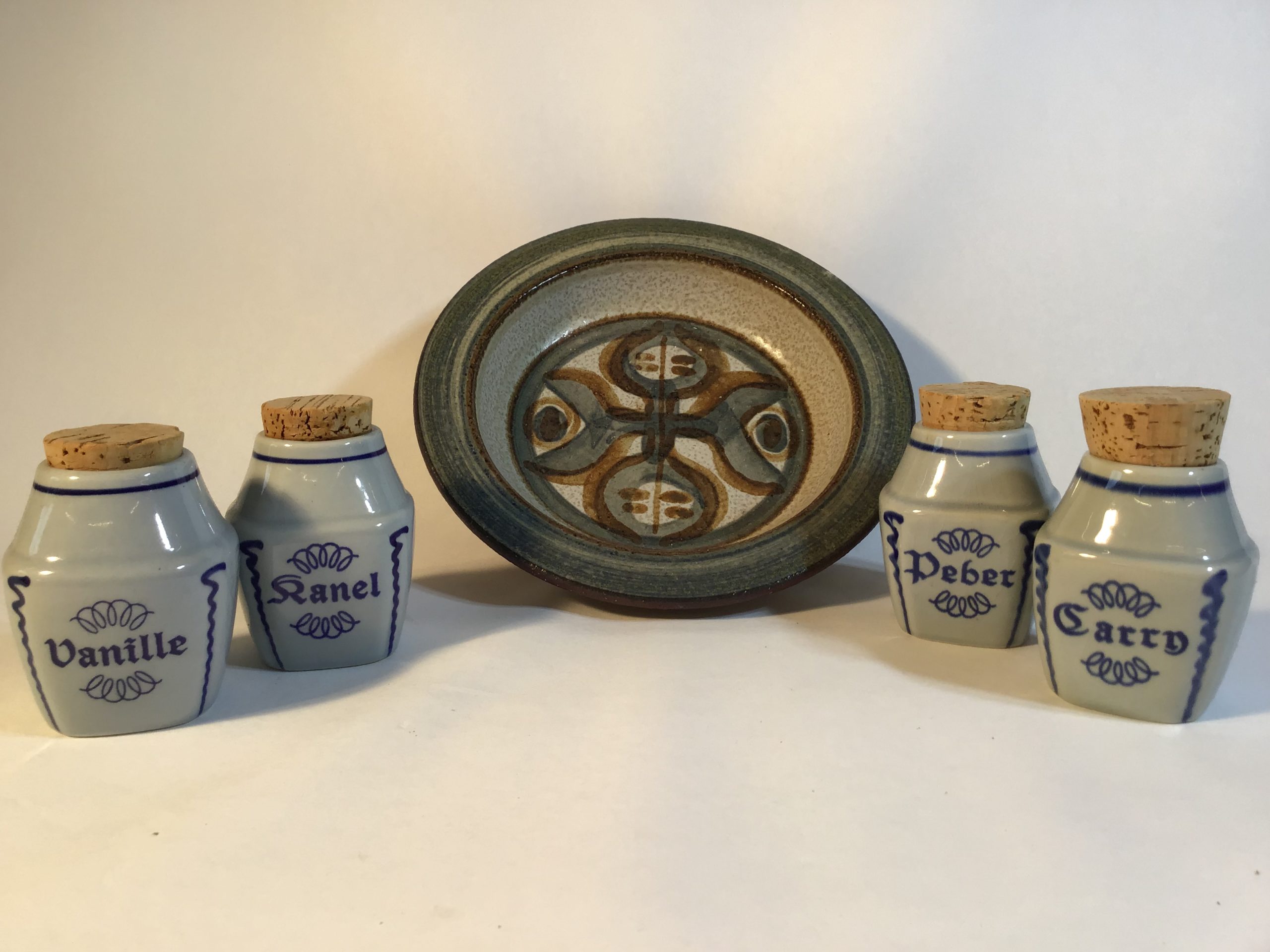 Fad H: 4,5 cm. Ø: 22,5 cm., krukker H: 8,5 cm.