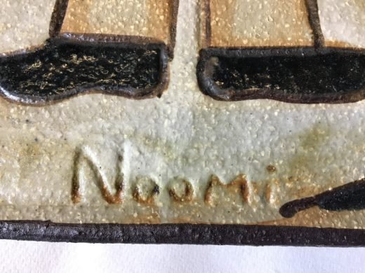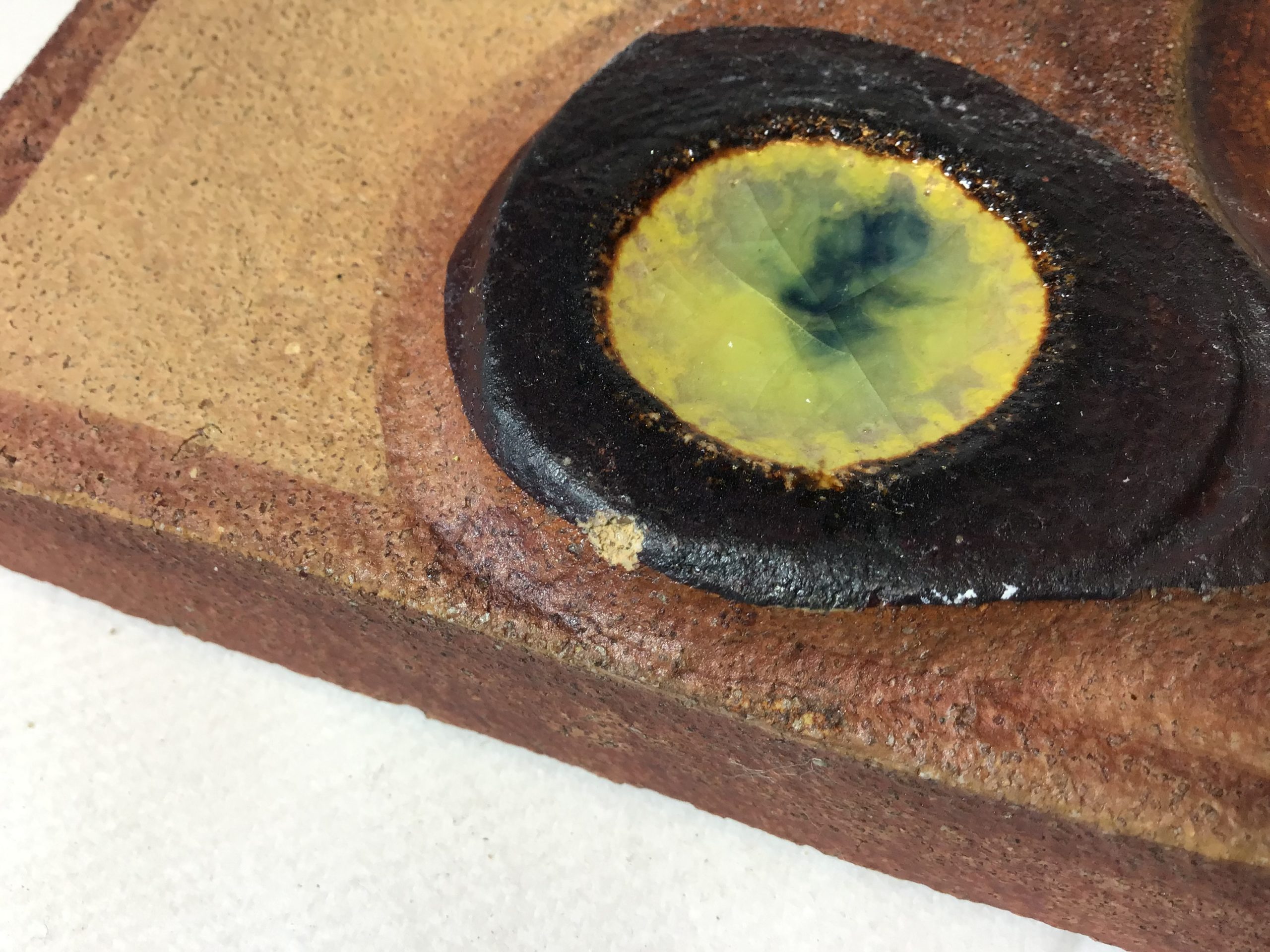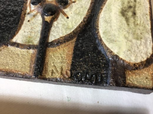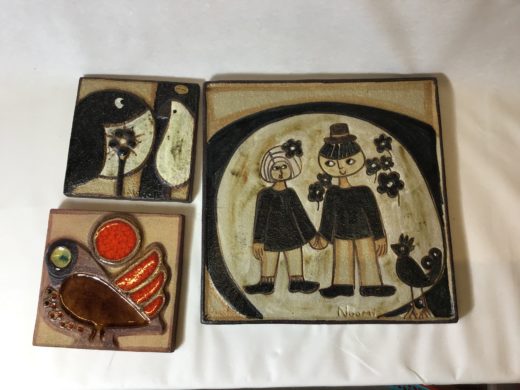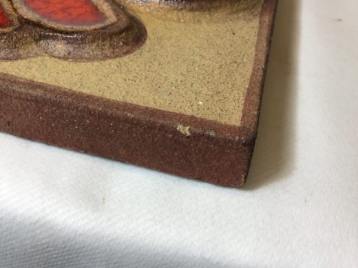 Lidt afslag i det relief med rød glasur. Brændings revne i det store relief, se billeder. Små: 18 x18 cm., stort: 33,5 x 34 cm.