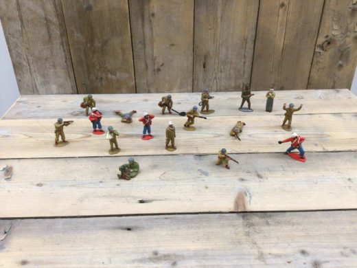 17 små legetøjsfigurer der forestiller soldater i forskellige positioner.