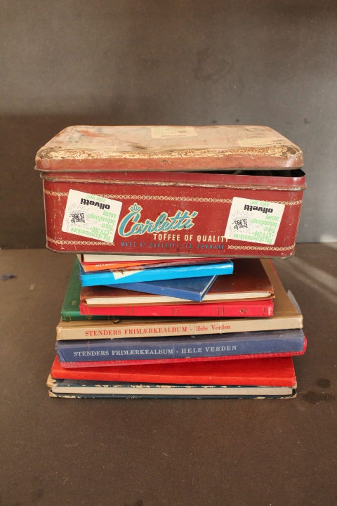 Masser af frimærker i album + en gammel metalkasse med løse