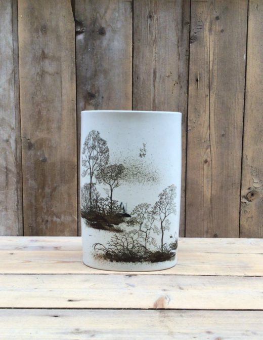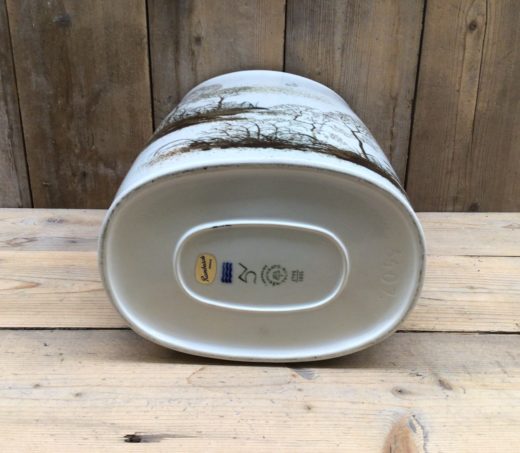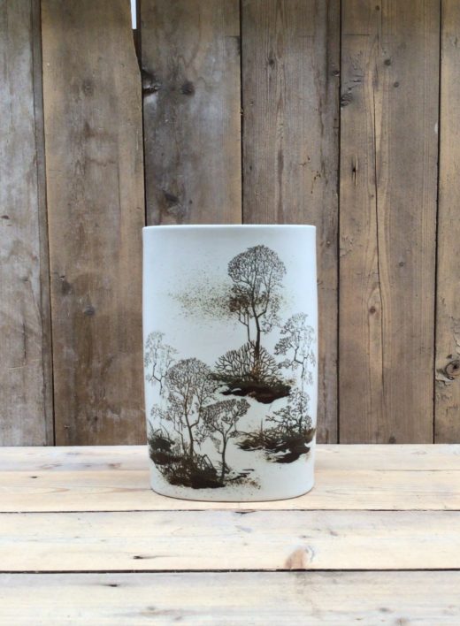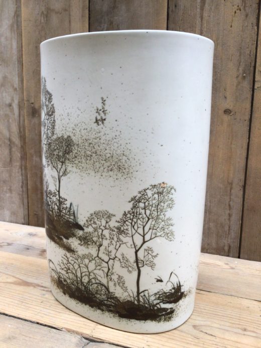Stor oval fajance-vase i klassisk design fra Royal Copenhagen. Træsilhuetter på hvid baggrund.