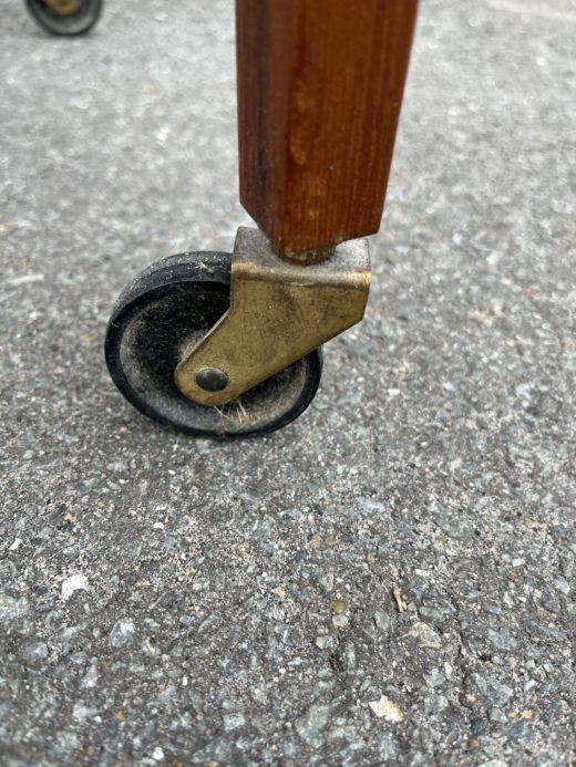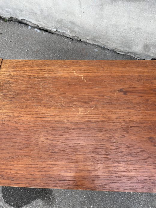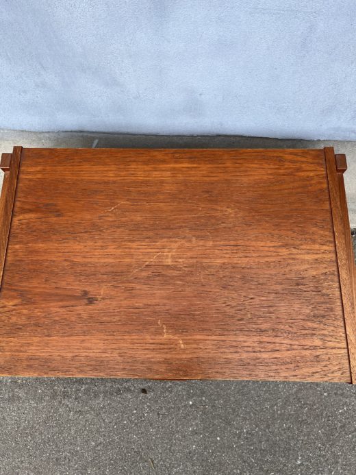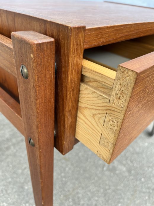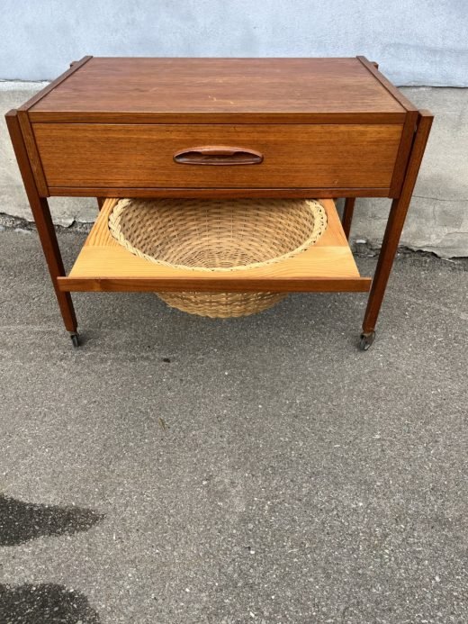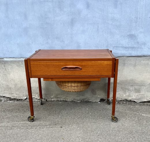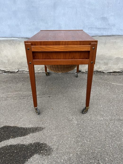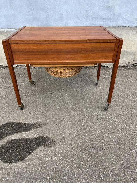 Sybord i teak/finer med skuffe med rum og fletkurv. 66×41,5×55 cm.