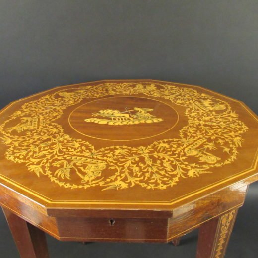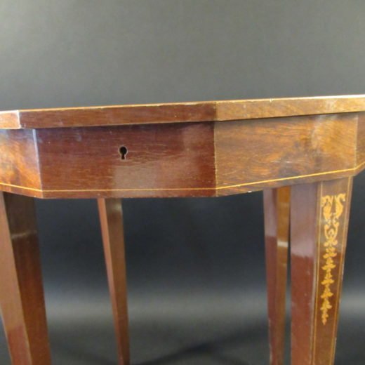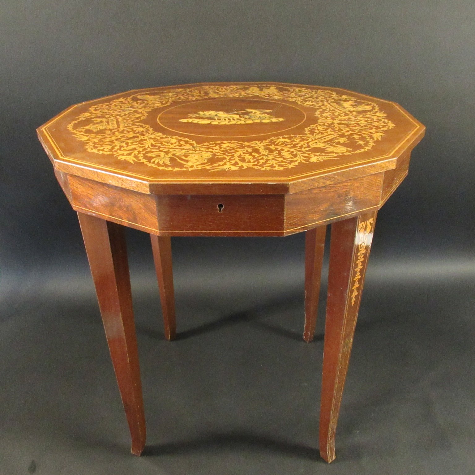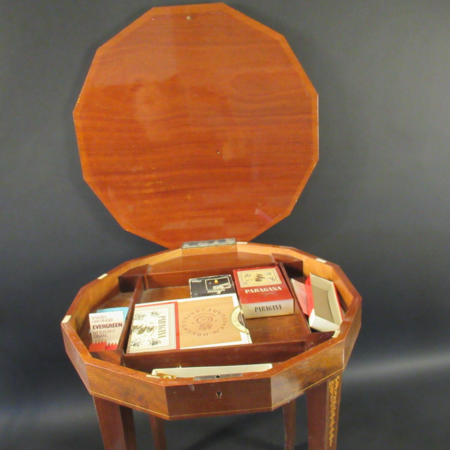 Tobaksbord, med indlæg af lysere træ på låg og benene, der spilles musik når låget åbnes, under bordet findes musikoptrækkeren.